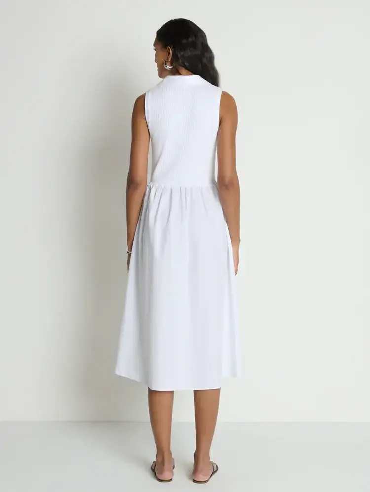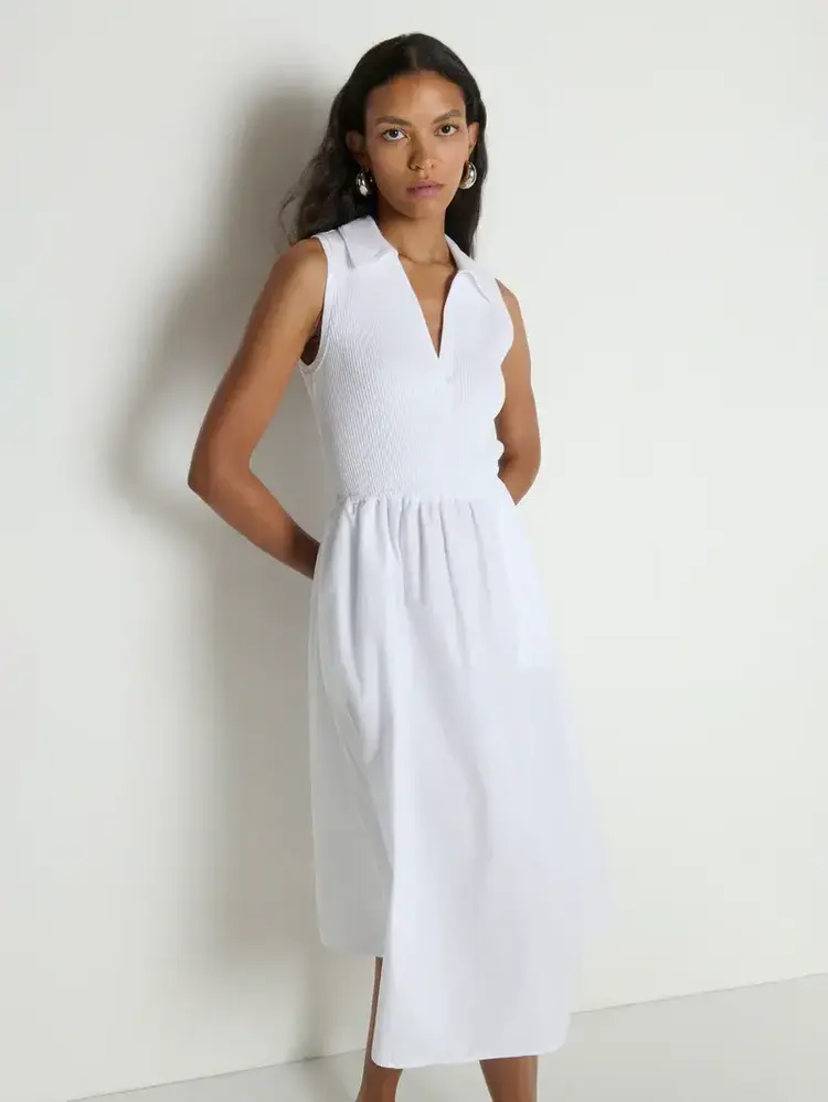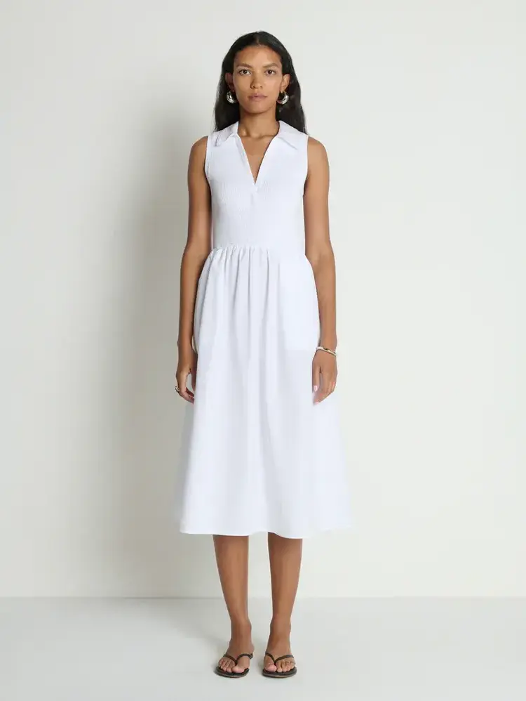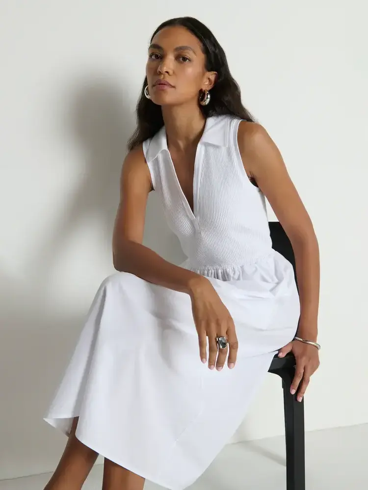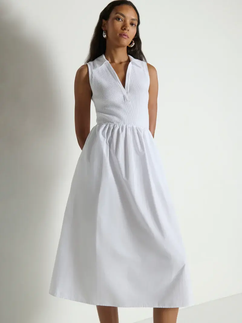 • A new favorite. The Jessica Midi Dress is sleeveless with a soft V-neck, slightly fitted through the top and flowing into a relaxed skirt. Designed with a ribbed cotton bodice and a poplin skirt, it’s finished with pockets for everyday ease.