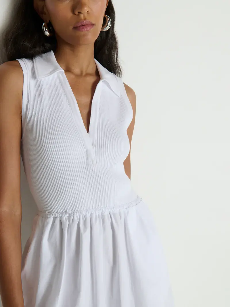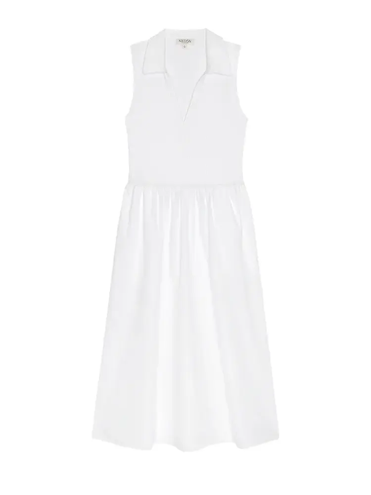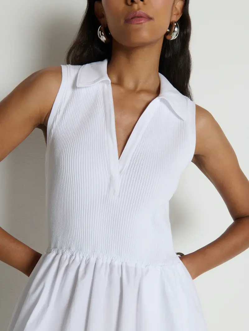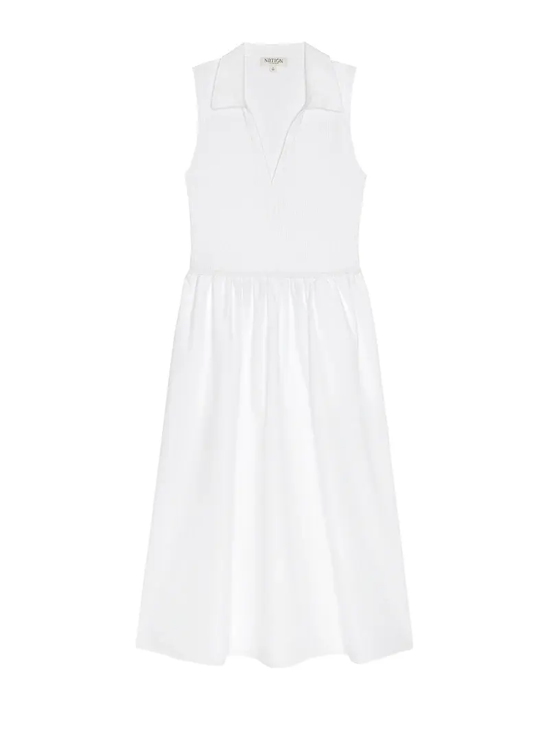 • A new favorite. The Jessica Midi Dress is sleeveless with a soft V-neck, slightly fitted through the top and flowing into a relaxed skirt. Designed with a ribbed cotton bodice and a poplin skirt, it’s finished with pockets for everyday ease.