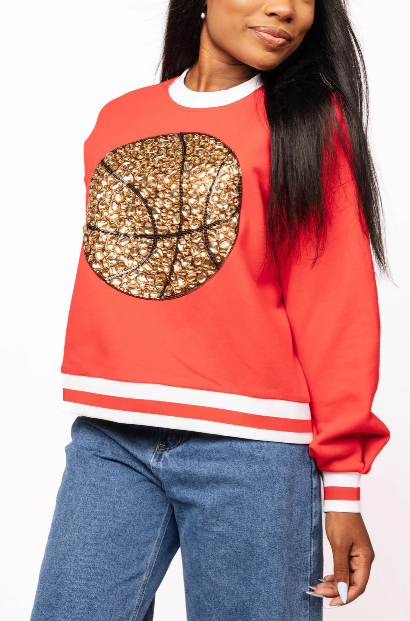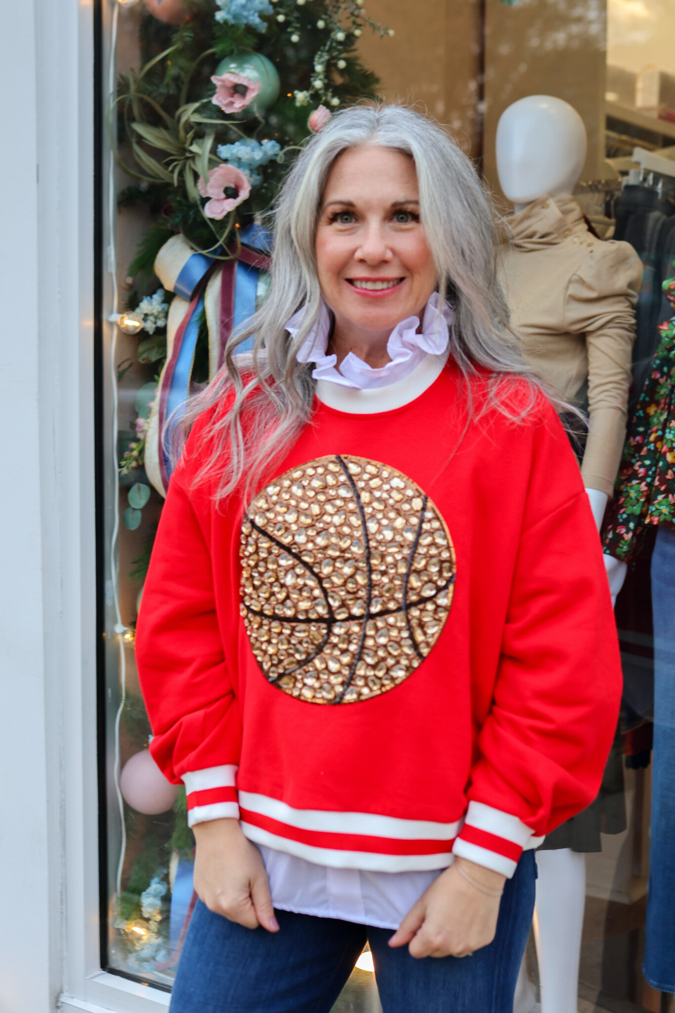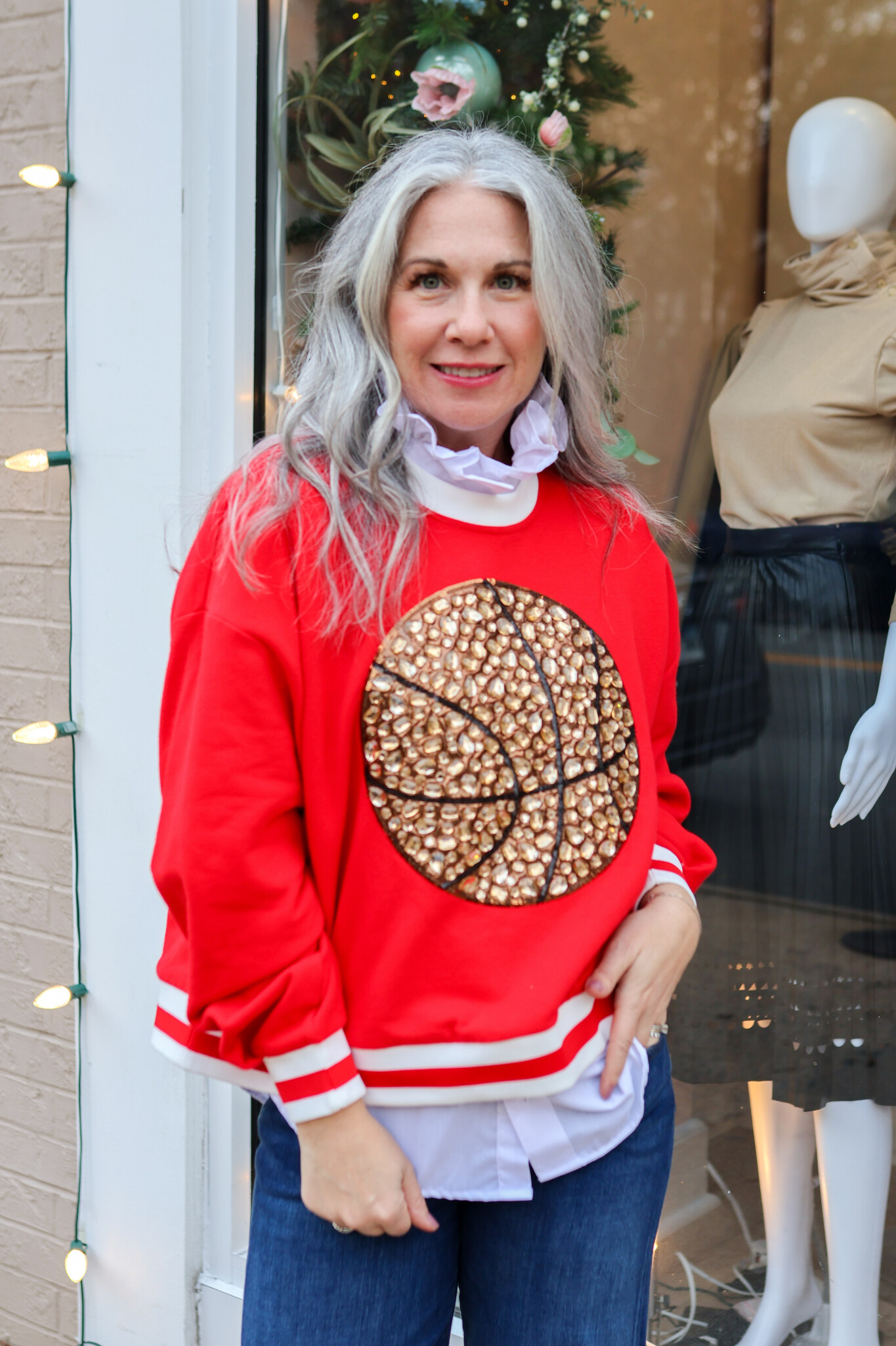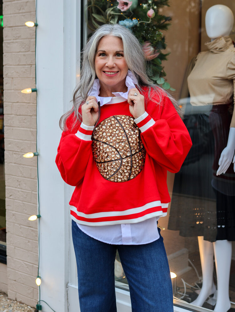 • Shoot for style in this vibrant red sweatshirt, complete with a dazzling jeweled basketball design that's sure to turn heads. Perfect for game day or casual wear, this piece combines comfort with eye-catching sparkle.