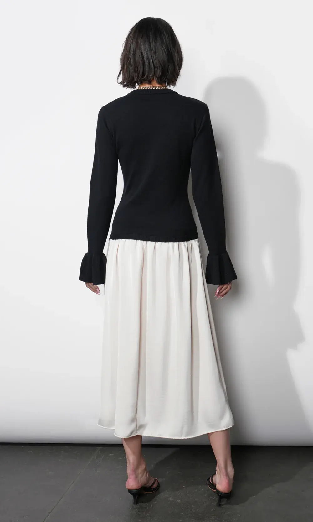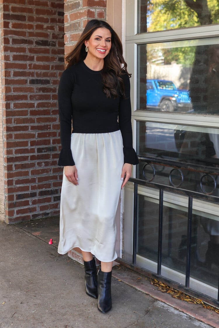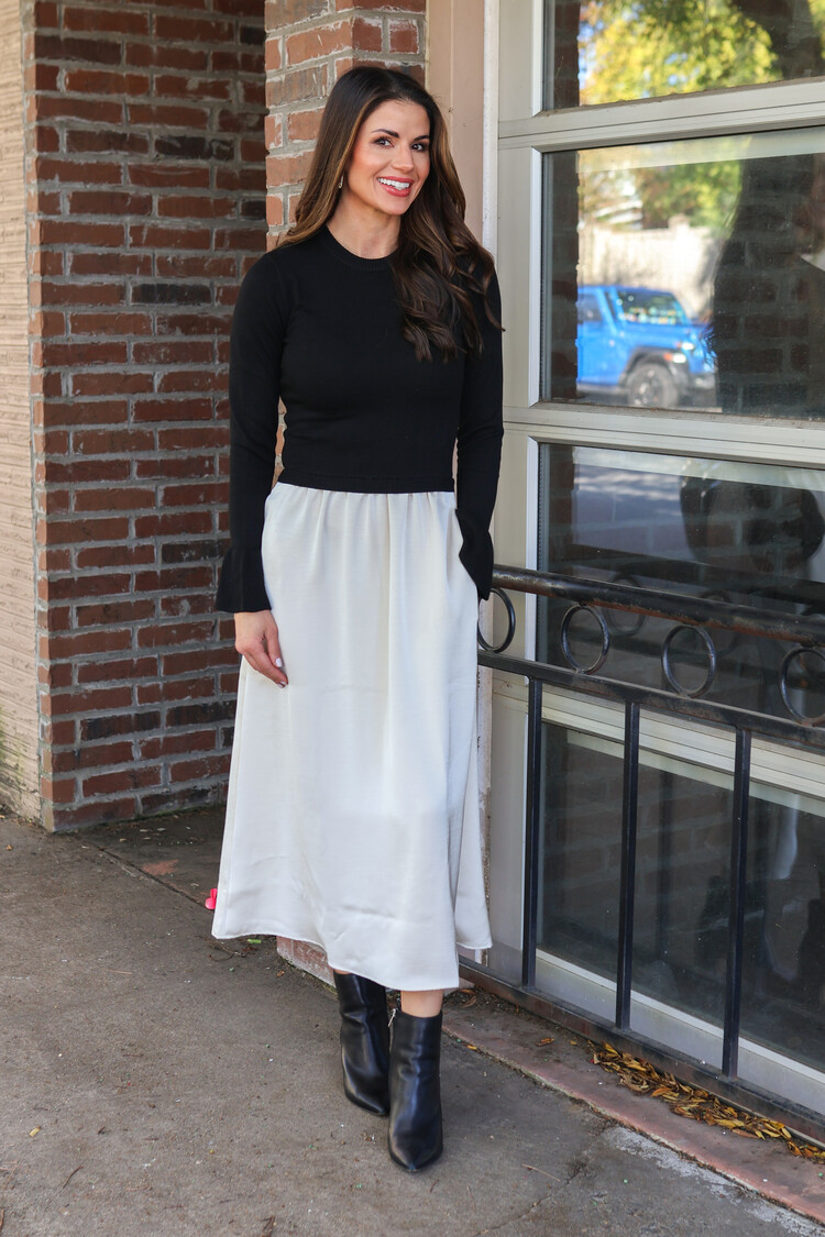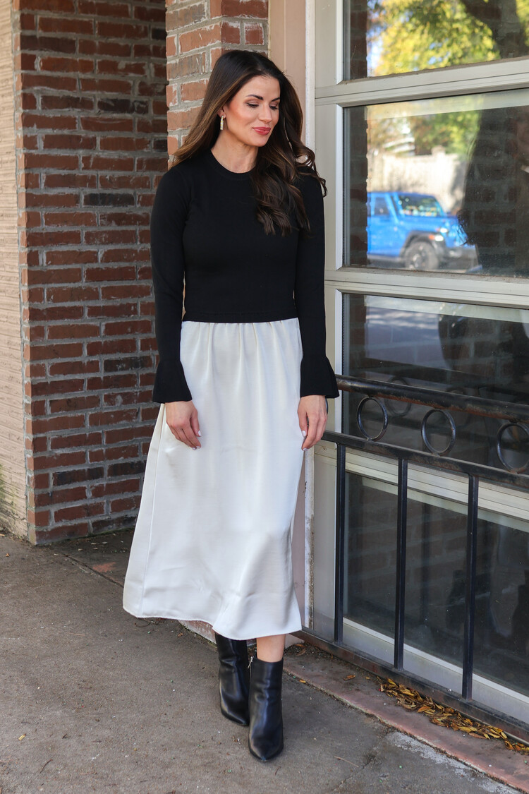 • The soft knit sweater top contrasts beautifully with the flowy midi skirt, creating a polished and modern look. A balance of comfort and sophistication, this dress transitions seamlessly from day to night.