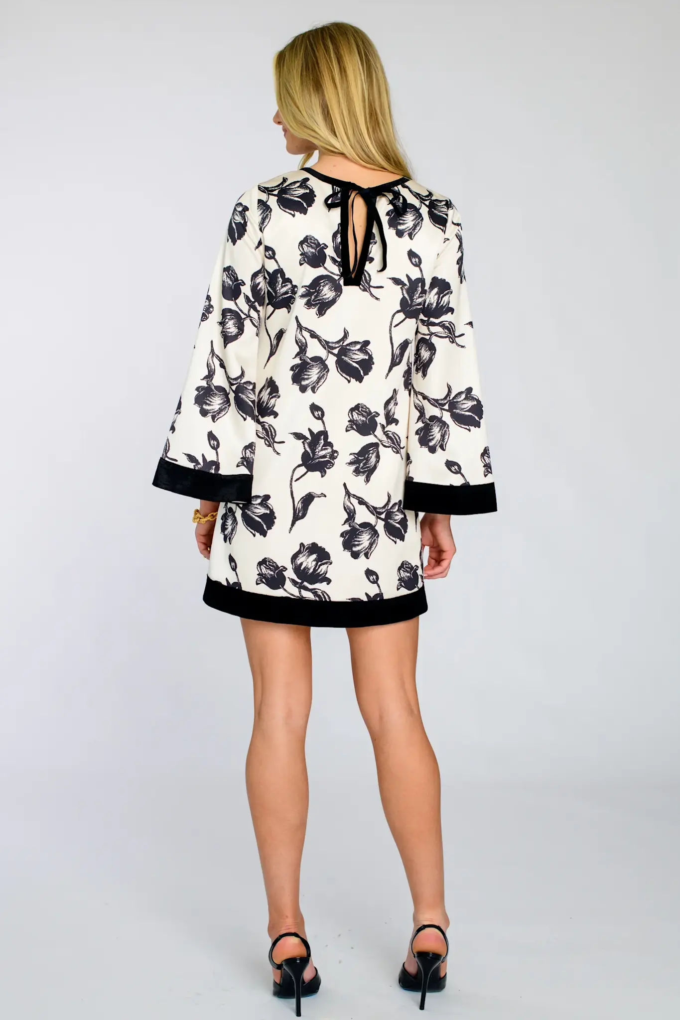 • Juliette is the shift of the season with her bell sleeves and flattering silhouette. We love her in our Snow Tulip print with accents of black velvet trim.