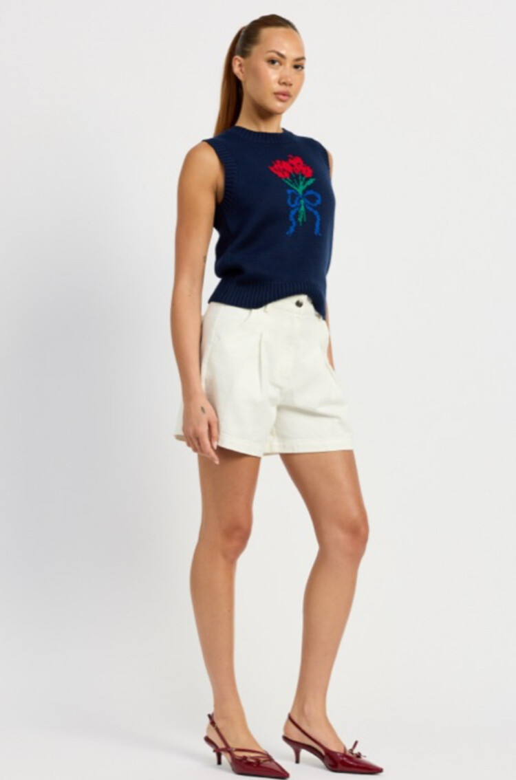 Meet Lune: a mixed-media top designed to look like your favorite crisp poplin shirt layered under a classic v neck. With a v-neckline, boxy fit, and poplin-capped sleeves, it’s made for effortless styling. Pair it with the Chantal Skirt for a flirty twist