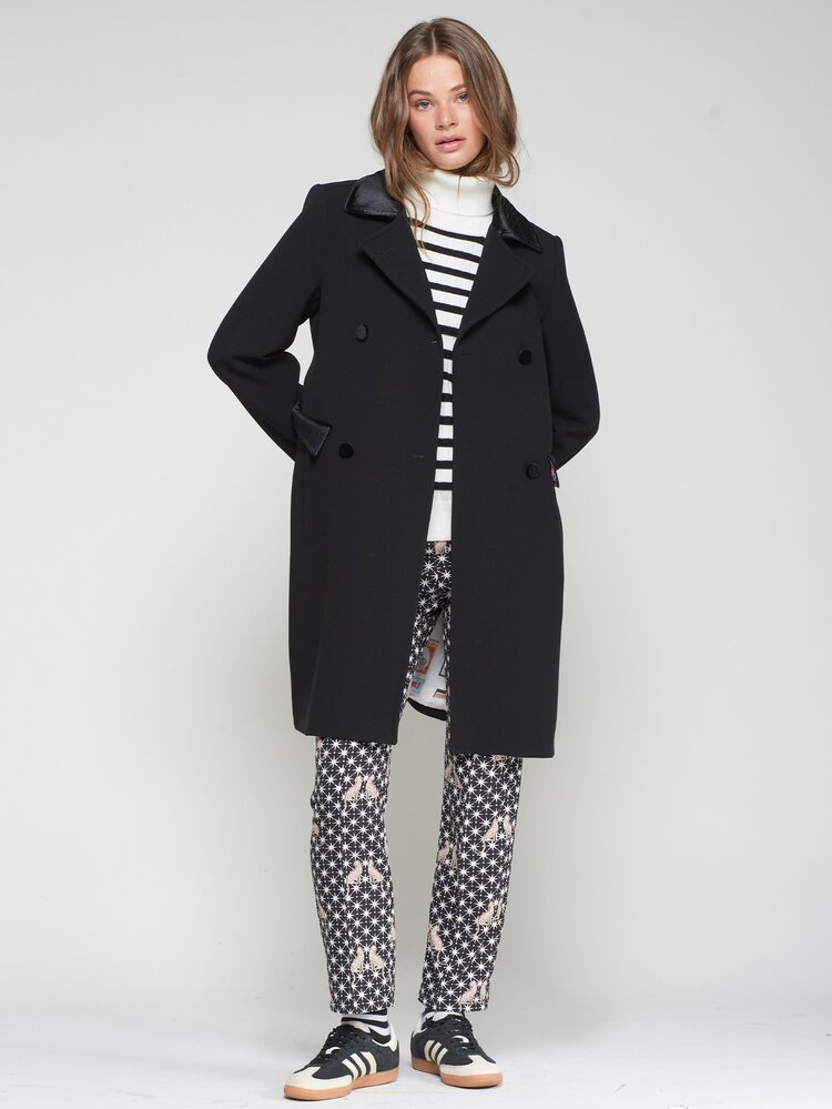 • Straight-cut black coat with front double-breasted closure and wide velvet lapel in matching tone. Back strap and flap pockets also feature velvet contrast. The interior is finished with a printed lining. Covered buttons complete the refined structure.