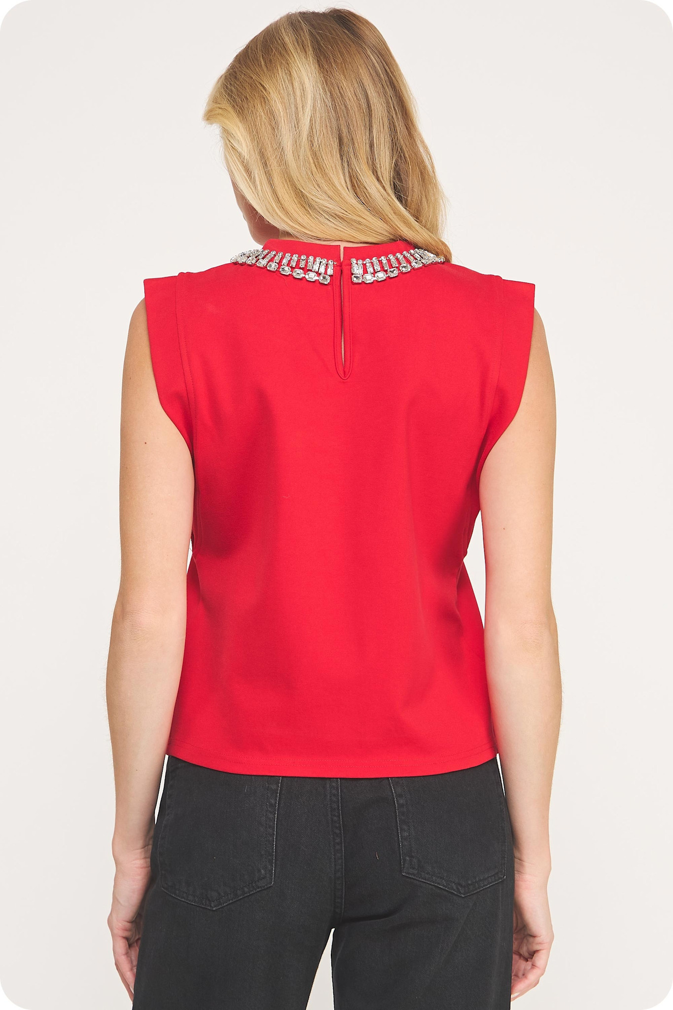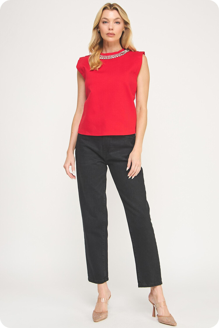 Embellished muscle tee top in stretch knit fabric. This style features a round ribbed neck with crystal embellishment and a relaxed fit. The perfect versatile top to add bling to your holiday season.