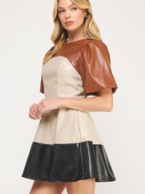 Puff short sleeve tiered mini dress in faux leather fabric. This style features shirred shoulders, short puff sleeve, round neck, cinched waist, side pockets, tiered mini skirt, and hidden zipper closure.