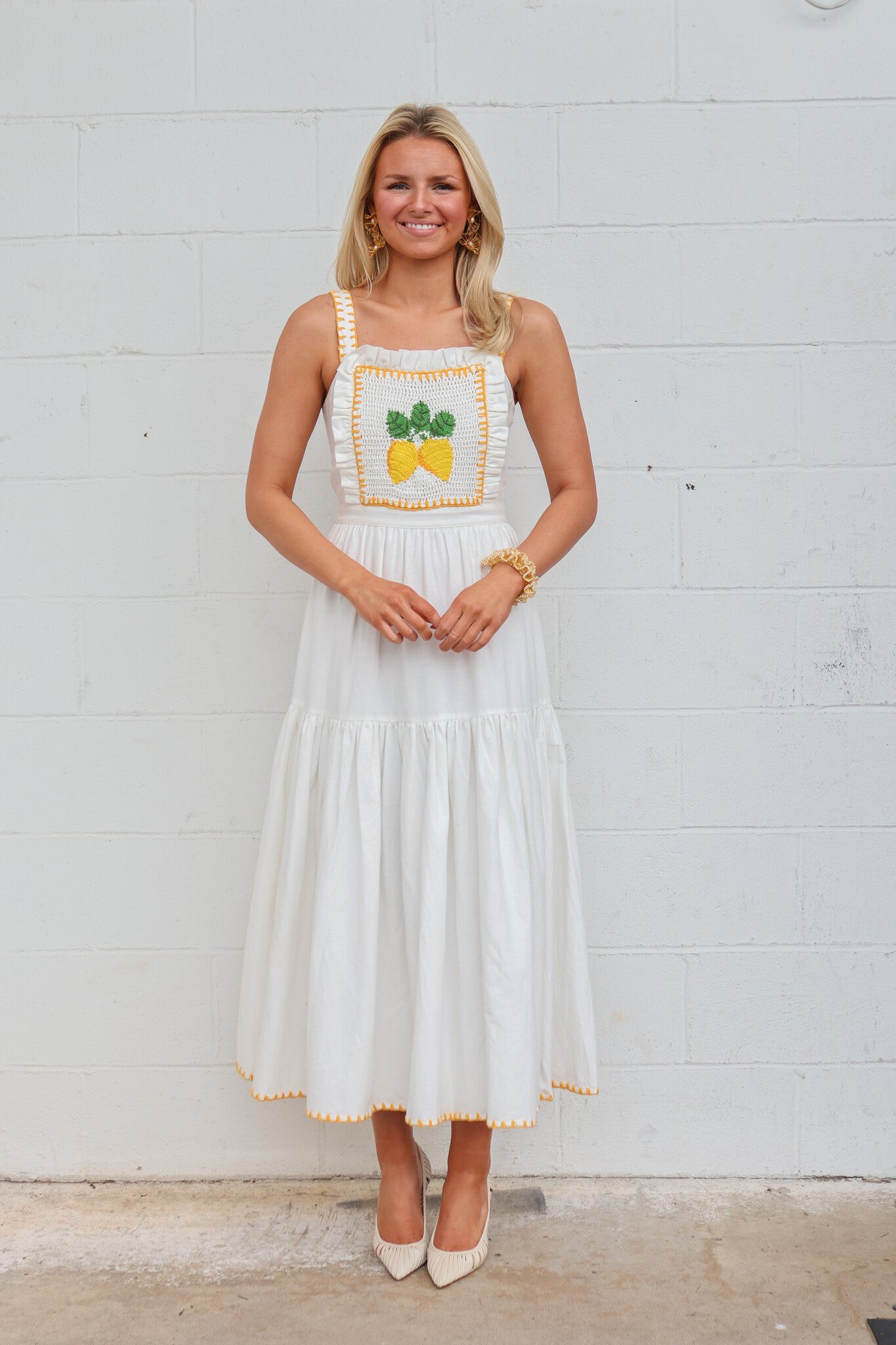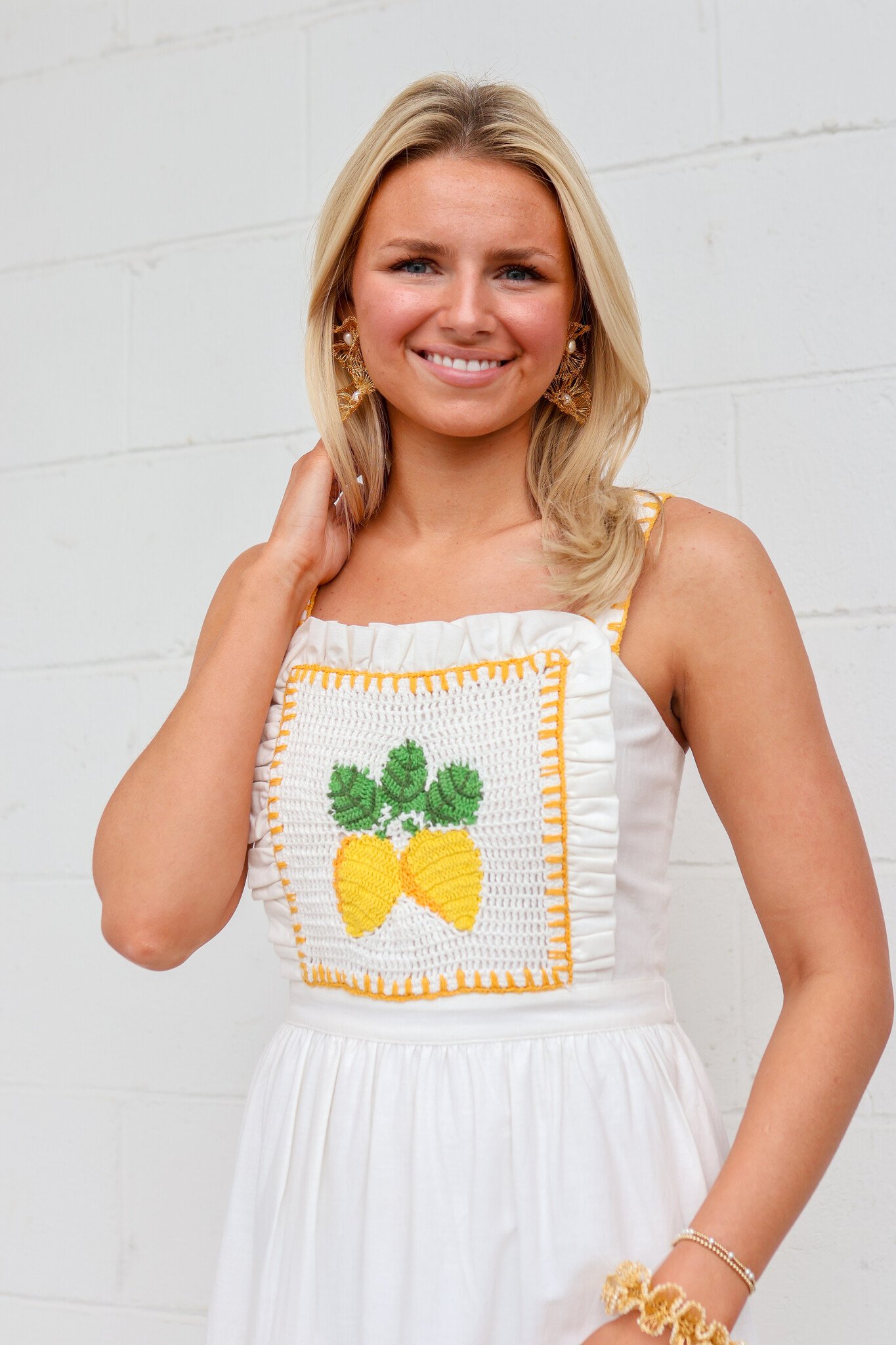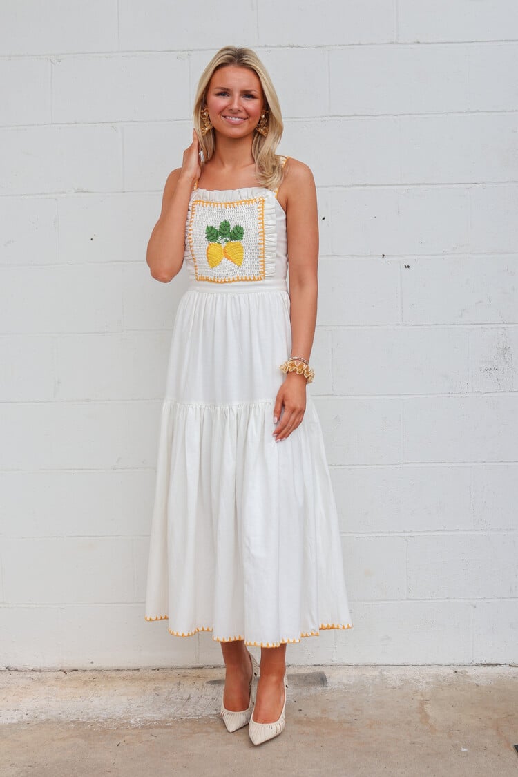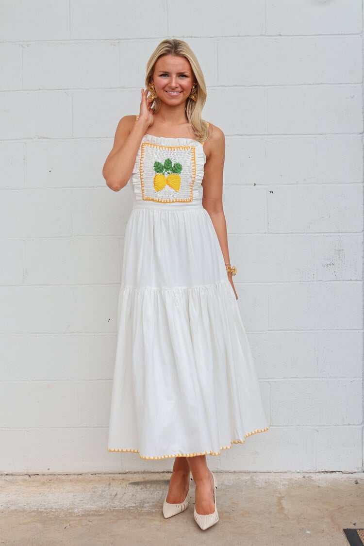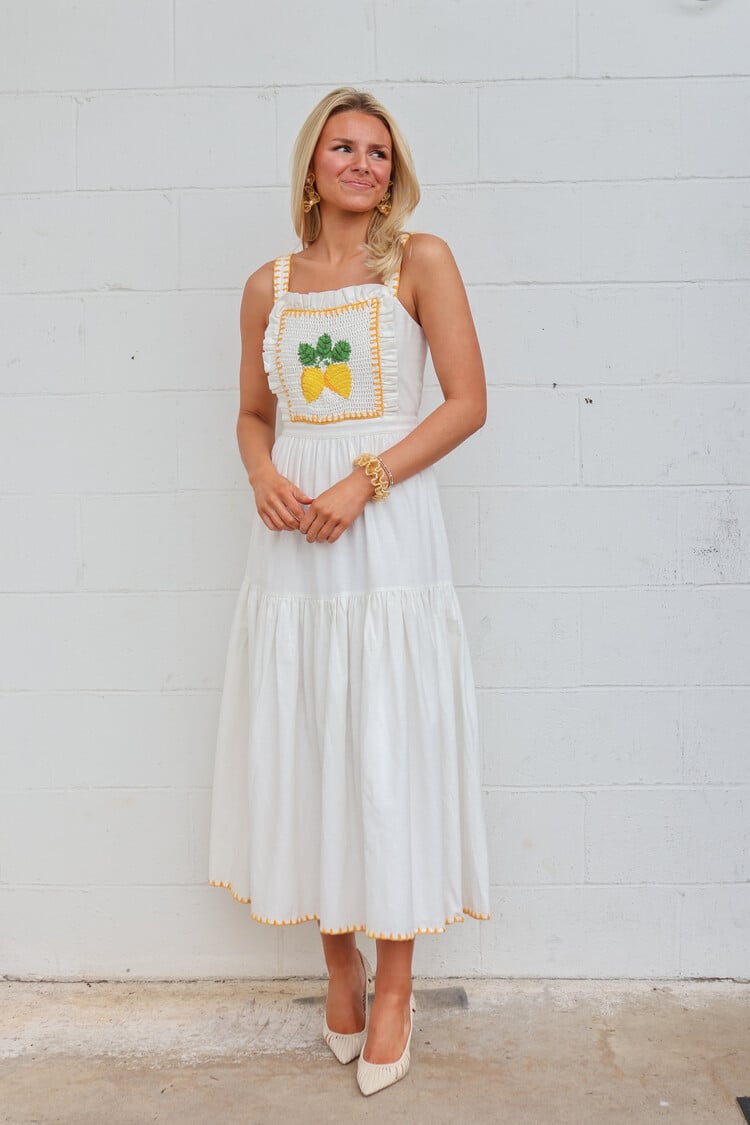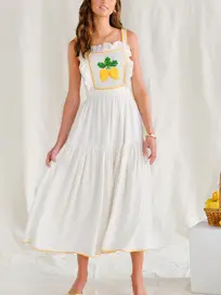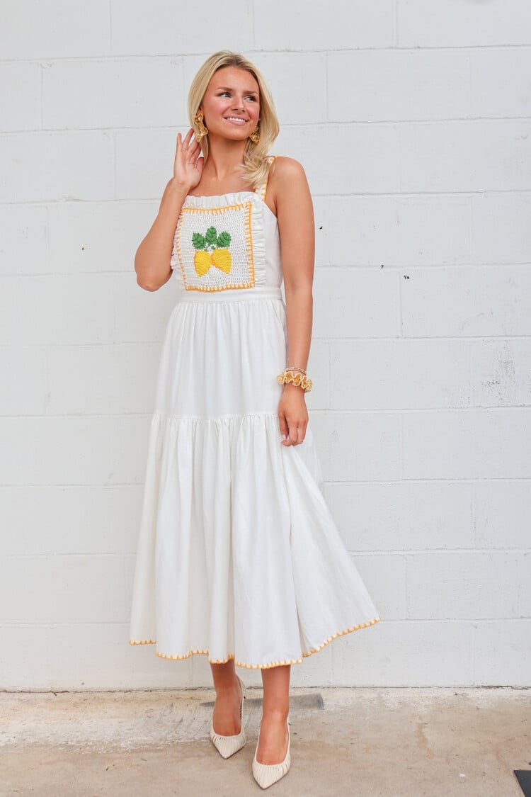 • When life gives you lemons.. The apron style dress has ruffle details, a crochet lemon panel on the front bodice, and flowing white skirt. Pair Kathy with sandals and a basket bag for a refreshing look.