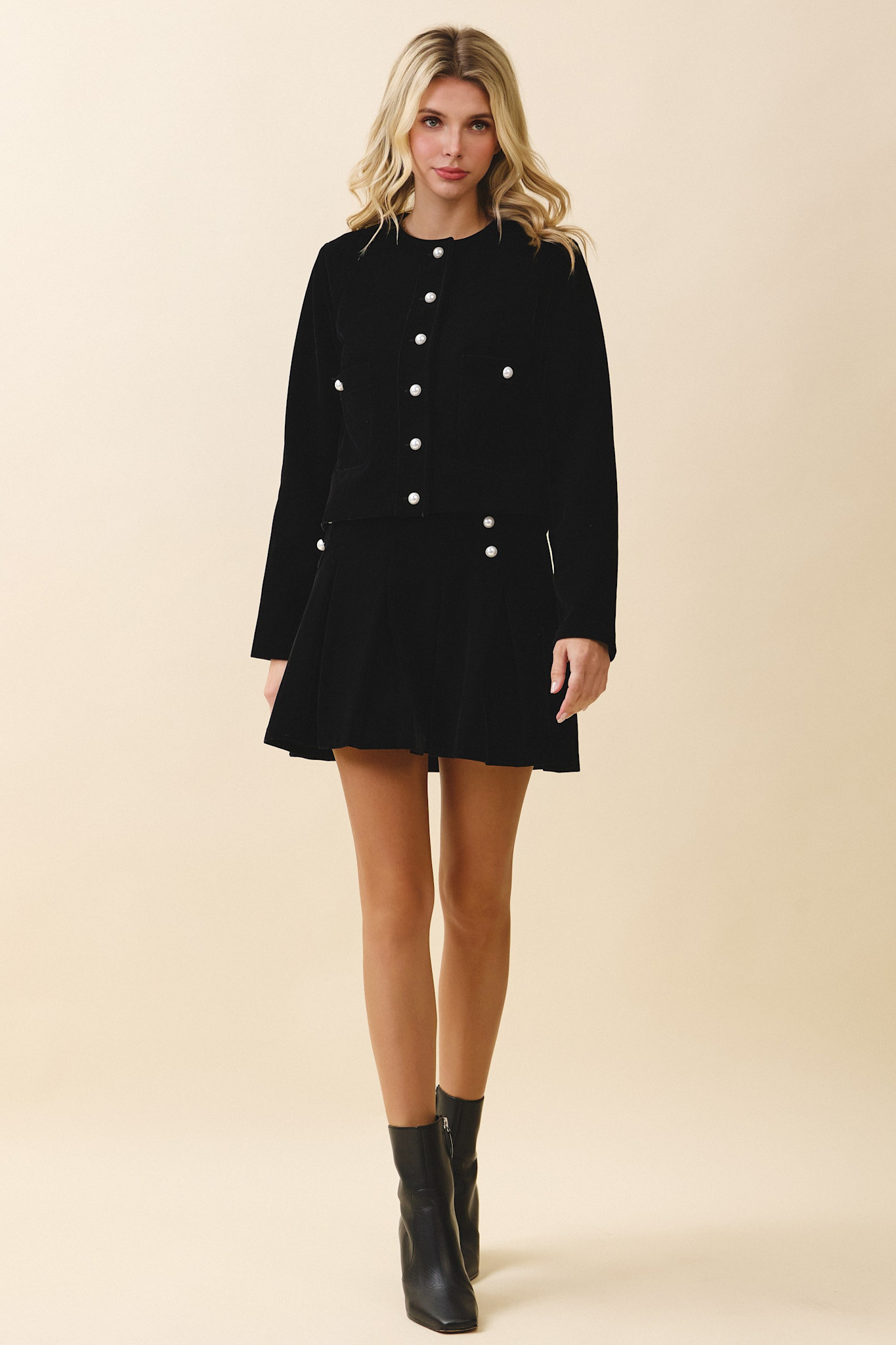 • A velvet mini skirt featuring a pleated design and pearl button embellishments along the front waist. Designed with a fitted high-rise silhouette and side hidden zipper closures. 51% Nylon, 49% Polyester