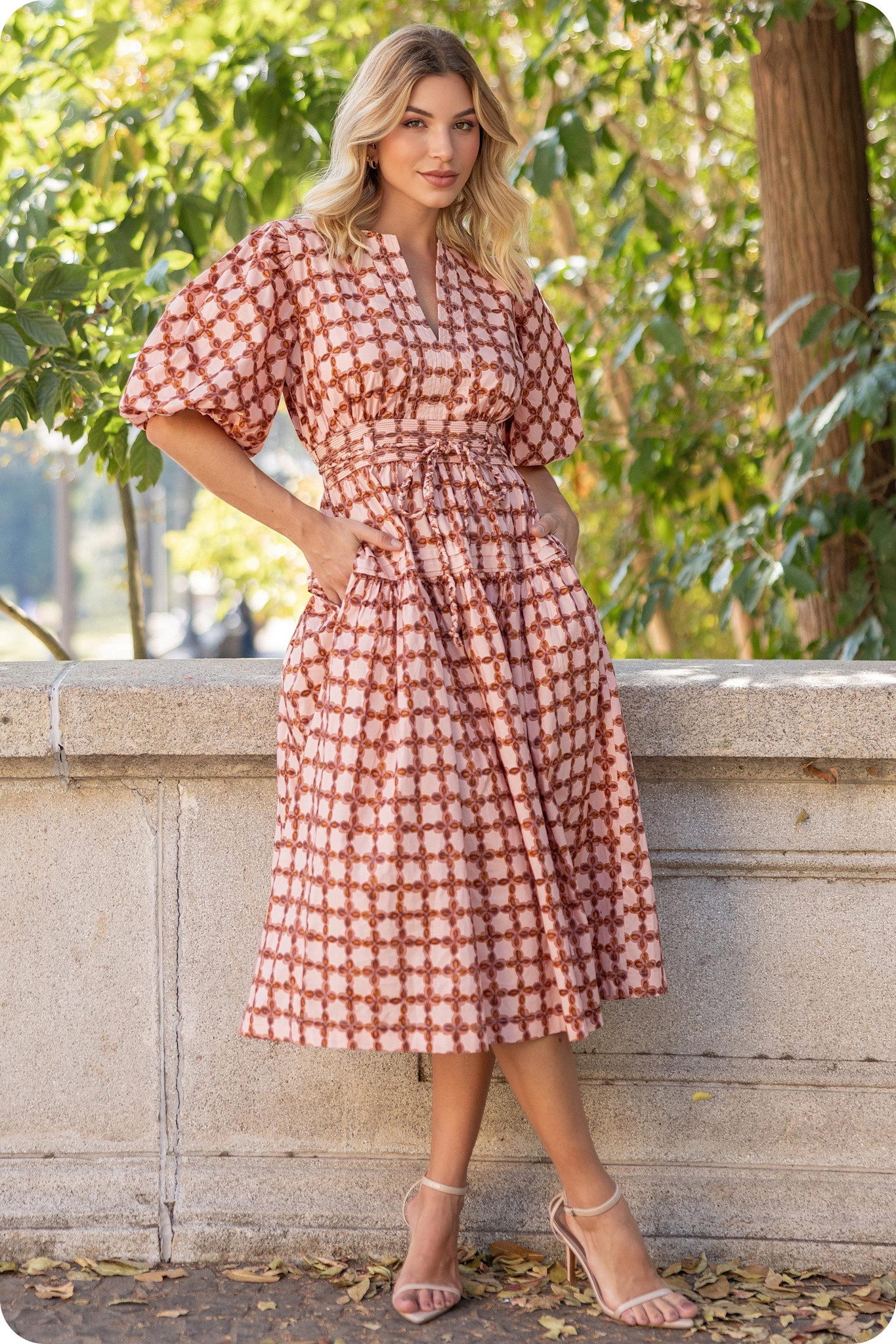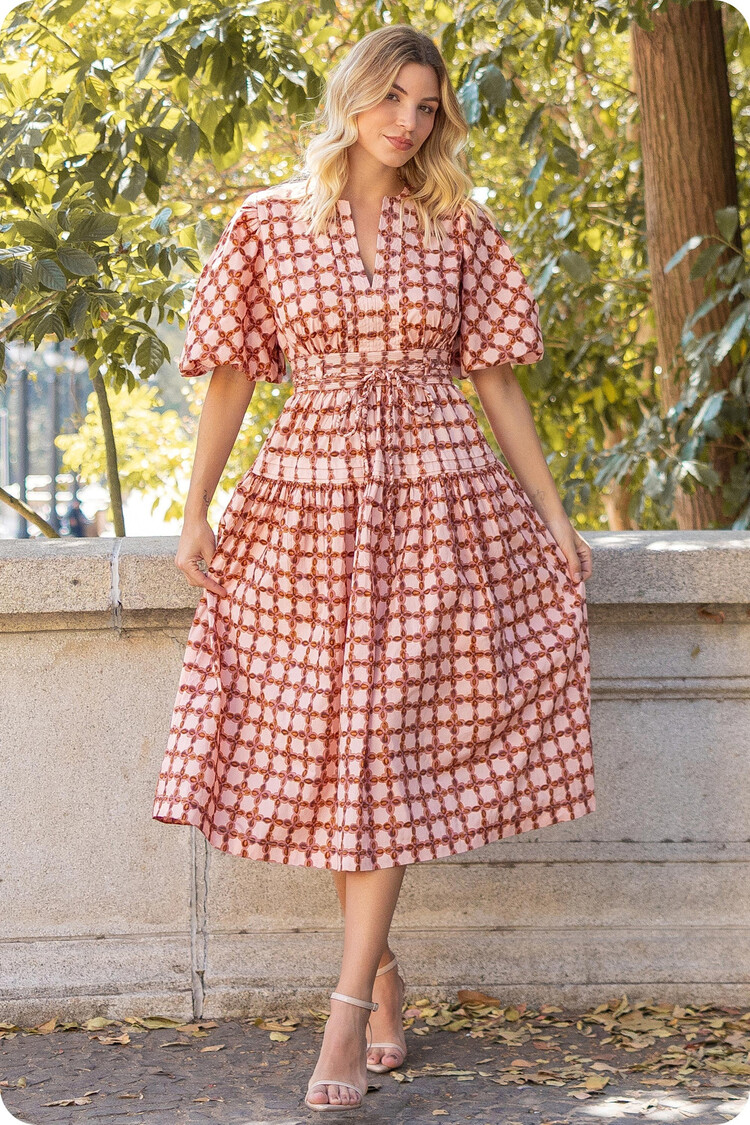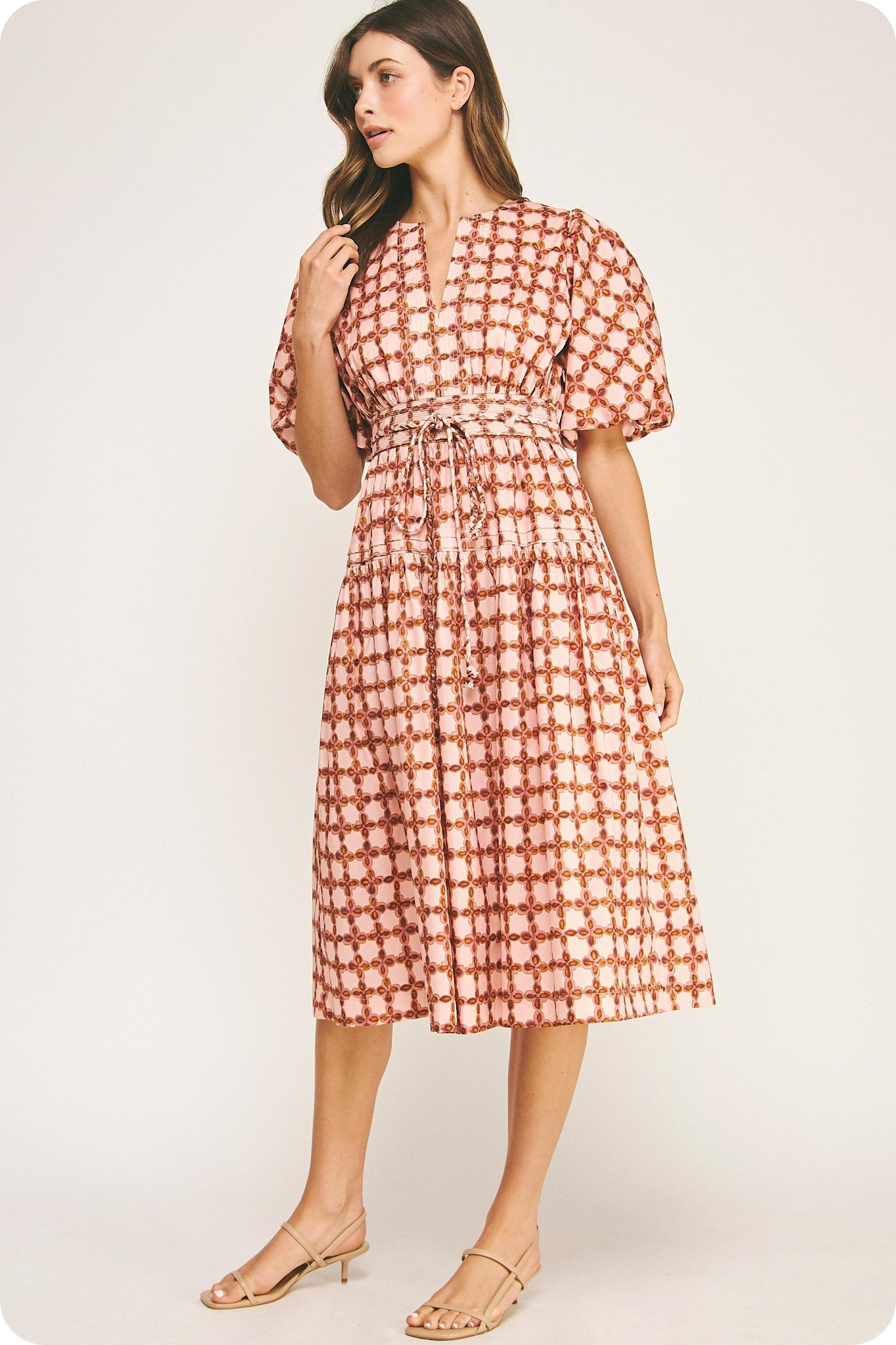 • Puff short sleeve midi dress in an exclusive flower chainlink checkered print. This long dress features puff short sleeve, side pockets, midi skirt, side zipper closure, a removable waist tie, and cinched banded waist with stretch smock at back.