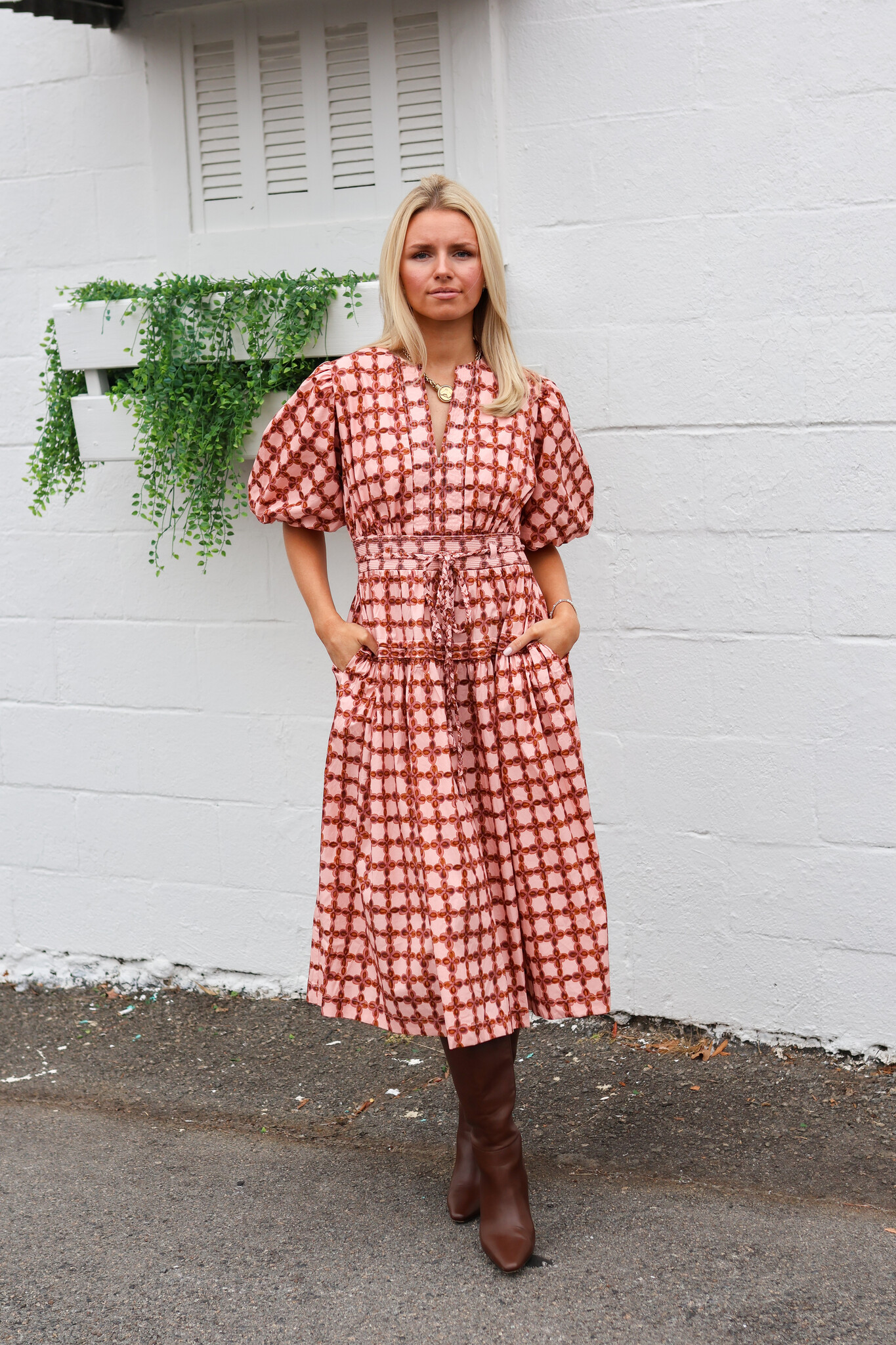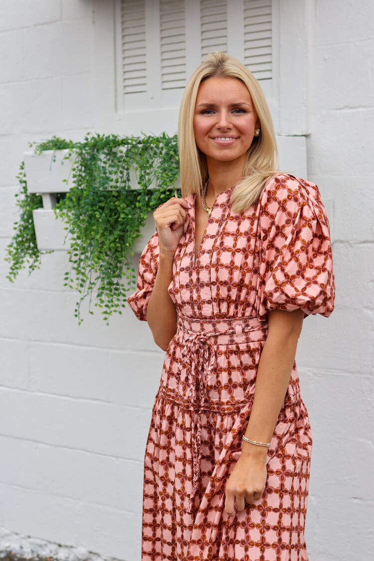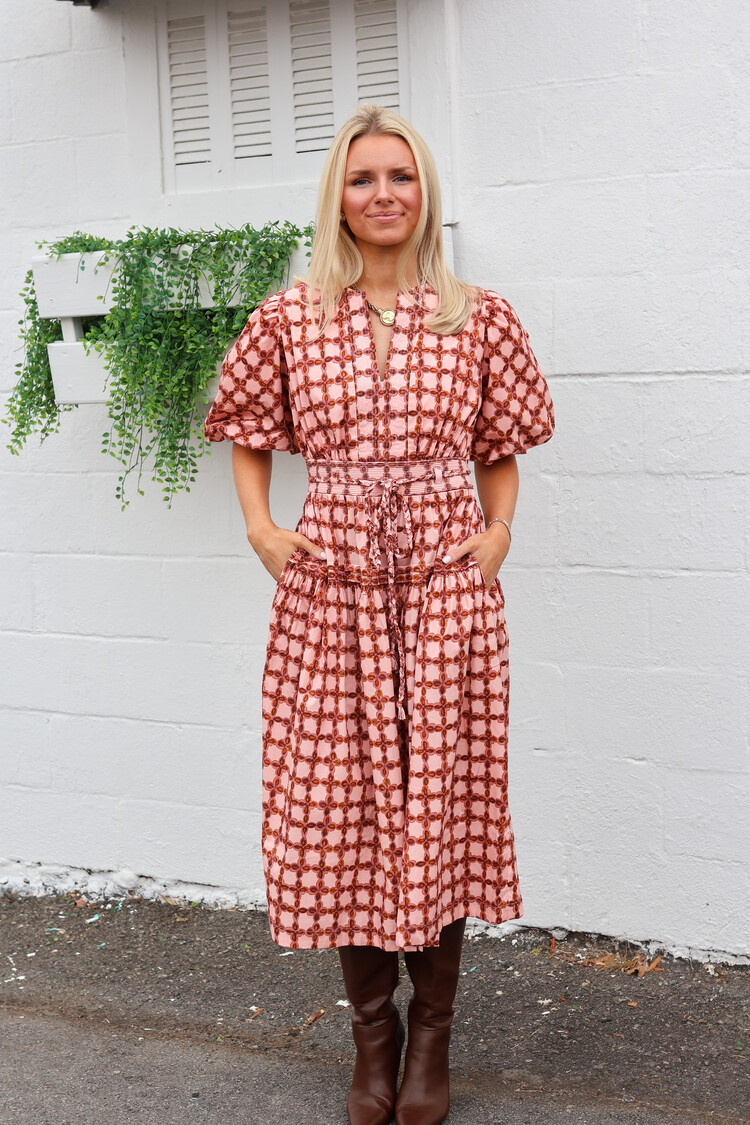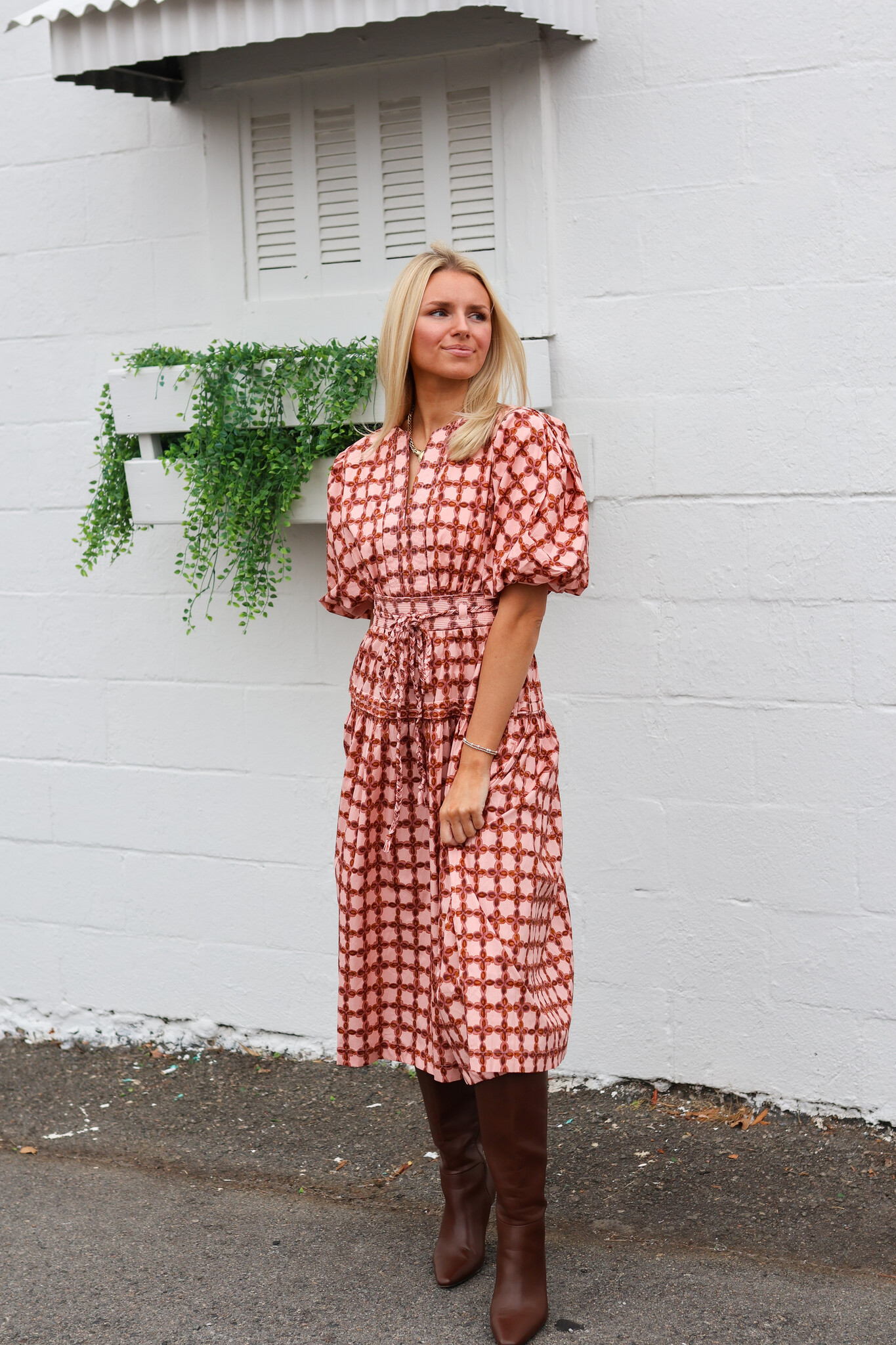 • Puff short sleeve midi dress in an exclusive flower chainlink checkered print. This long dress features puff short sleeve, side pockets, midi skirt, side zipper closure, a removable waist tie, and cinched banded waist with stretch smock at back.