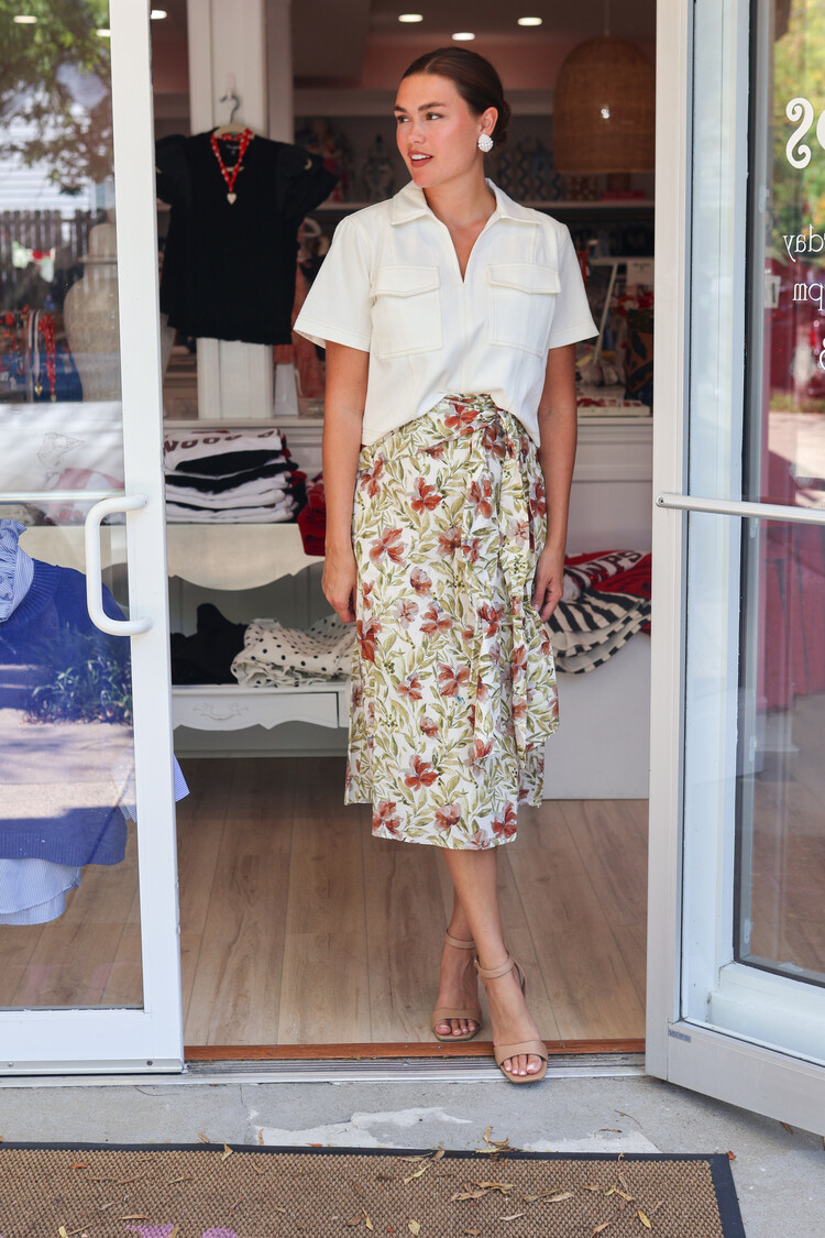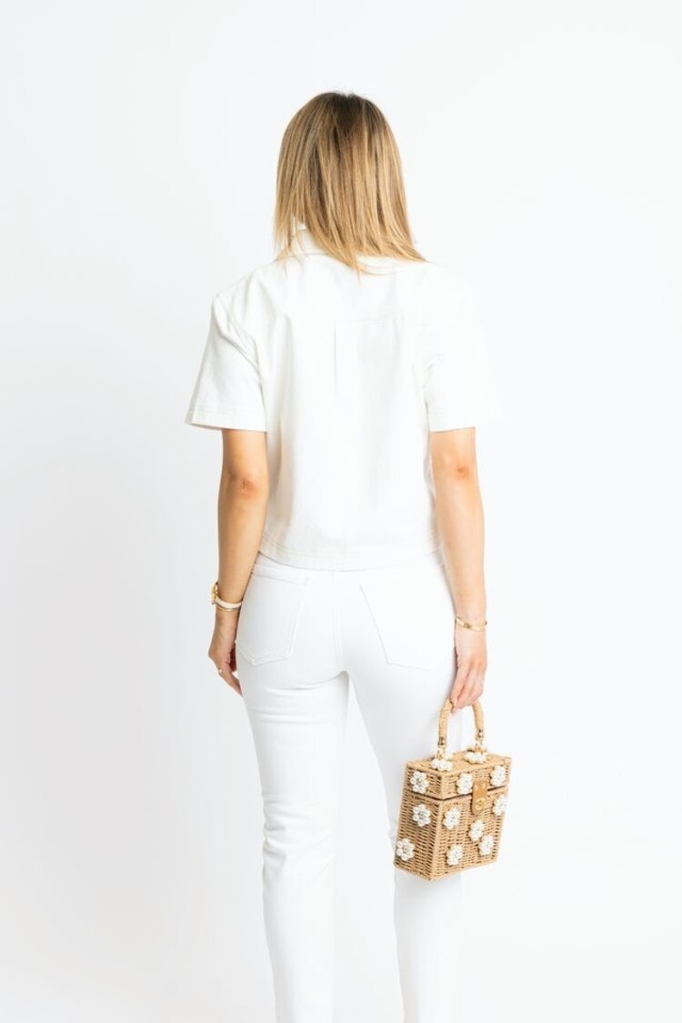 • A cute white denim top with warm stitch detailing. Pair with your favorite jeans or skirts.