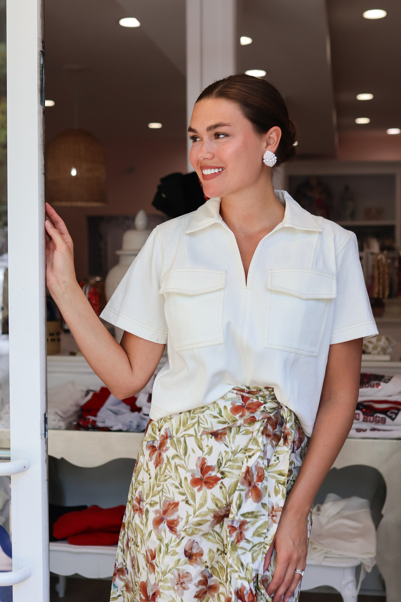 A cute white denim top with warm stitch detailing. Pair with your favorite jeans or skirts.