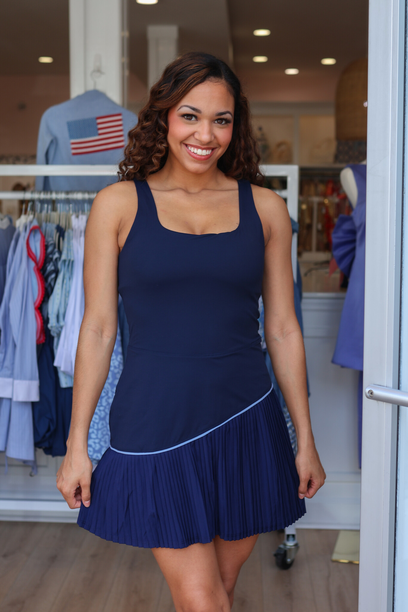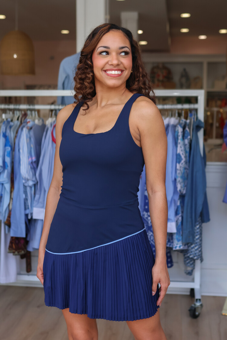 The design features a figure-hugging smocked bodice which provides excellent stretch and a perfect fit through the bust and waist. Short sleeves offer comfortable coverage, while the midi dress length creates an elegant, flowy hemline.