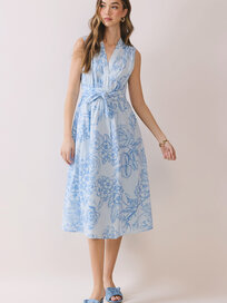 A floral print midi dress featuring a fit and flare silhouette. Designed with a sleeveless and a V-neckline. Finished with a self-tie waist belt to define the waist and a softly flared skirt for effortless movement. 100% Cotton