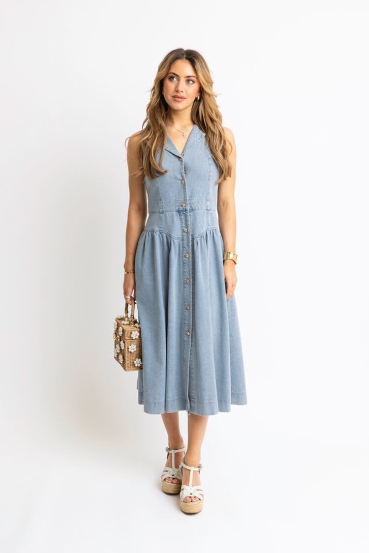 • A stylish denim midi dress we are loving. Wear with your favorite ballet flats or boots for a chic Fall look.