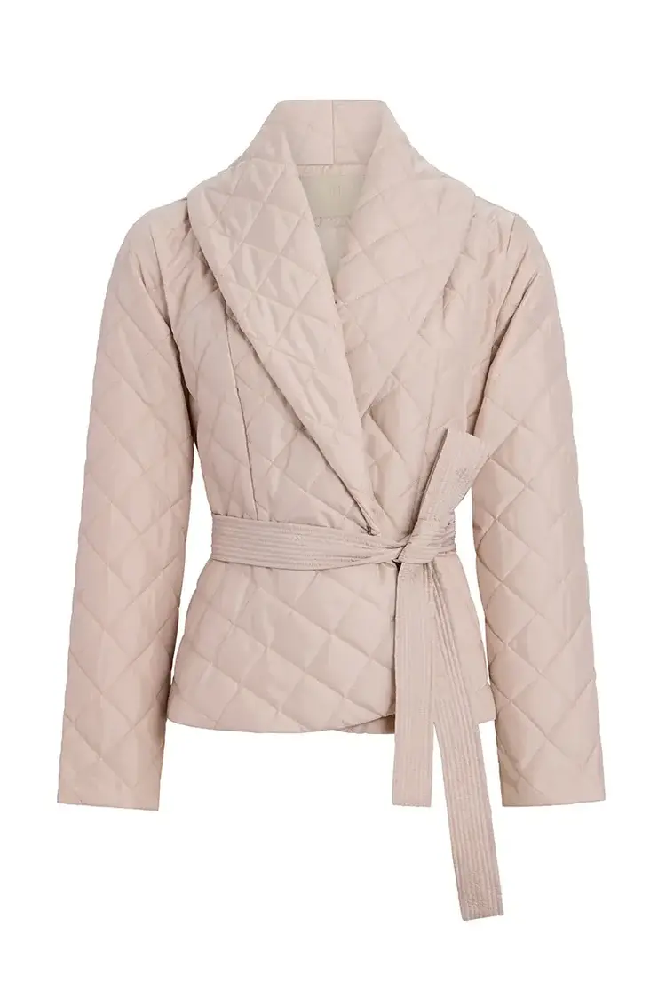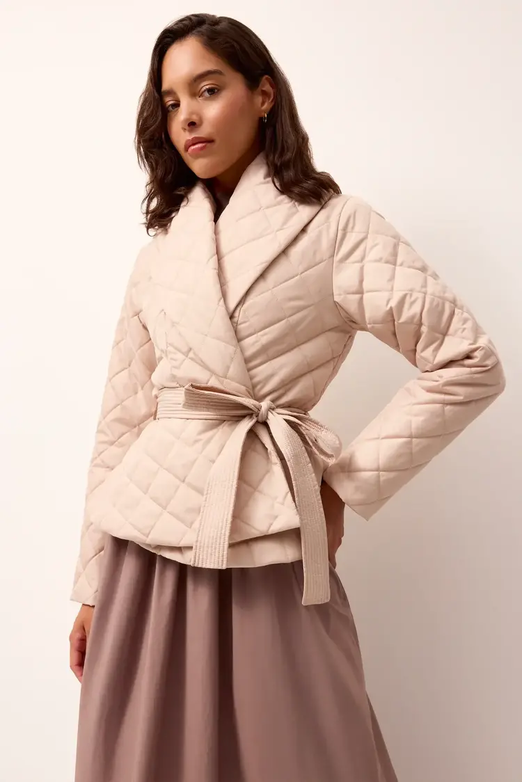 • A shawl collar wrap front is paired with a trapunto stitch tie belt and cropped hem for a modern reinvention of a classic wrap coat. Fully lined
