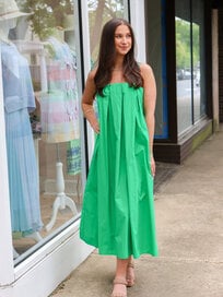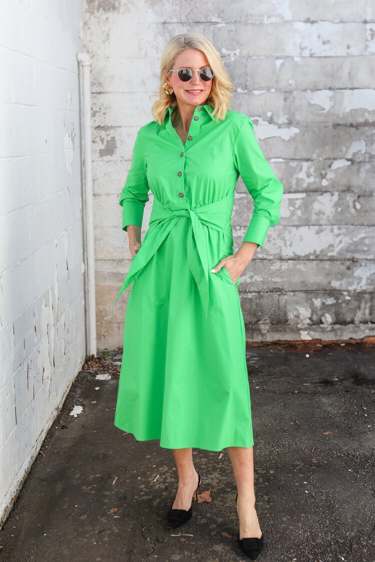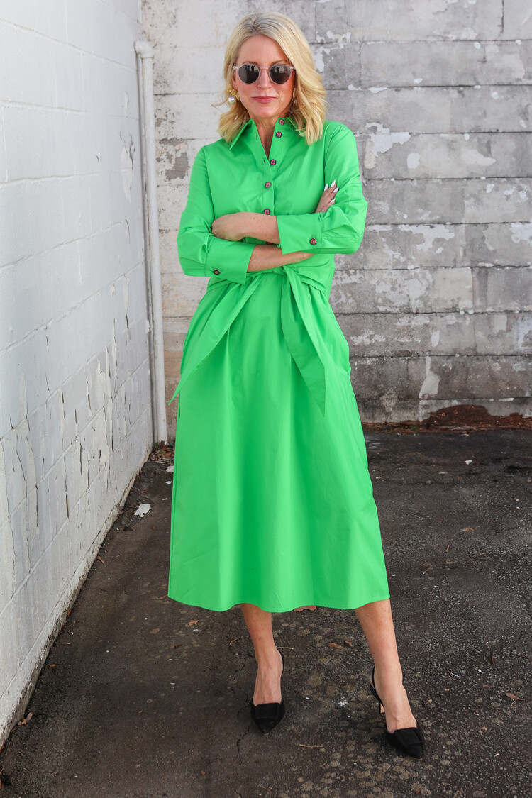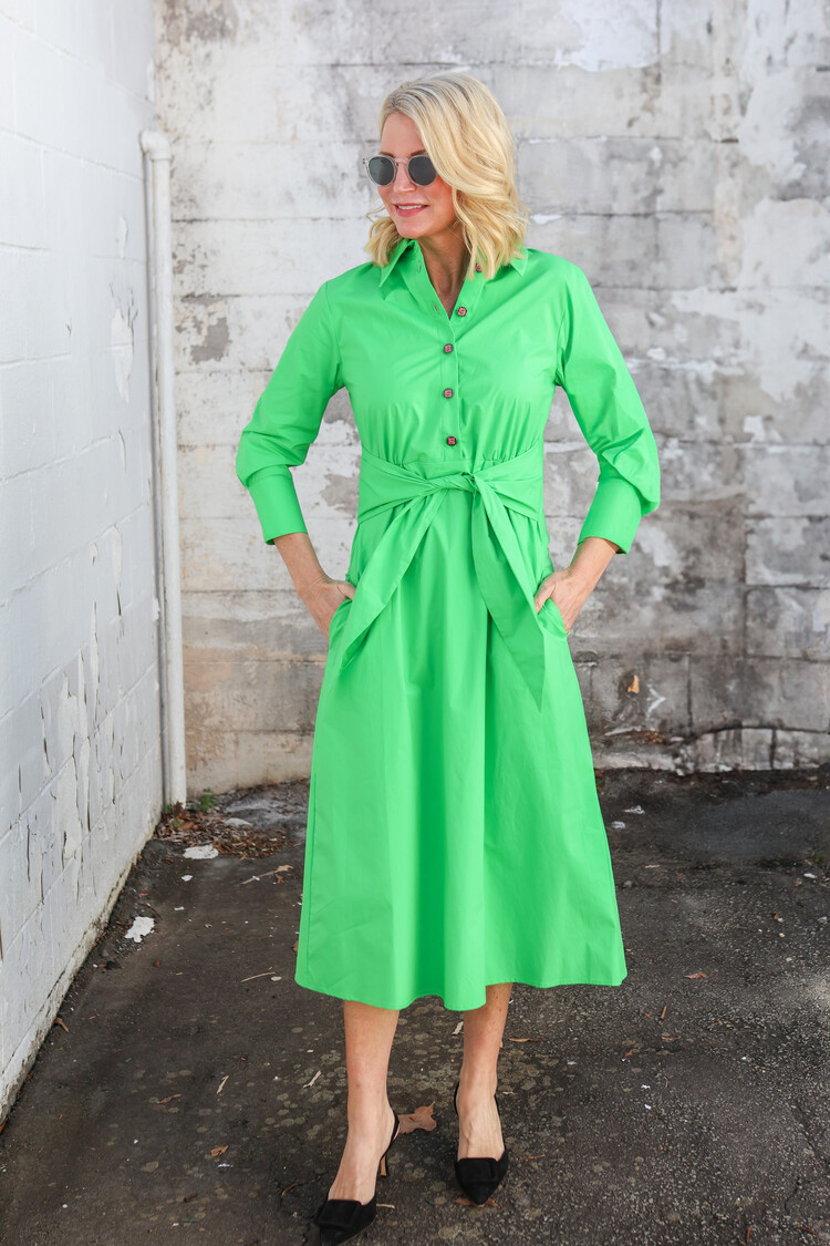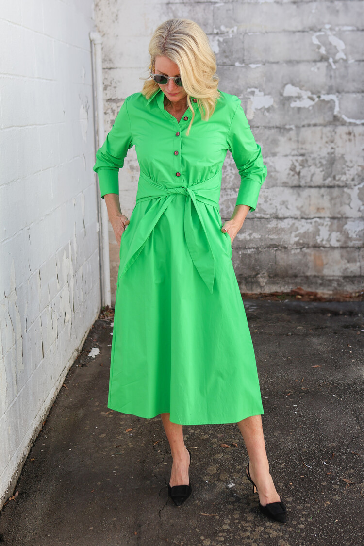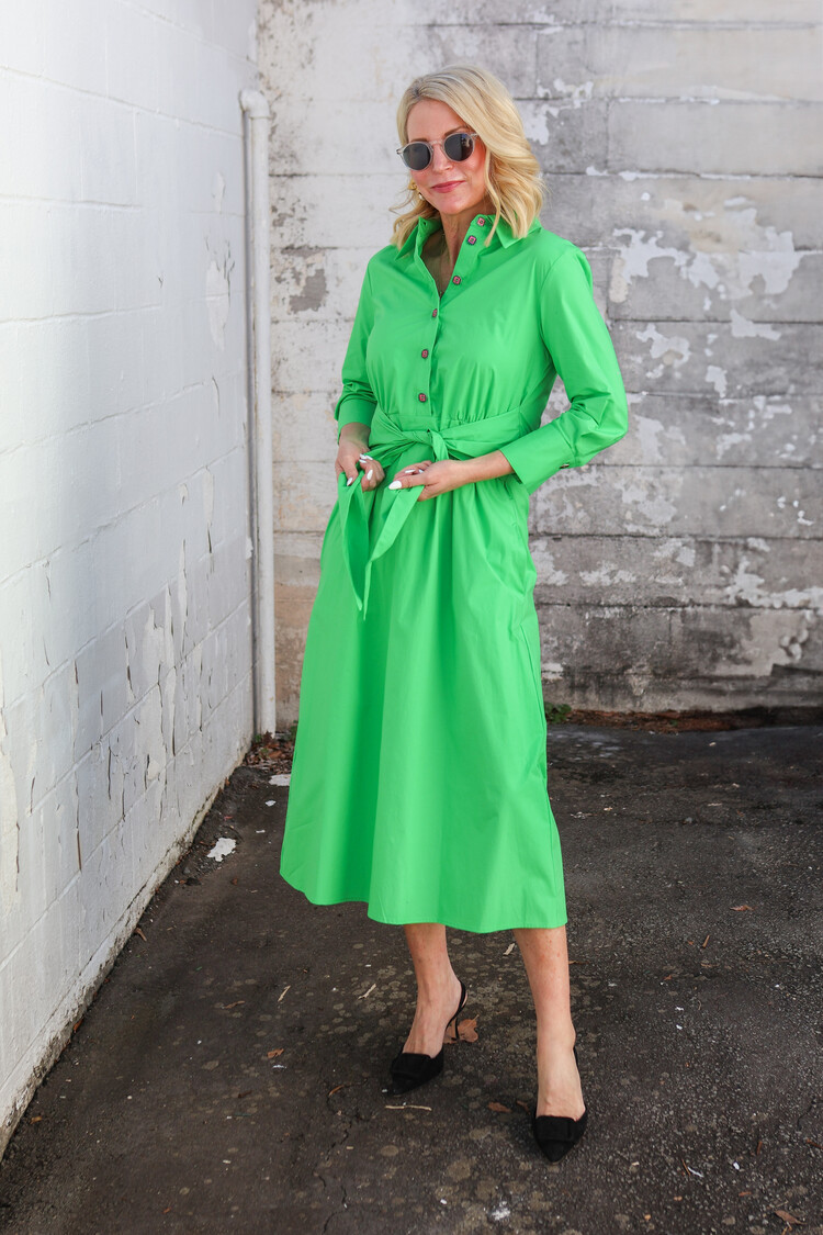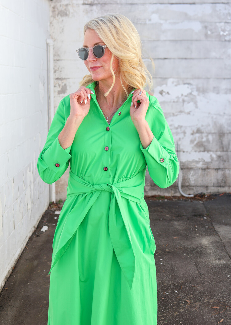 • Green midi dress. Closure with decorative pink buttons to the waist. Shirt collar. Tie to adjust to the waist.