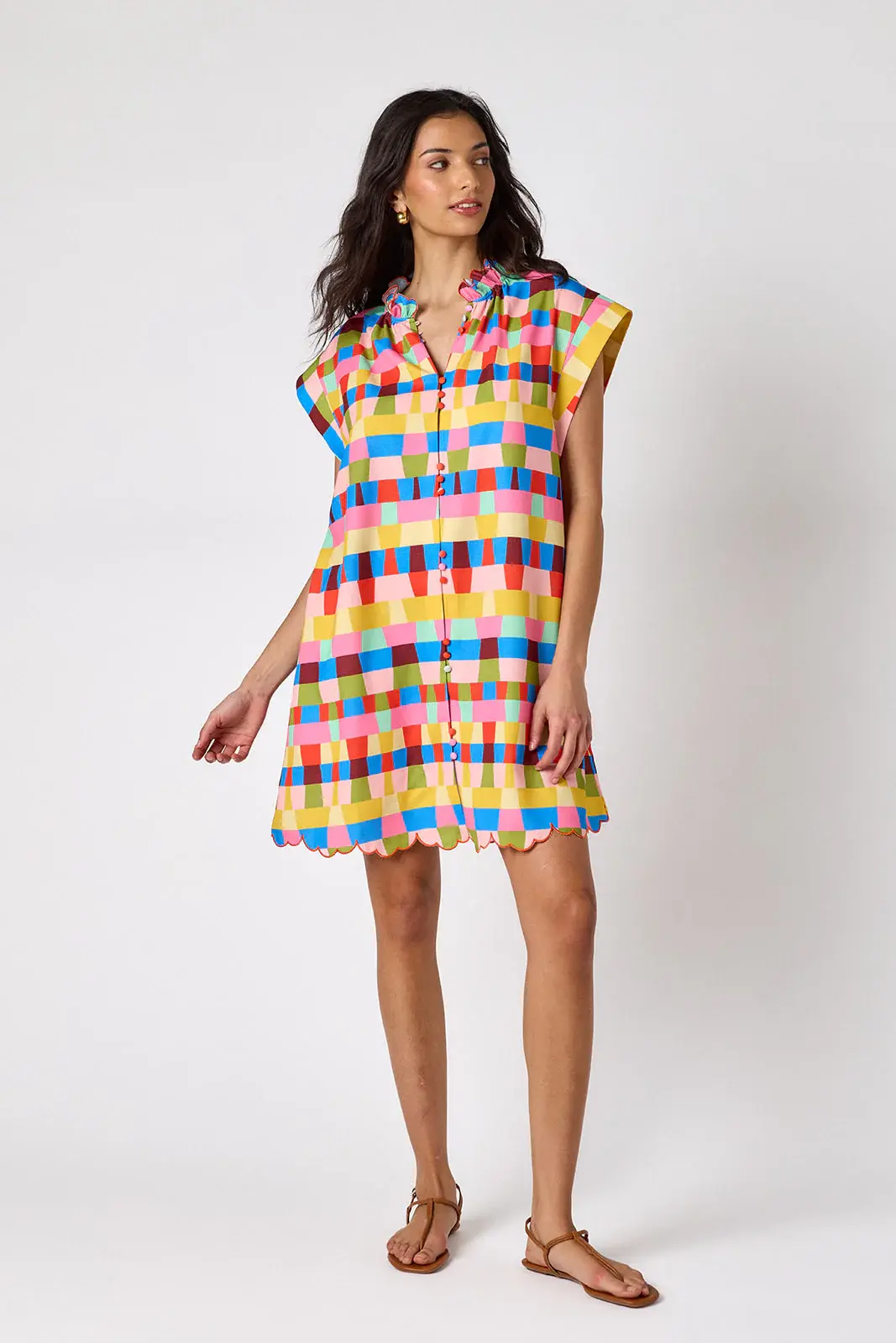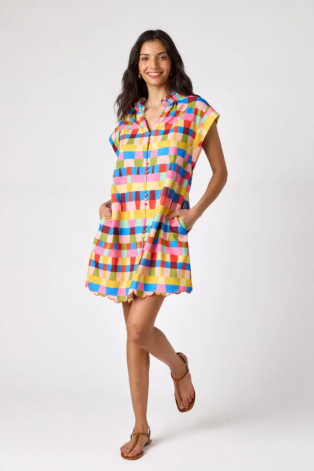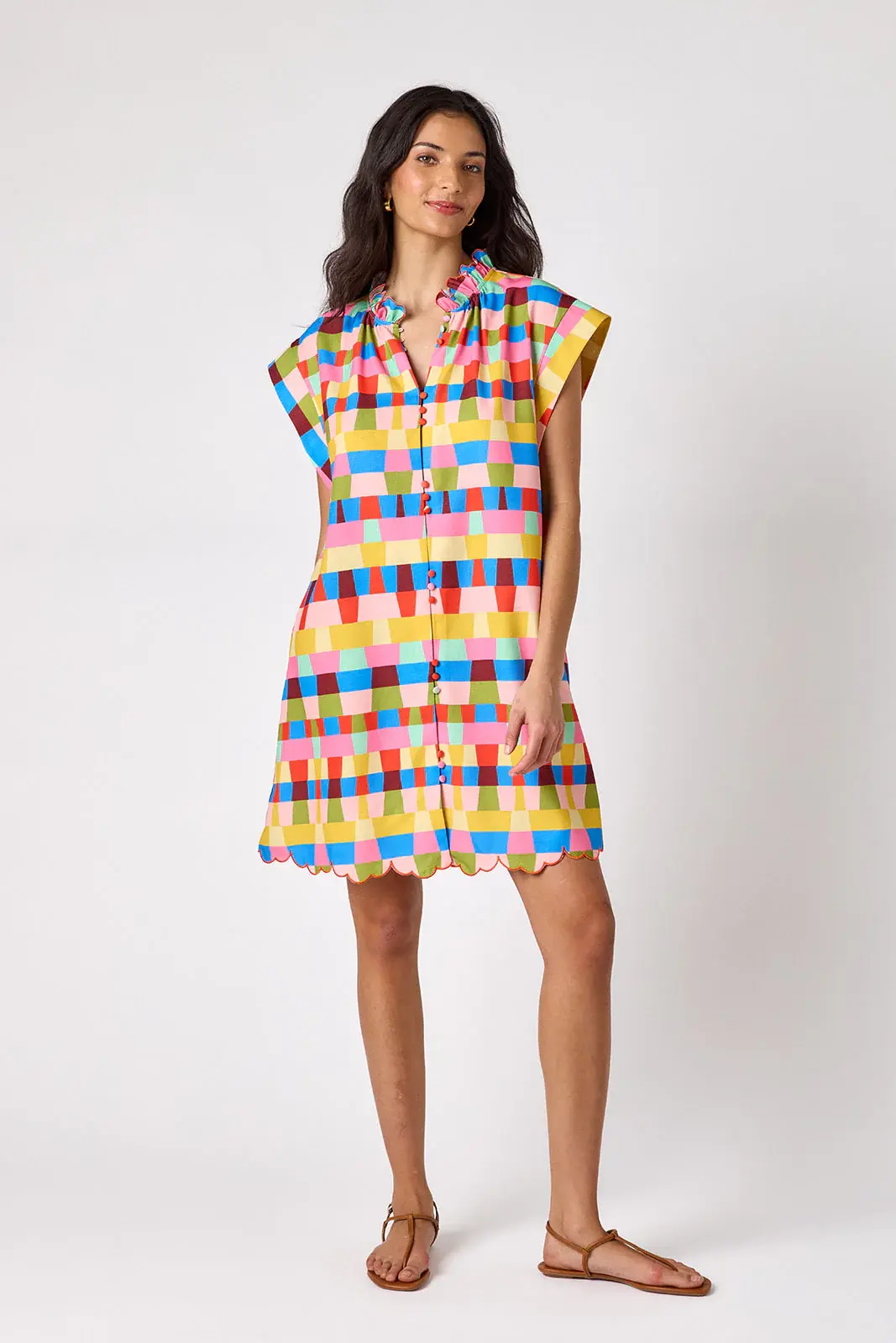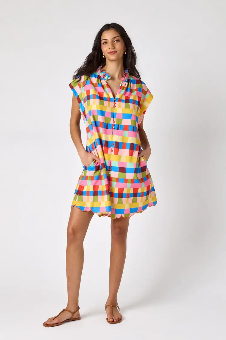 • This classic shift dress features a button front, flattering cap sleeves, a ruffle collar, and a beautifully embroidered scalloped hem. Perfect for office days, weekend brunch, church, and every spring event on your calendar.