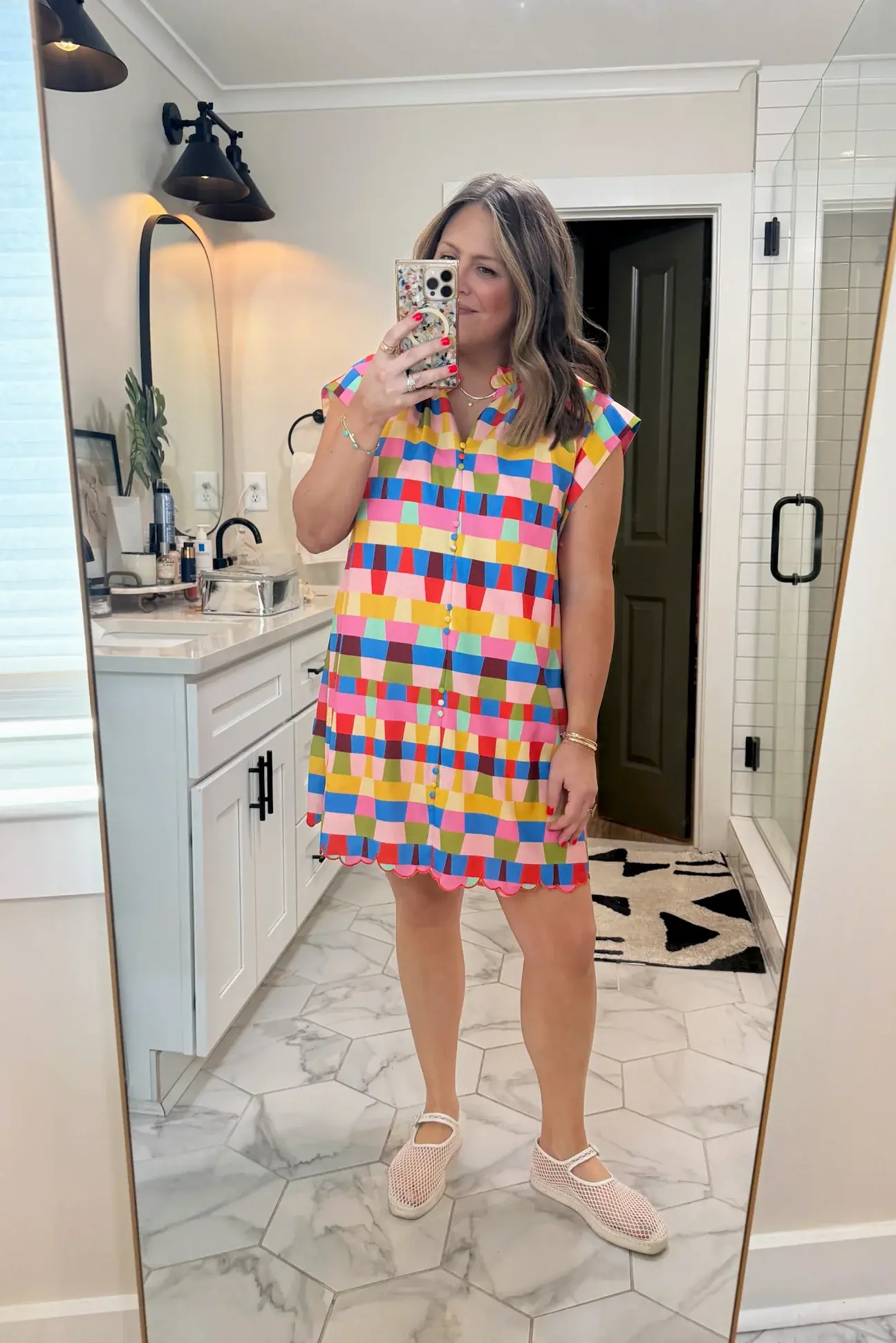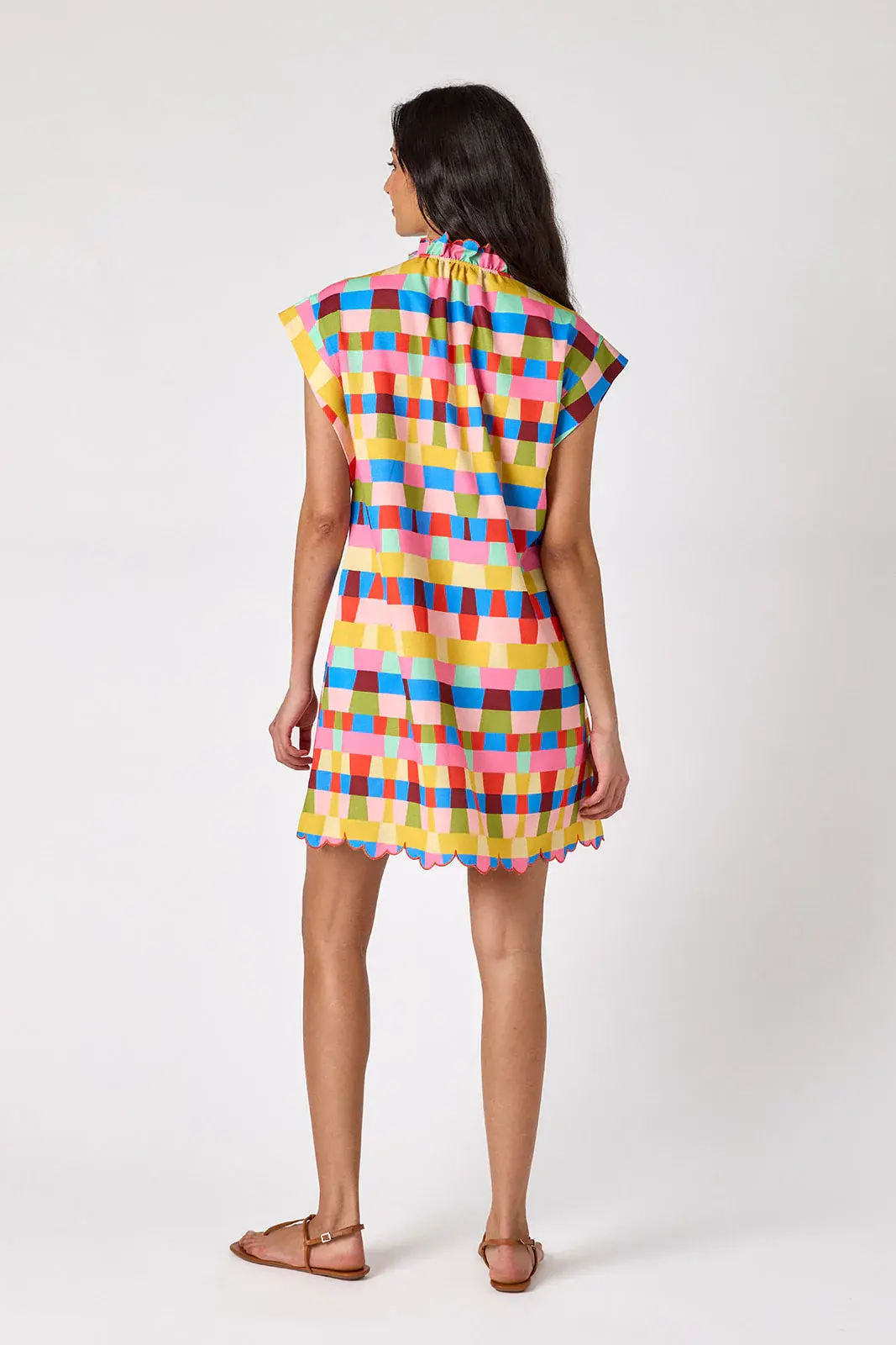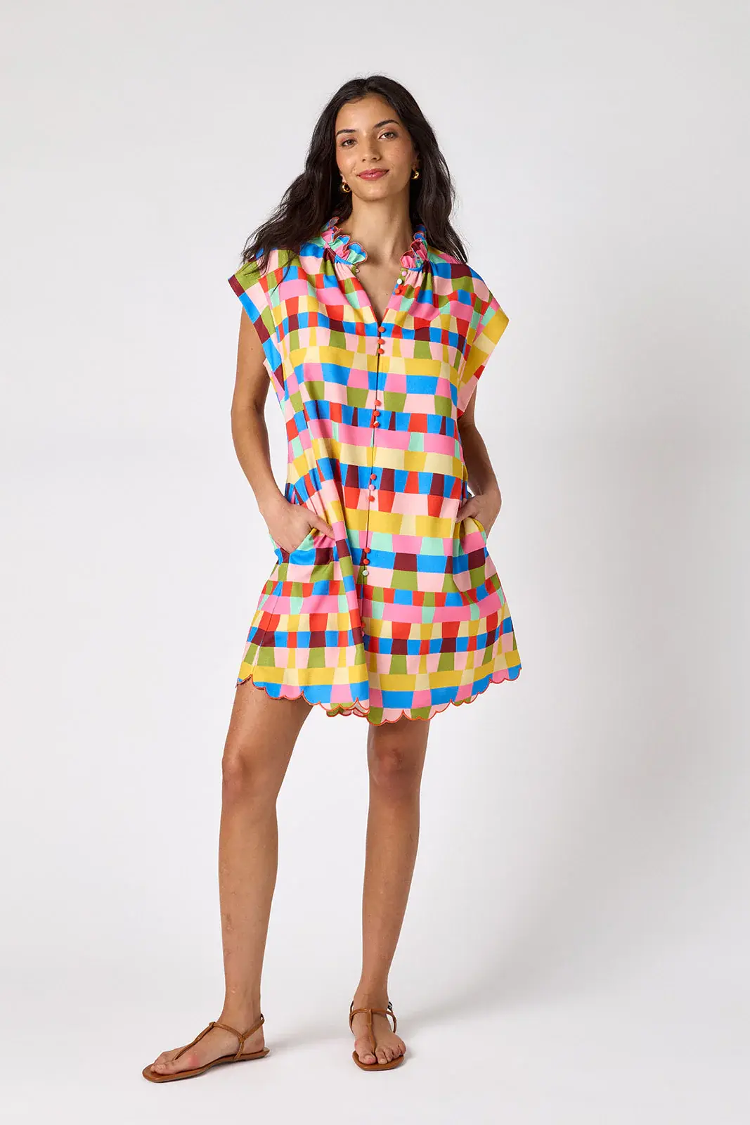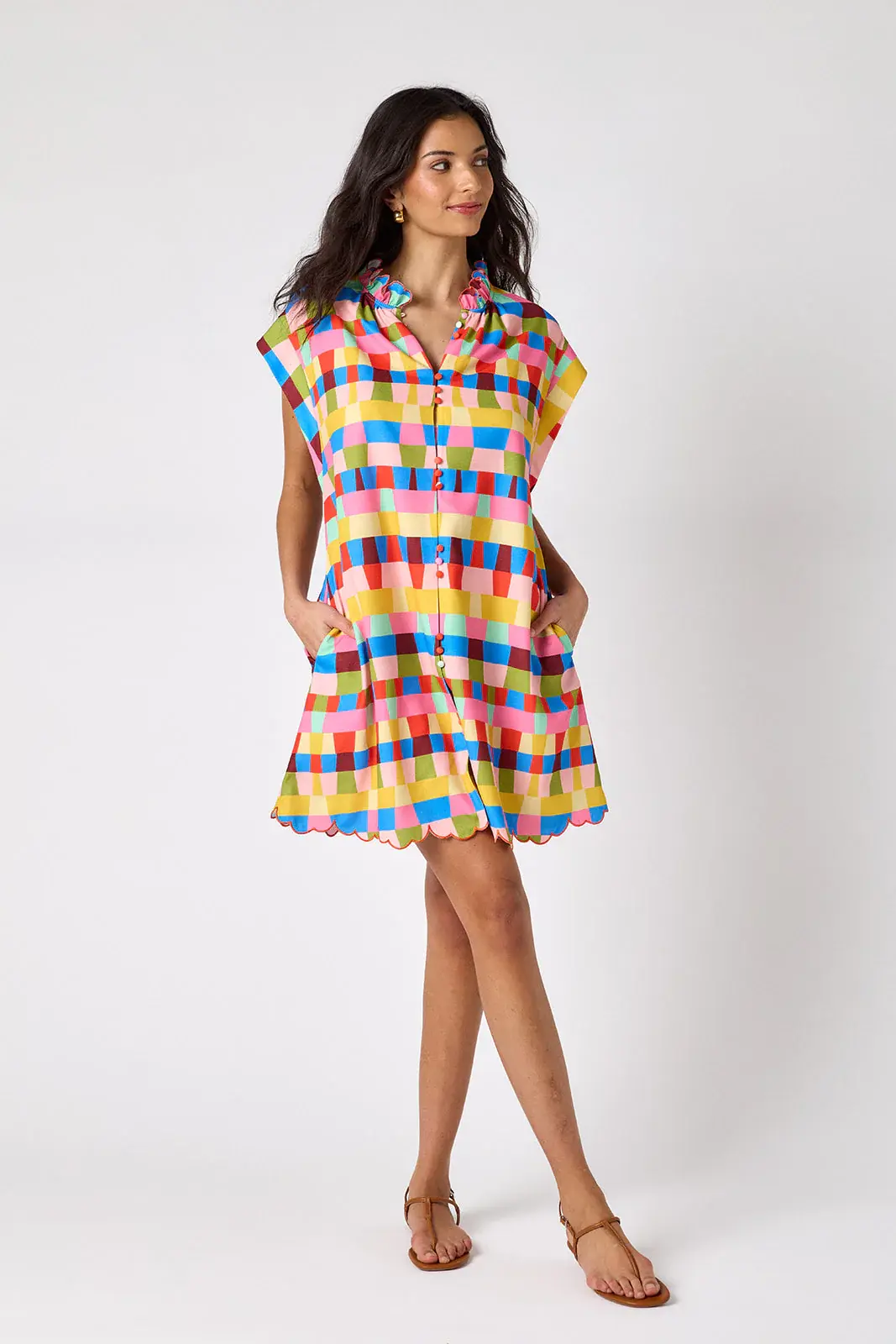 • This classic shift dress features a button front, flattering cap sleeves, a ruffle collar, and a beautifully embroidered scalloped hem. Perfect for office days, weekend brunch, church, and every spring event on your calendar.