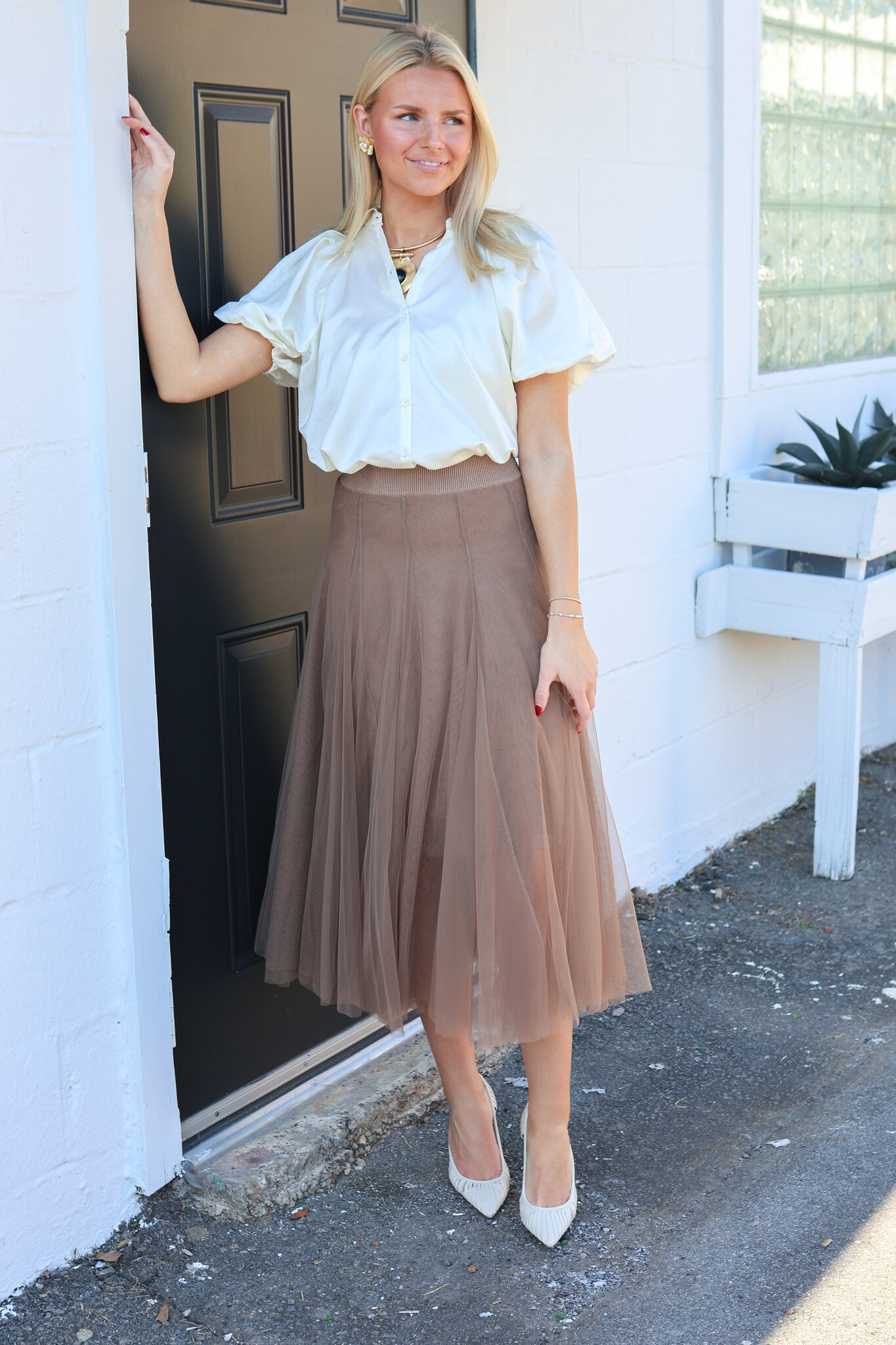 • The Leila Blouse is a romantic update to a classic button-up, cut from an ultra-smooth cotton-silk blend that drapes effortlessly. Designed with soft puff sleeves and a clean silhouette, it delivers subtle drama with everyday ease.