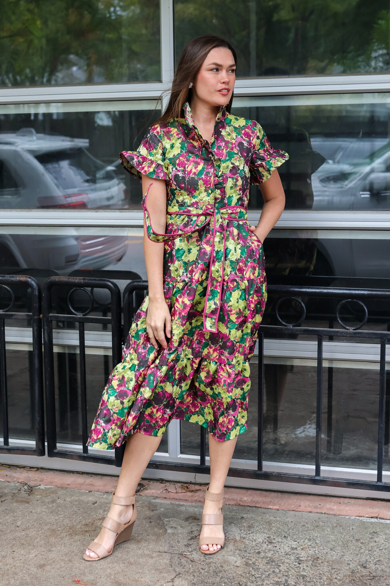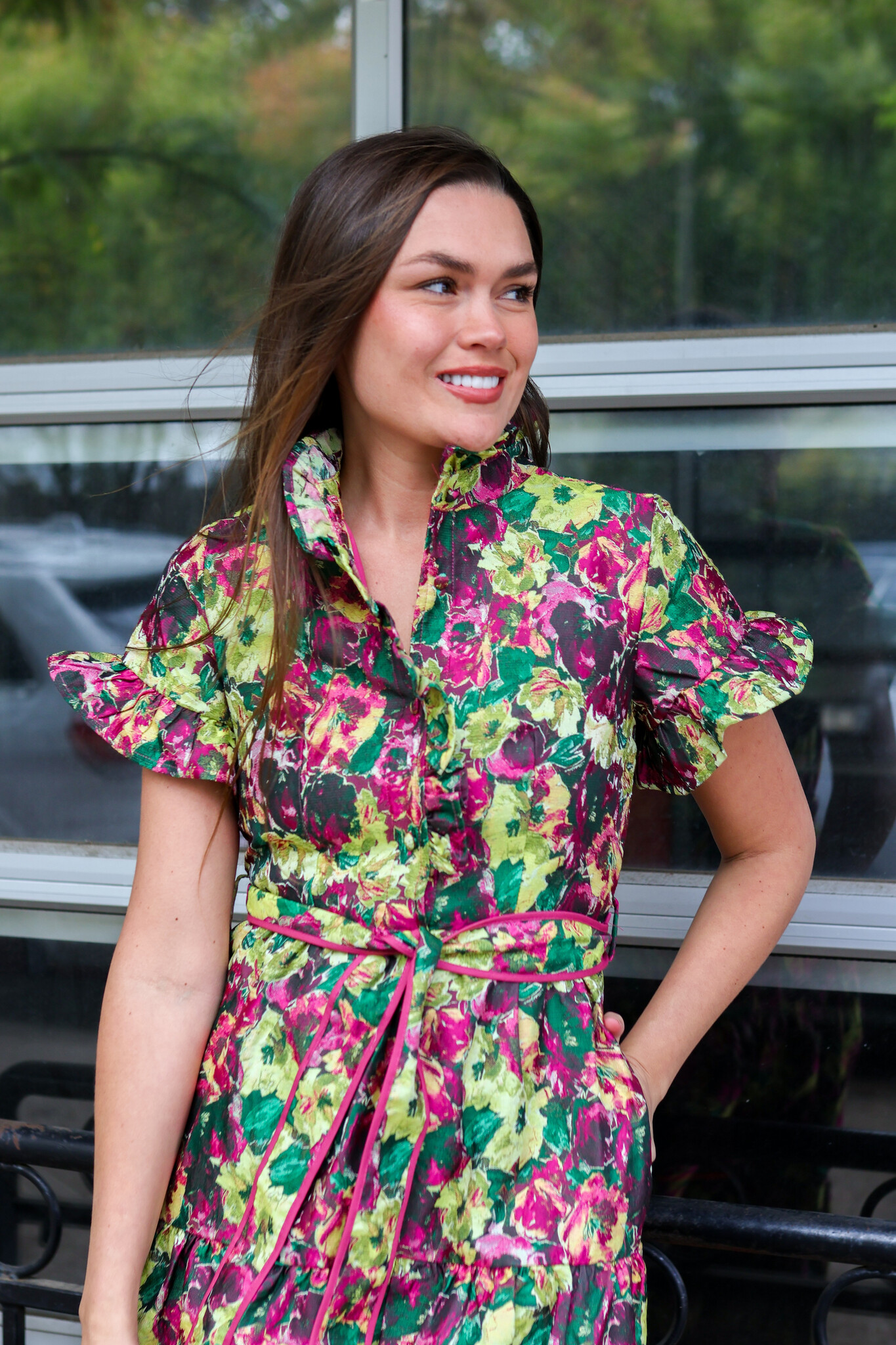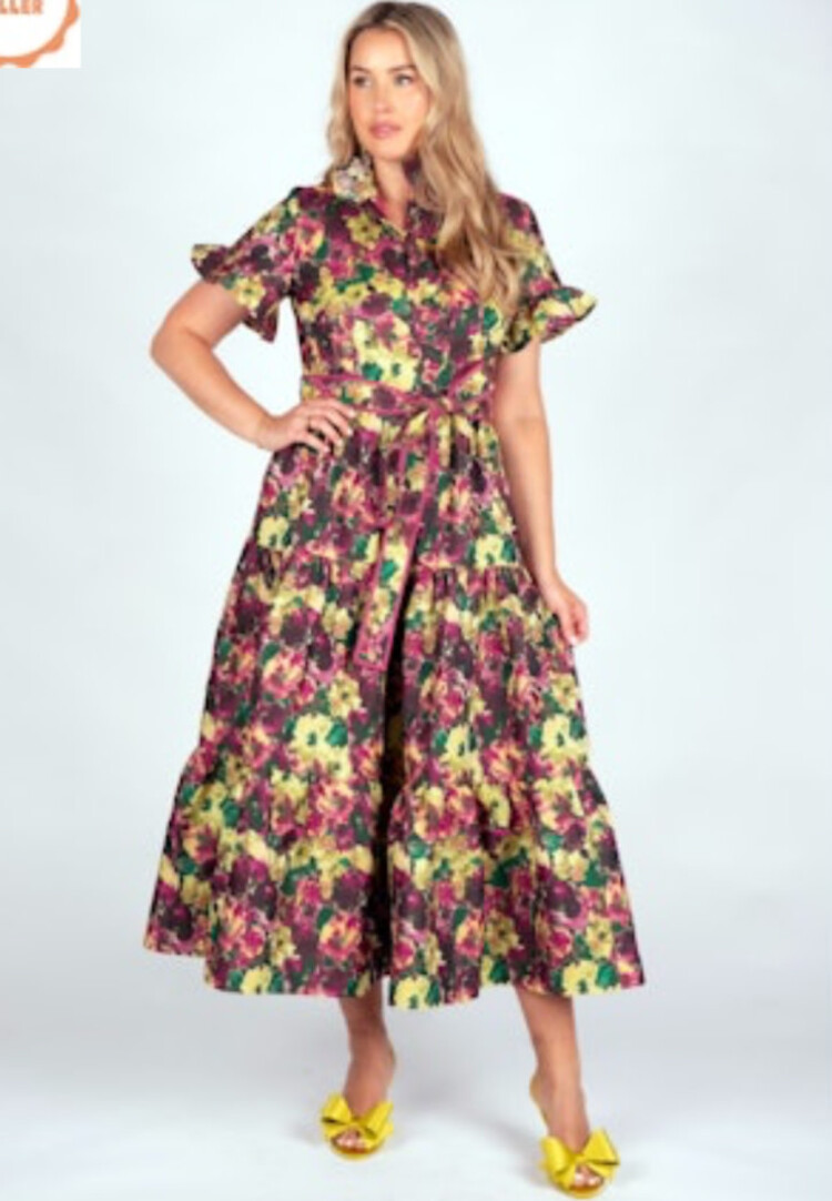 • Elevate your wardrobe with the Sincerely Ours Floral Lena Dress, a stunning maxi dress crafted from elegant floral jacquard fabric.