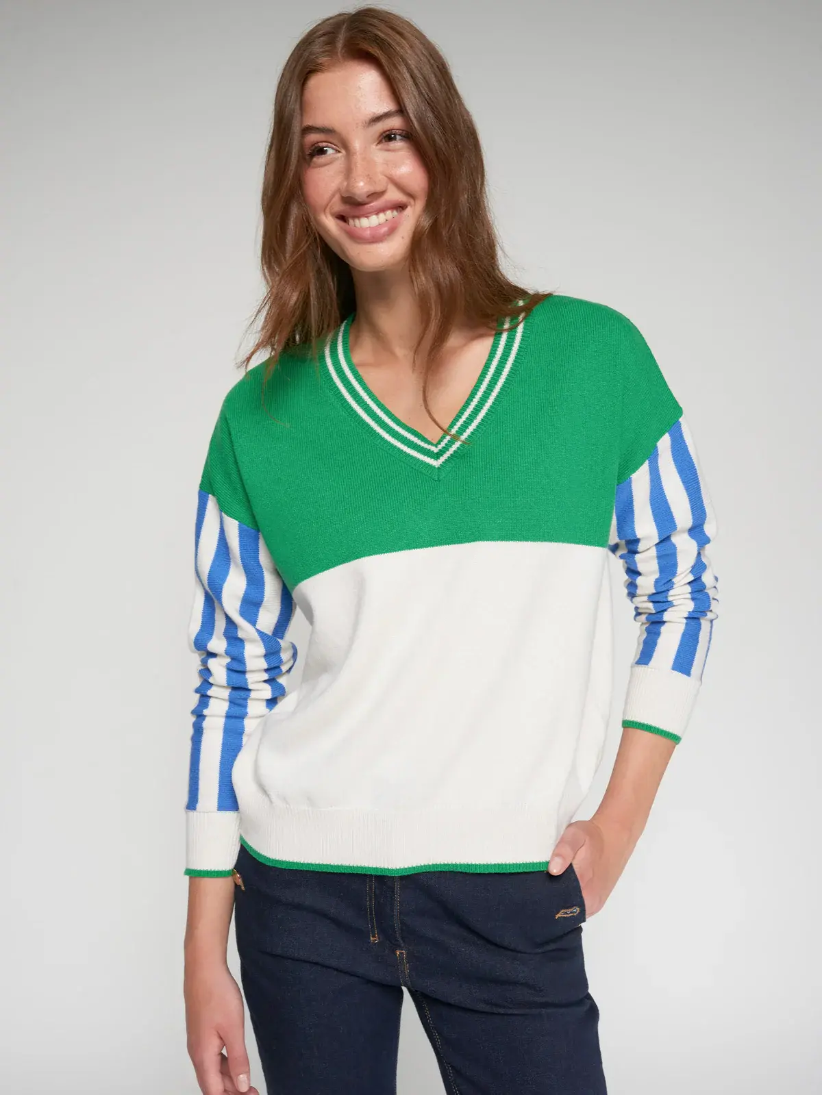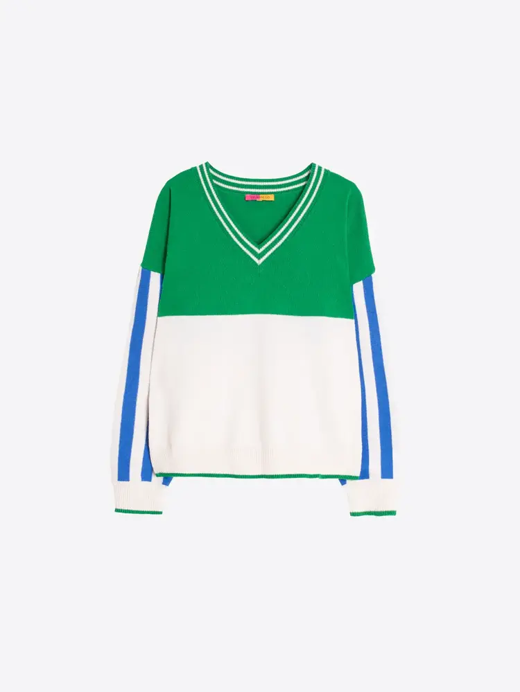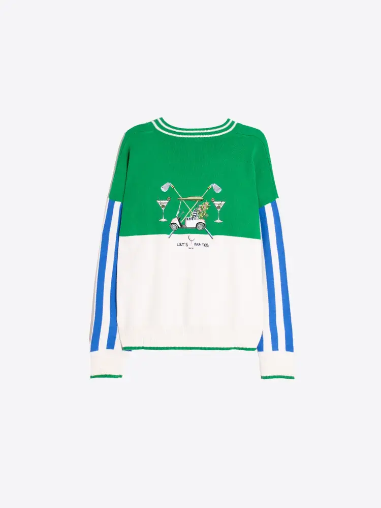 • Green and ecru sweater with a two-tone design and contrasting sleeves. Golf embroidery on the back with the message "LET'S PAR TEE". V-neck and ribbed trim. 60% COTTON 40% ACRYLIC