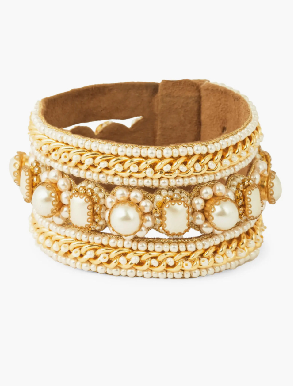 • Faux pearls, sparkling crystals and intricate metalwork elegantly detail this suede-lined cuff bracelet.