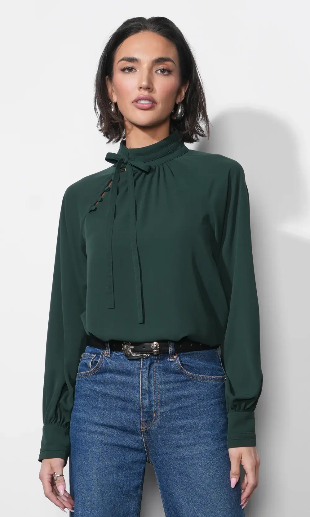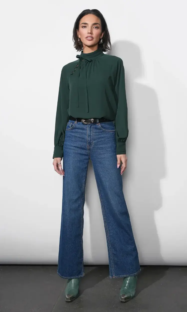 • This blouse is crafted from a soft, lightweight fabric in a beautiful emerald green color. It features a high mock neck that transitions into a long, dramatic self-tie detail at the back of the neck, offering a beautiful, cascading effect.