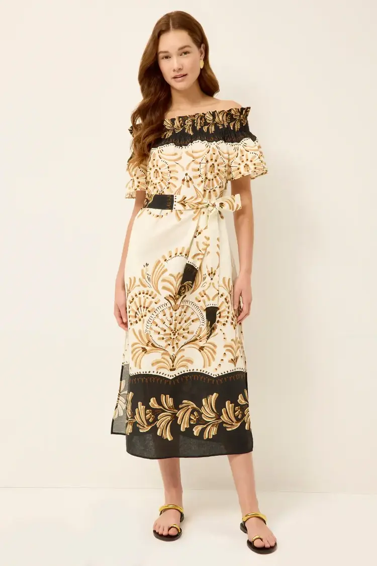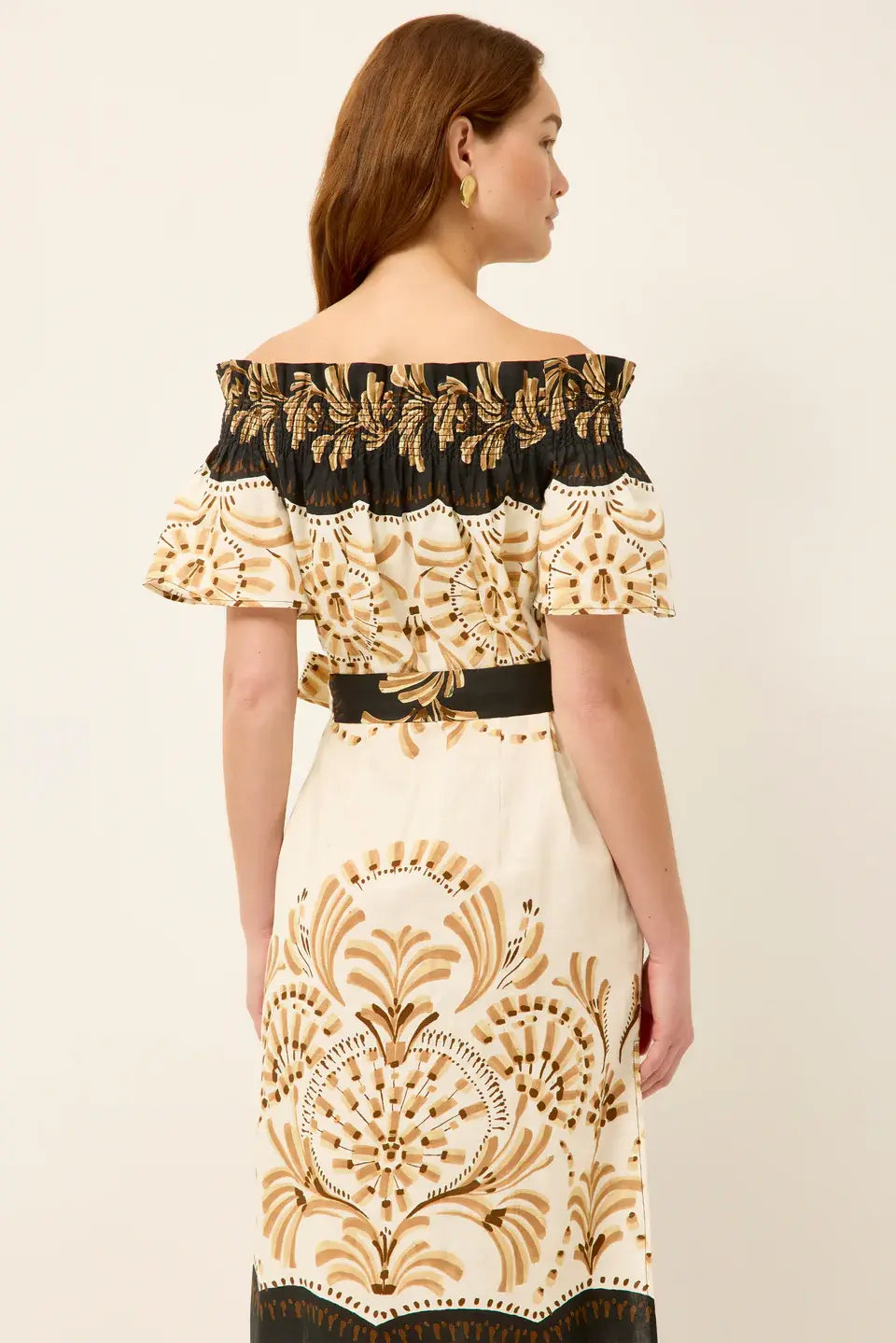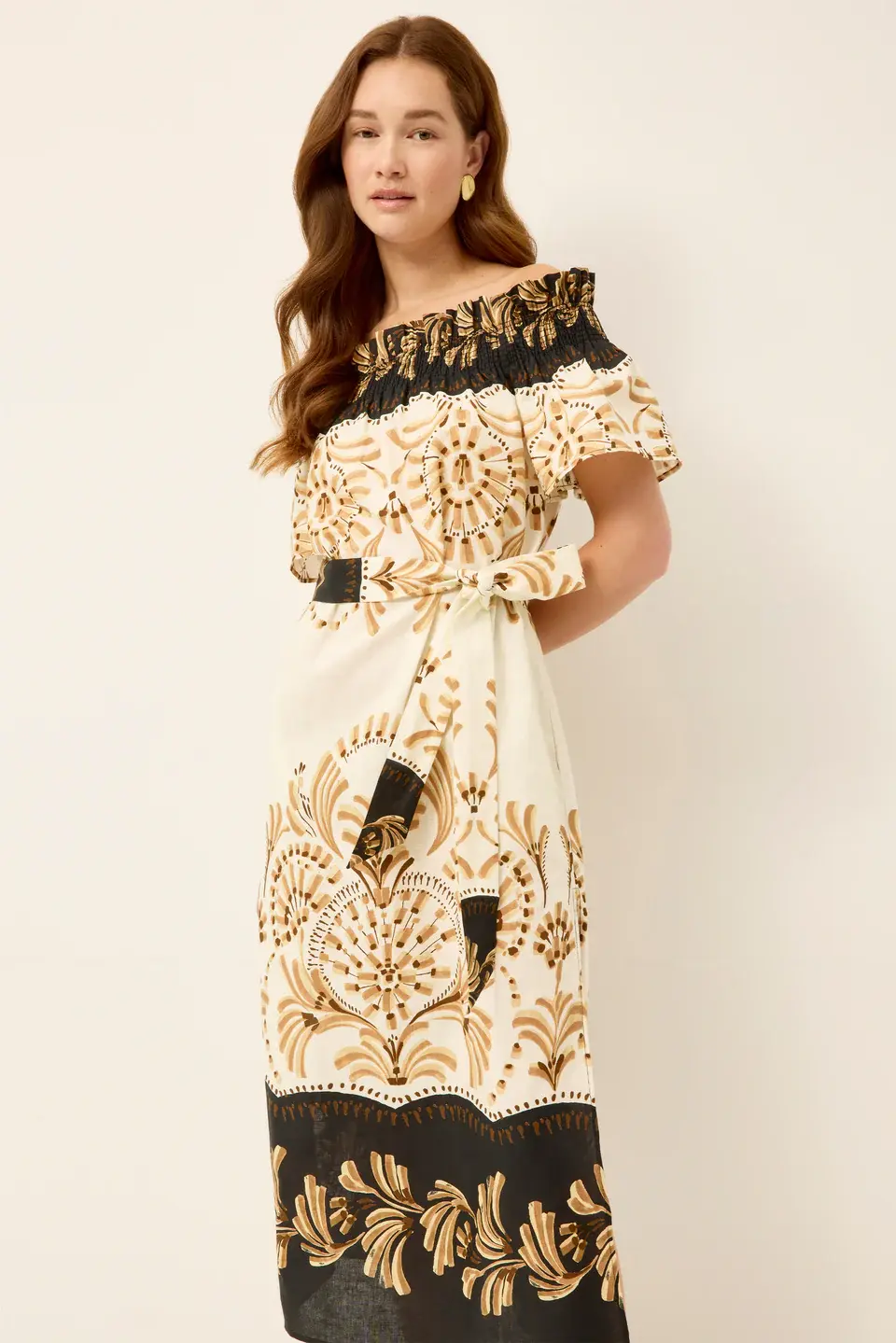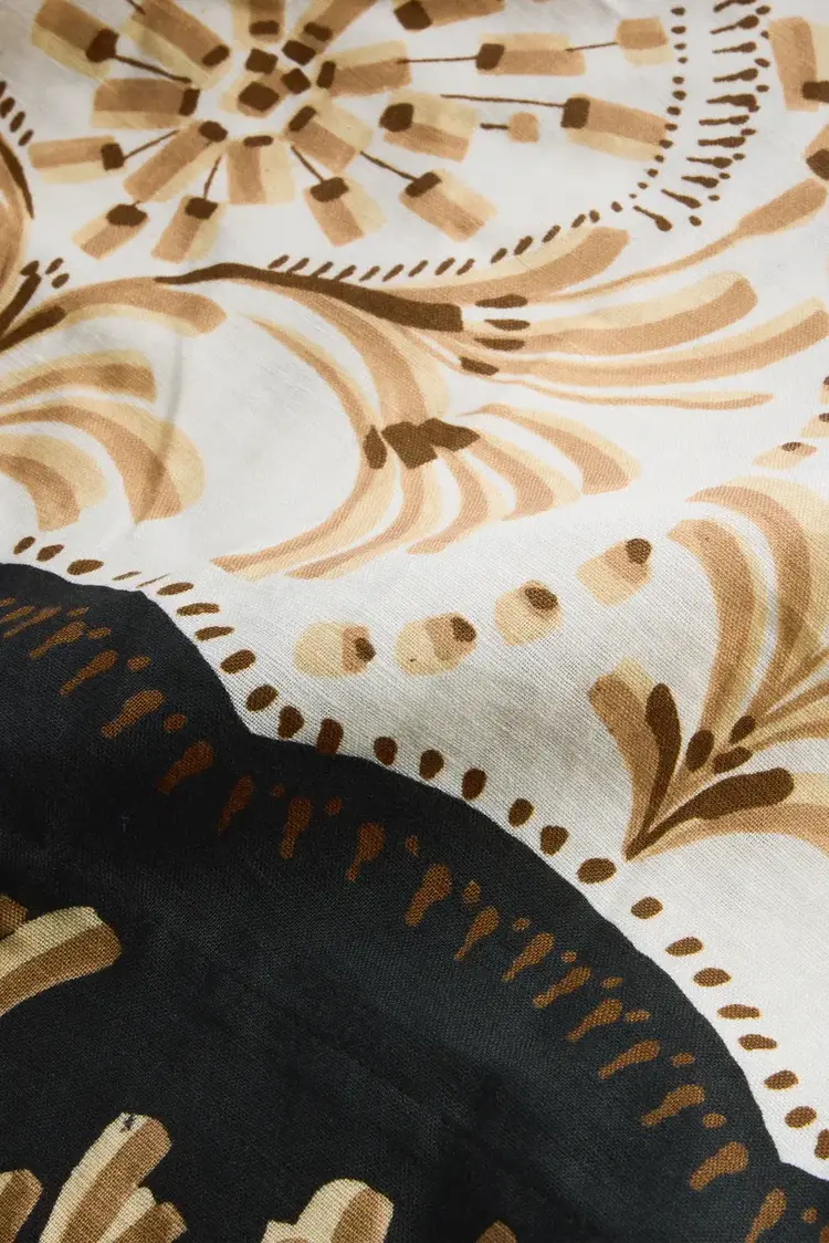 Lightweight and easy, this chic, off-the-shoulder column is cut from a summer-weight linen/cotton blend and is printed in our bold Mediterranean tile-inspired placed print, grounded in a black framing with accents of cream and tan.