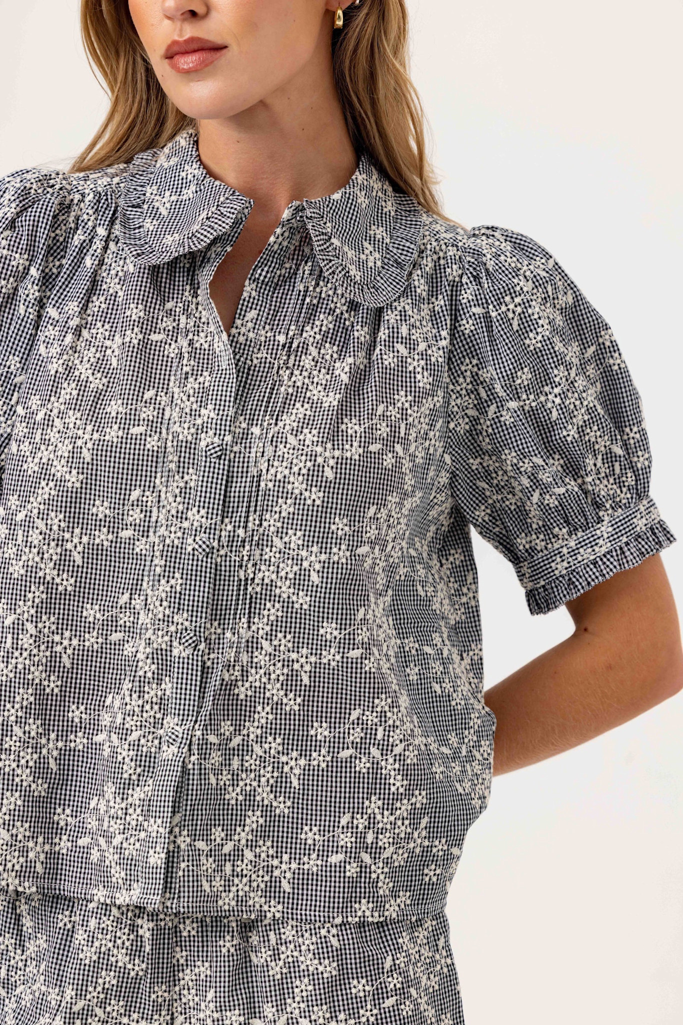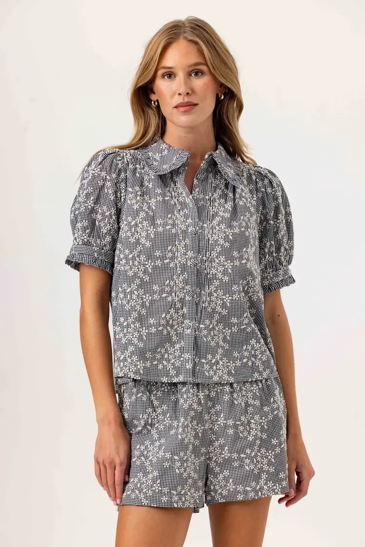 A feminine button-up, the Lotus Shirt pairs timeless gingham with soft, romantic details, bringing an elevated charm to an everyday staple.