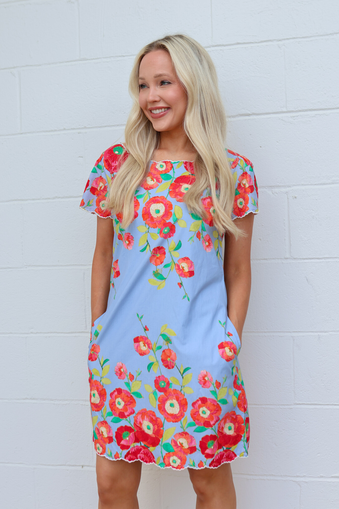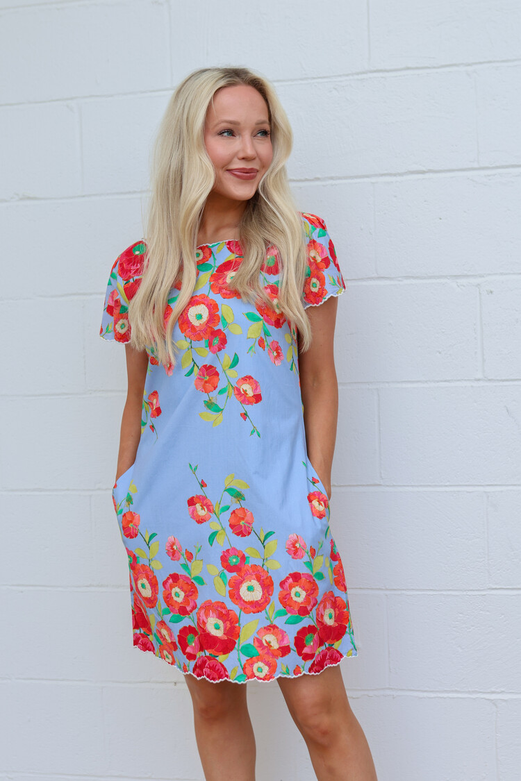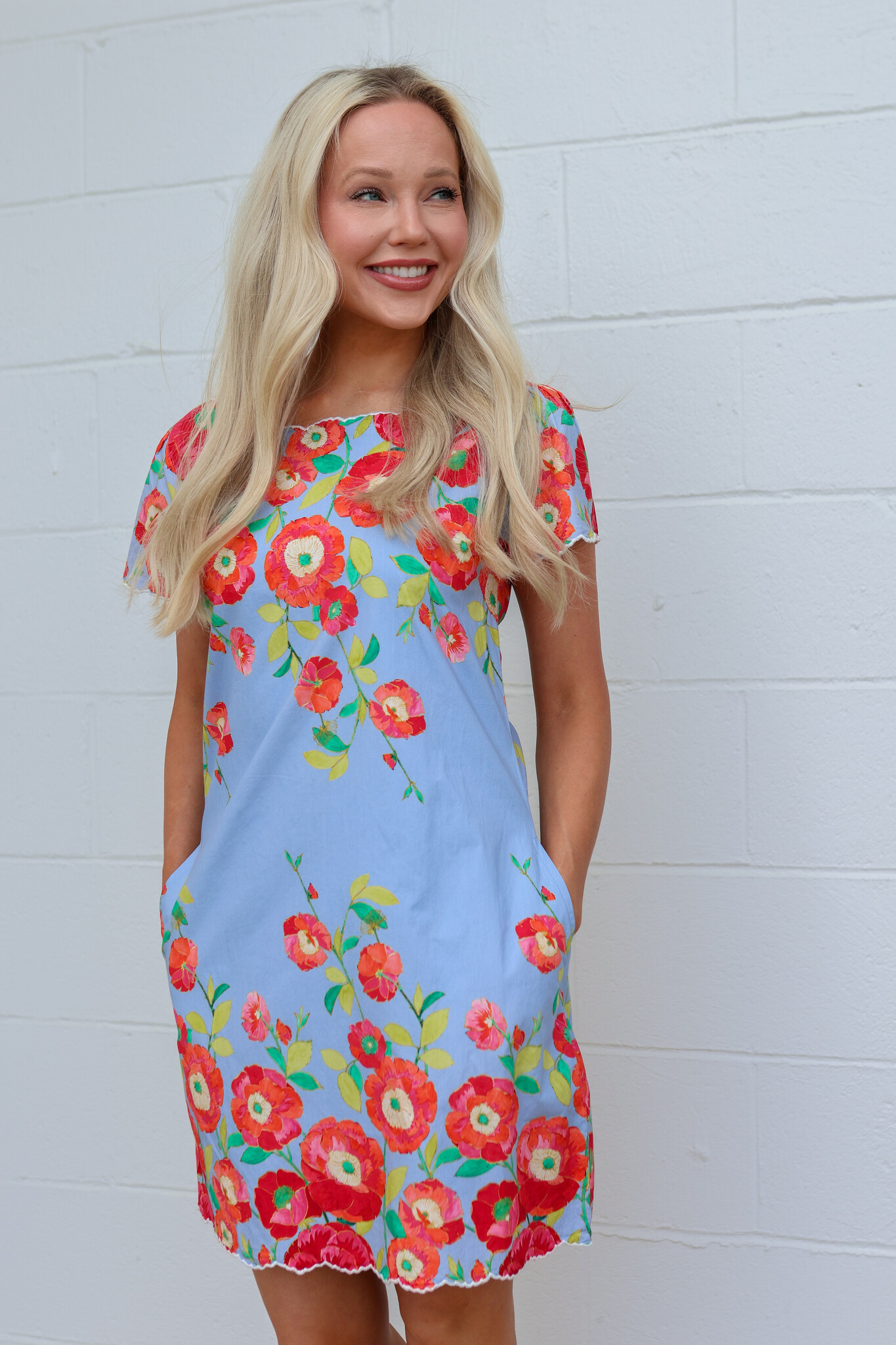 Louisa is a fan favorite, and this season's version is no exception. She boasts the same round neckline, shift silhouette, and cap sleeves that you know and love. We've elevated this season's Louisa in our Poppy Patch print on a blue poplin fabric.