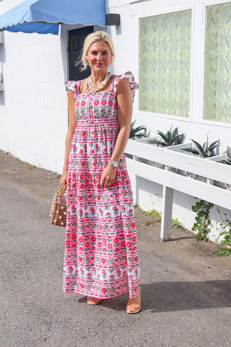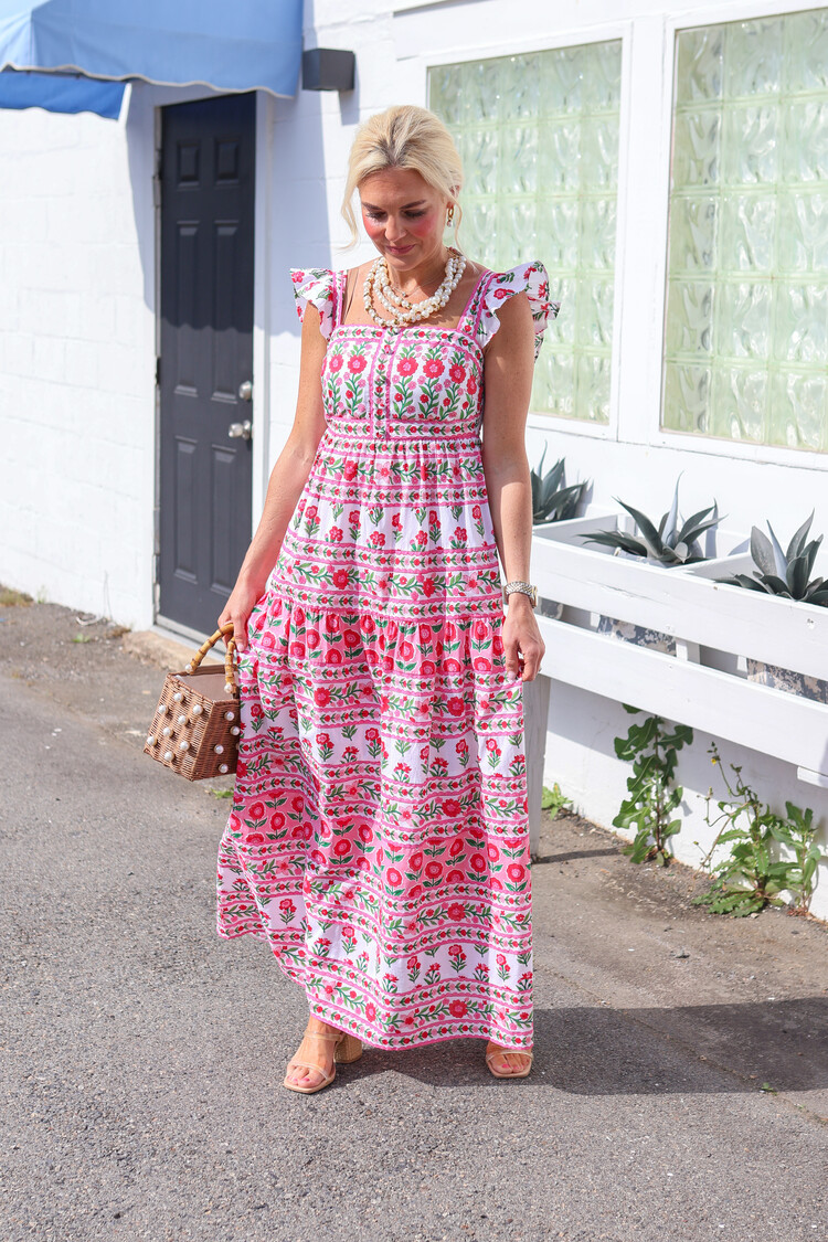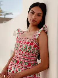 Crafted from a clever mix of hand block-printed fabrics, it features a fitted body with buttons down the front, delicate ruffled straps and a statement print-mixed skirt.