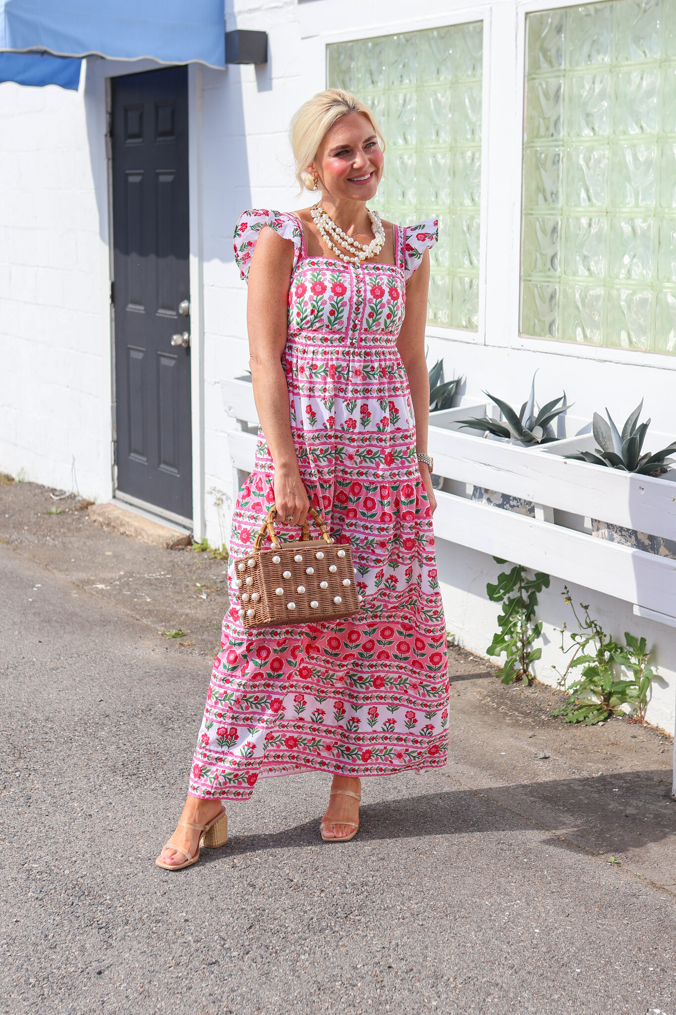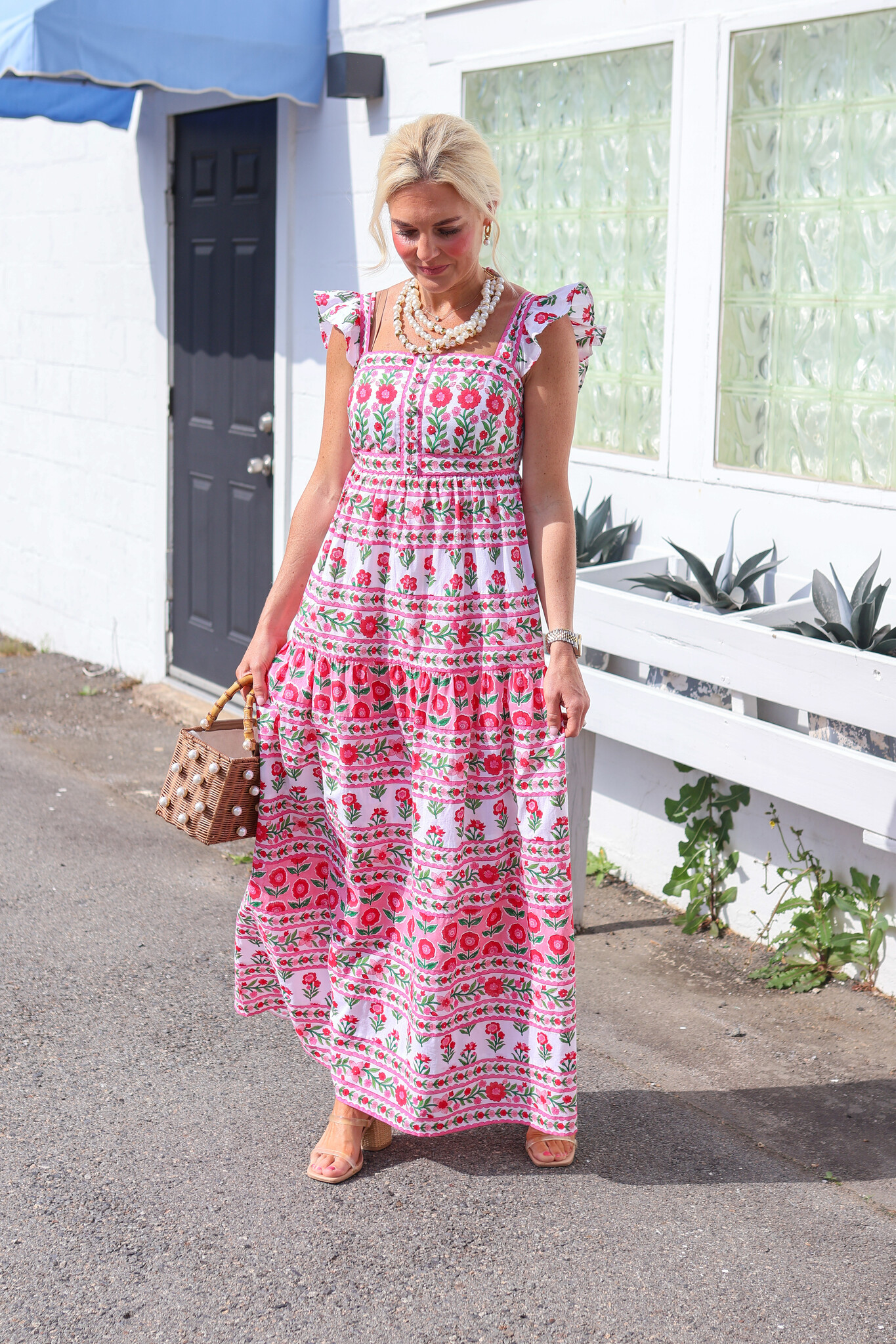 This midi-length beauty showcases a classic shirt dress silhouette with modern updates including a flattering tie waist and playful tiered ruffle hem that adds movement and feminine charm.