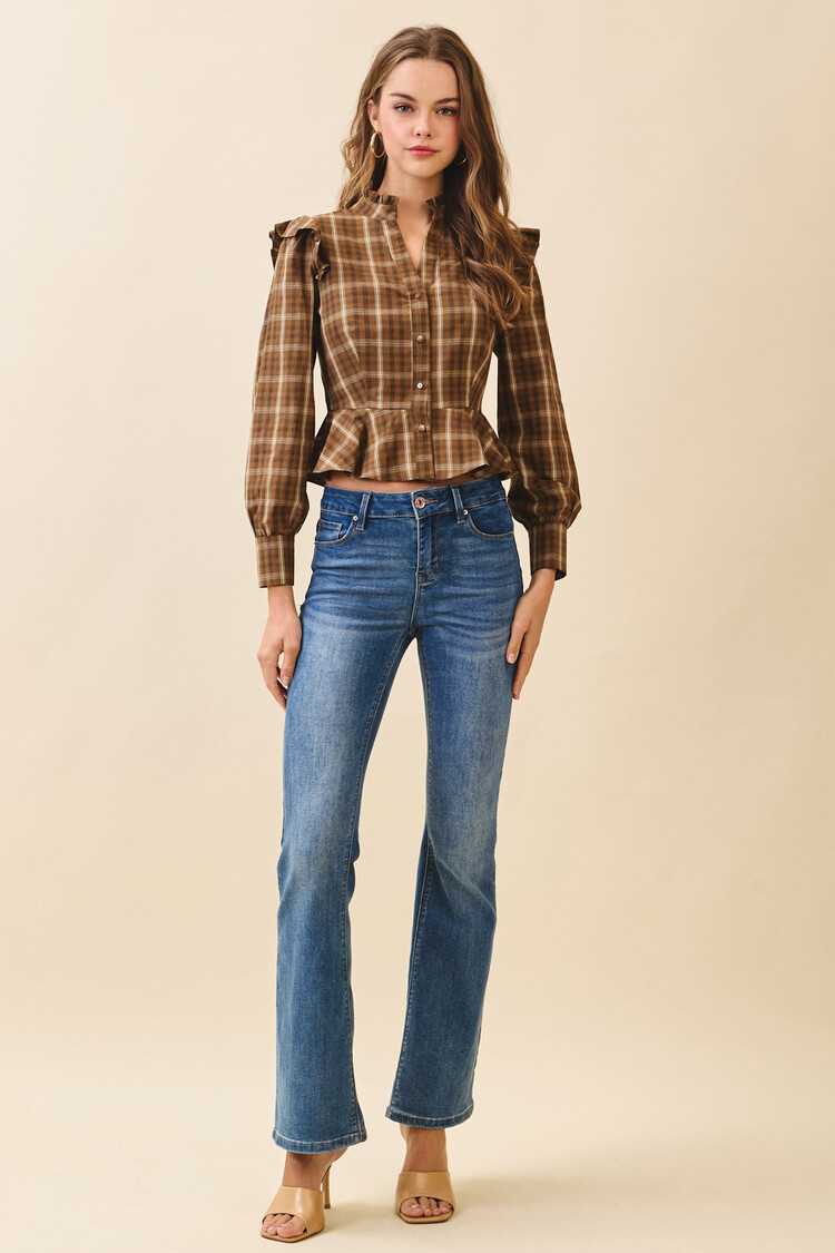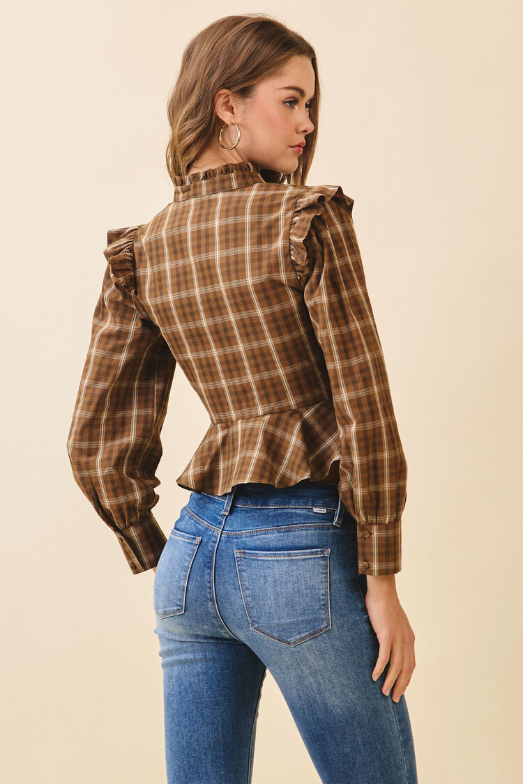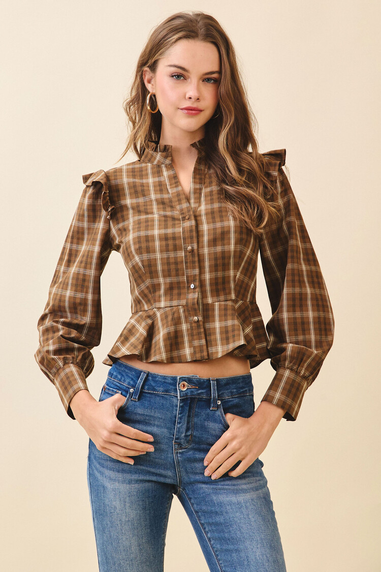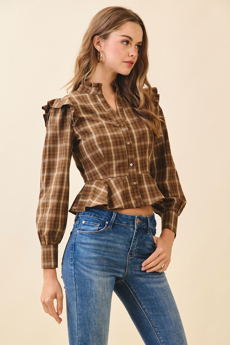 • Plaid button-front top featuring long puff sleeves with buttoned cuffs and a peplum hem. Designed with ruffle accents at the shoulders and a subtle ruffled neckline.