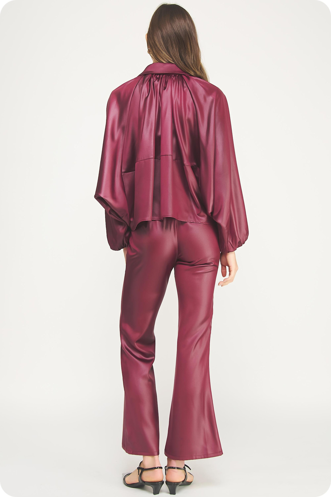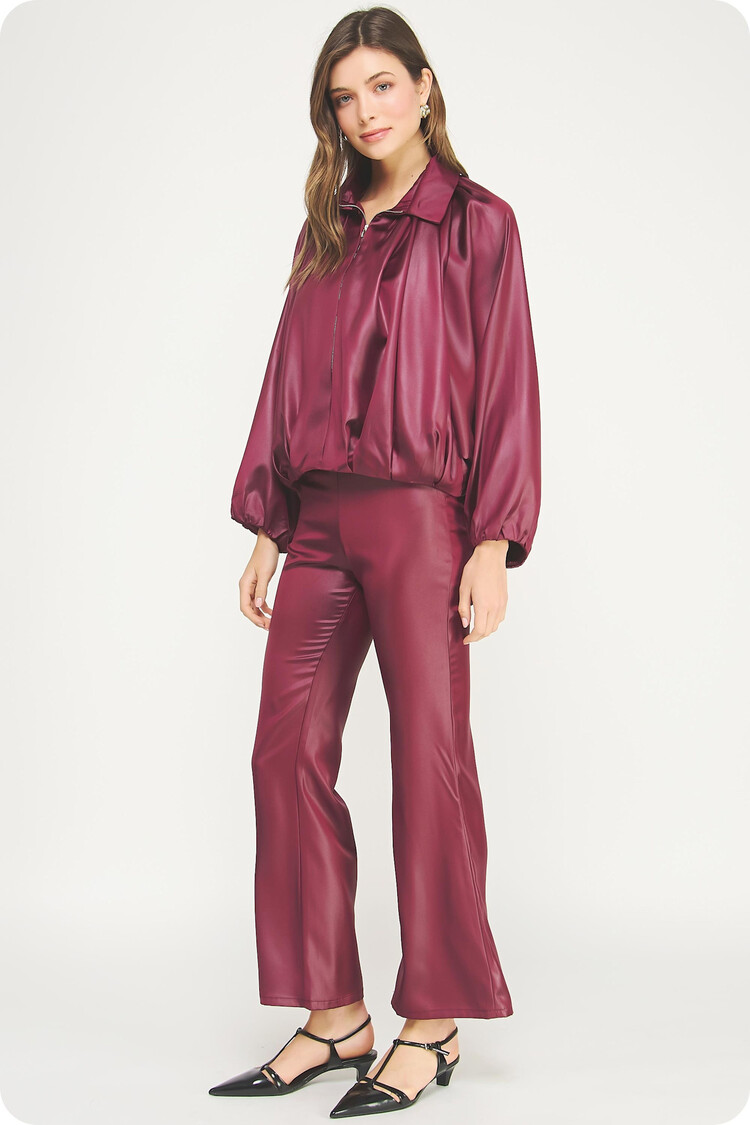 • Shirred bubble bomber jacket in coated satin fabric. This lightweight jacket features a spread collar, hidden zipper closure at front, raglan bubble long sleeve, pleat detail at hem, and lining.