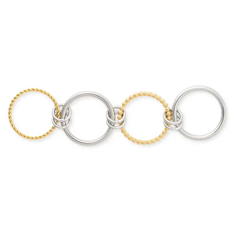 The Maddox Stacked Ring features a delicate gold rope twist band, complementing its stacked silver rings. Its unique mix of metals and water-resistant design make it a timeless addition to any jewelry collection.