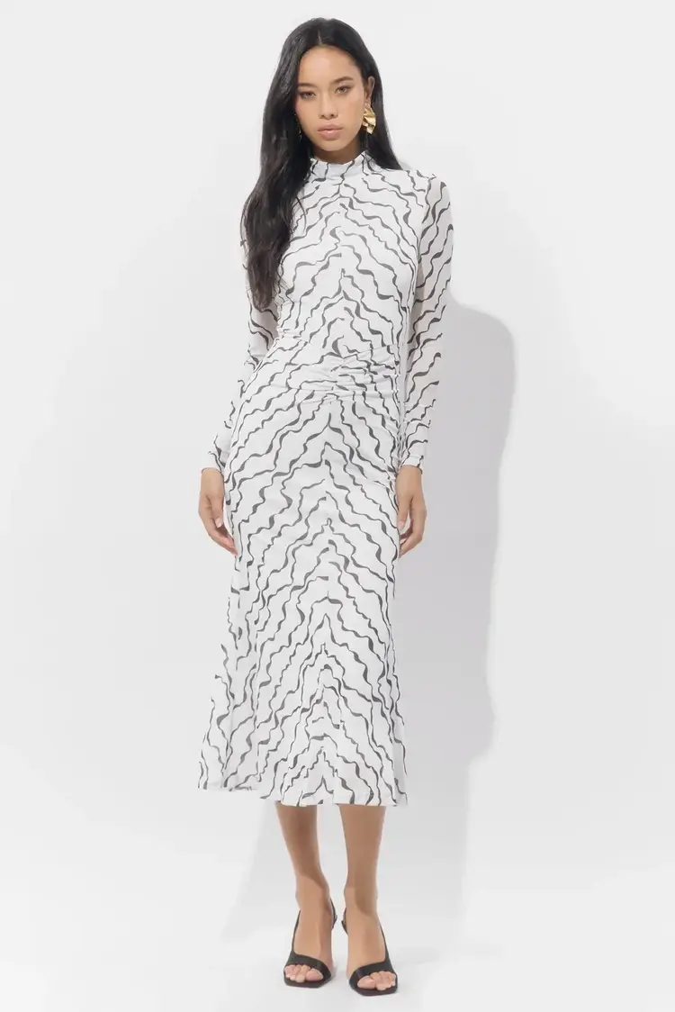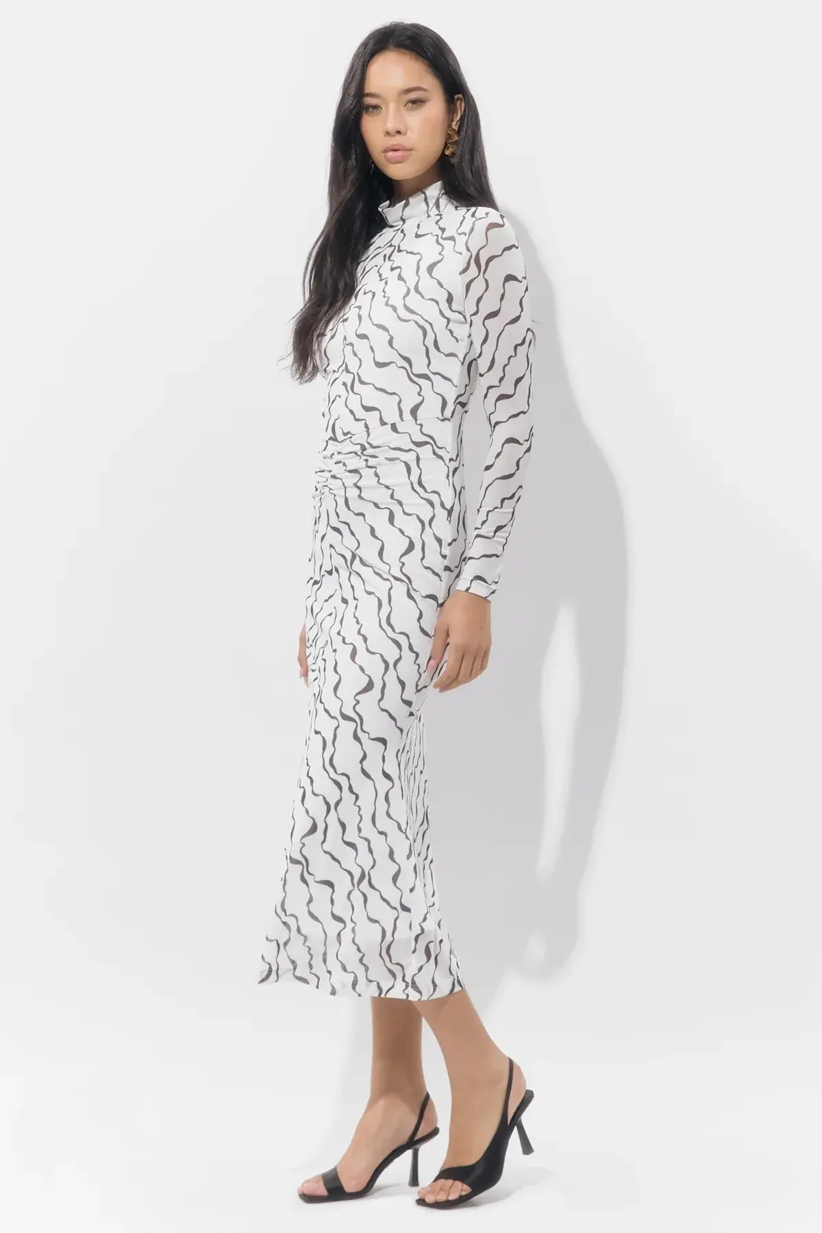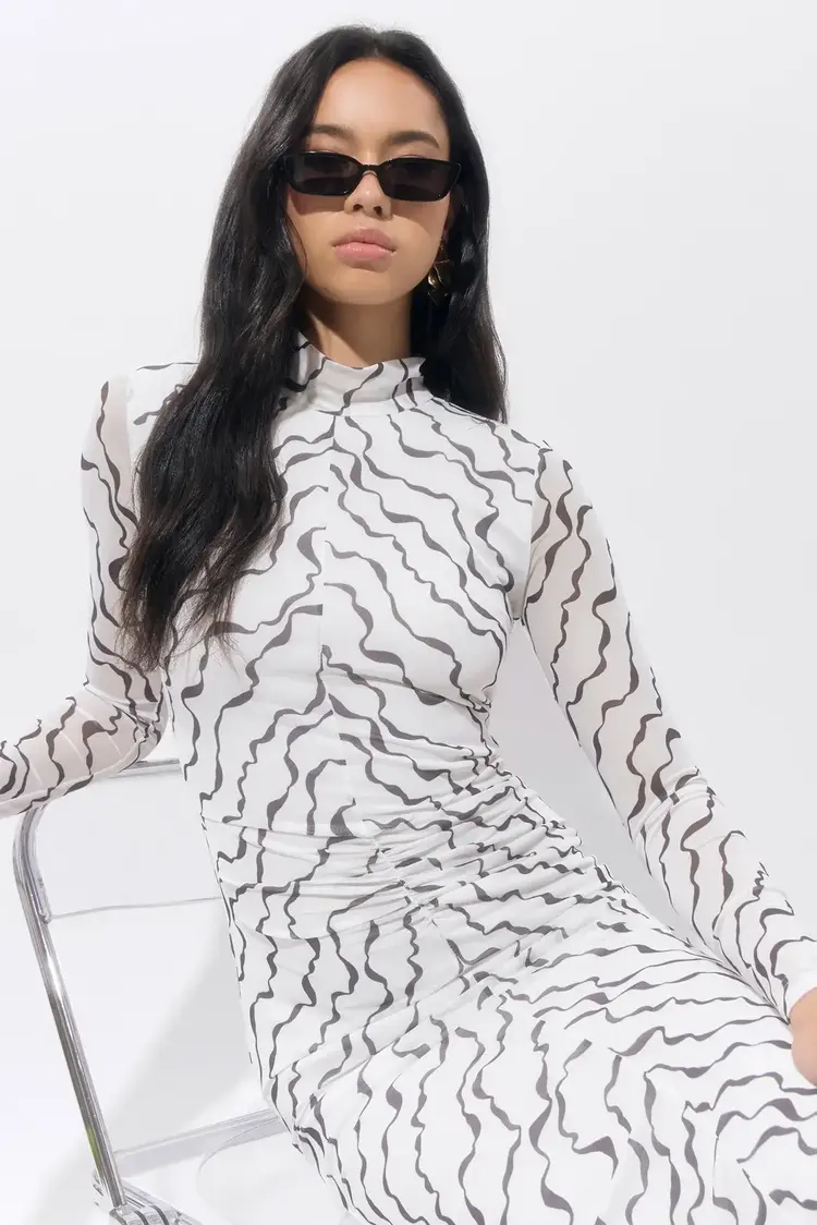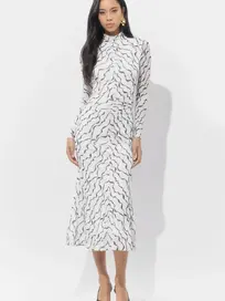 Crafted from a soft printed mesh, the fabric has a comfortable stretch and a delicate texture. The silhouette is typically long and flowing, making it easy to wear while maintaining a refined, elevated look.