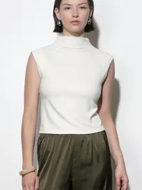 The defining feature is the funnel neck, which stands up slightly to frame the face and provide a polished, contemporary look—an elegant alternative to a standard turtleneck. The neutral ivory color makes it versatile.