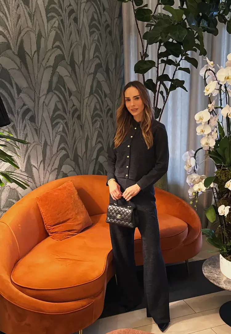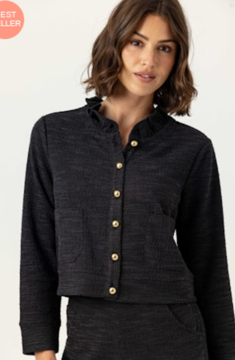 Classic cardigan with patch pockets, a ruffle collar, and elevated gold buttons