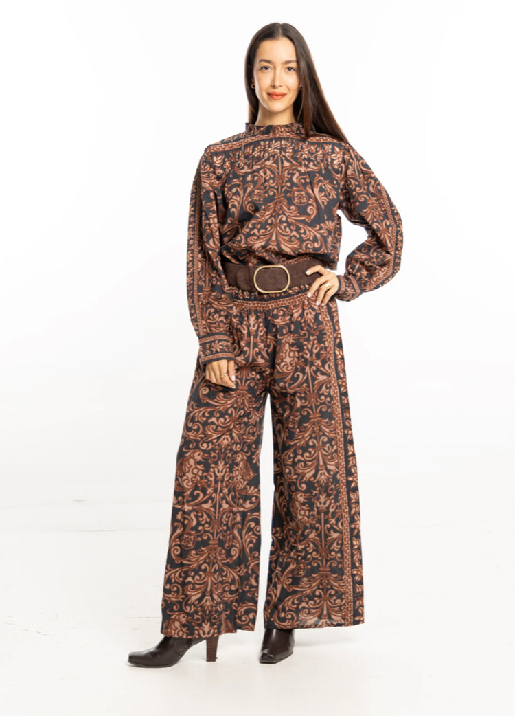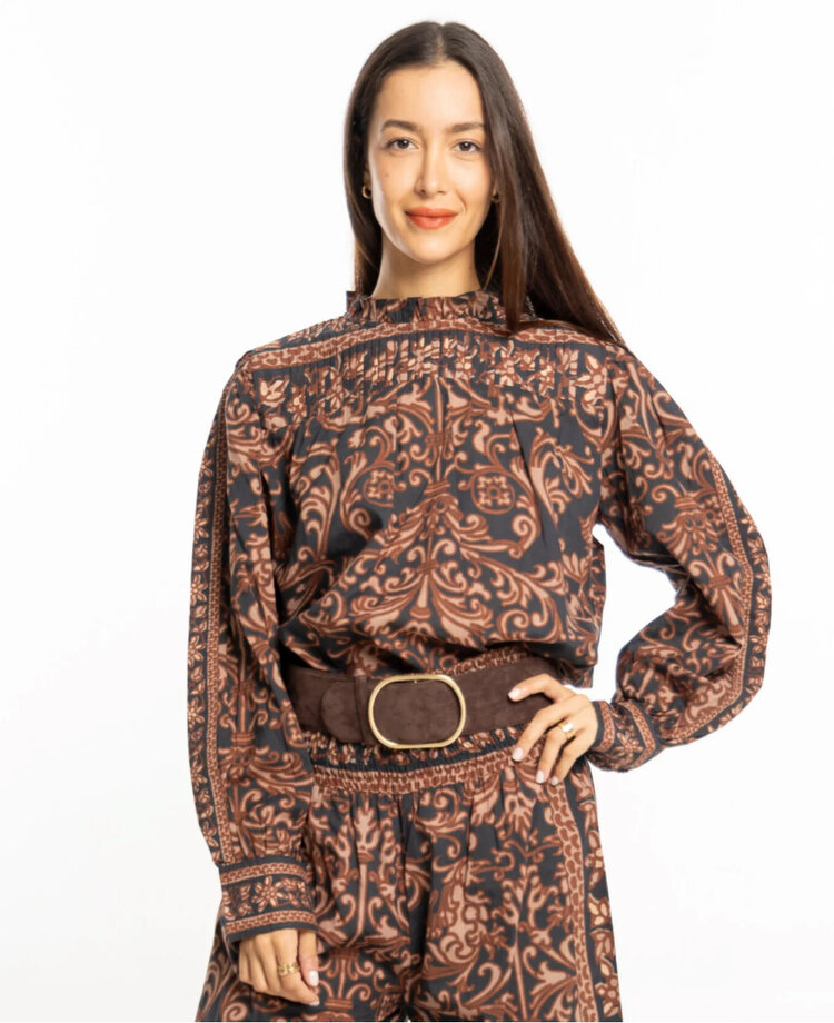 The Malia Top in Espresso is a chic autumn essential, woven in pure cotton in a rich fall-inspired palette. Designed with long puff sleeves, a pleated collar, and delicate frill detail at the neckline, it blends feminine charm with everyday versatility.