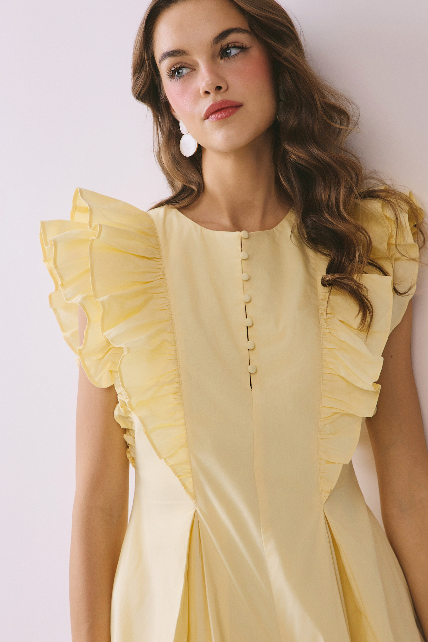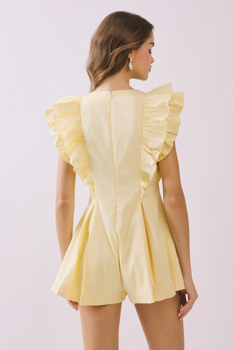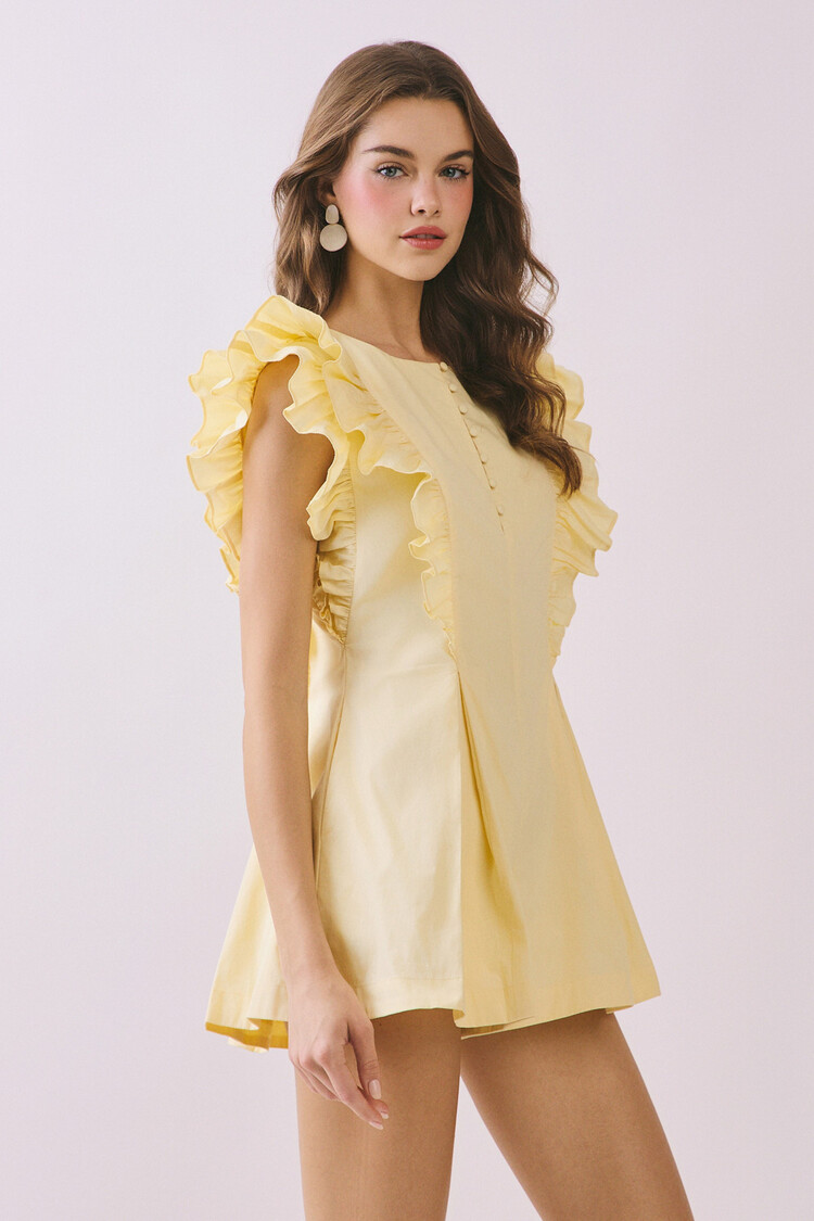 A solid romper featuring dramatic layered ruffle sleeves and a front button detail. Designed with a flared silhouette and side pockets, and finished with a back zipper closure. 100% Cotton