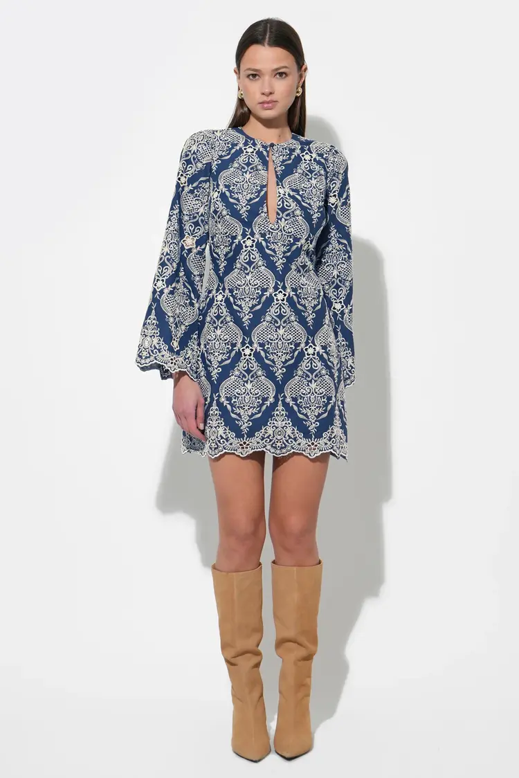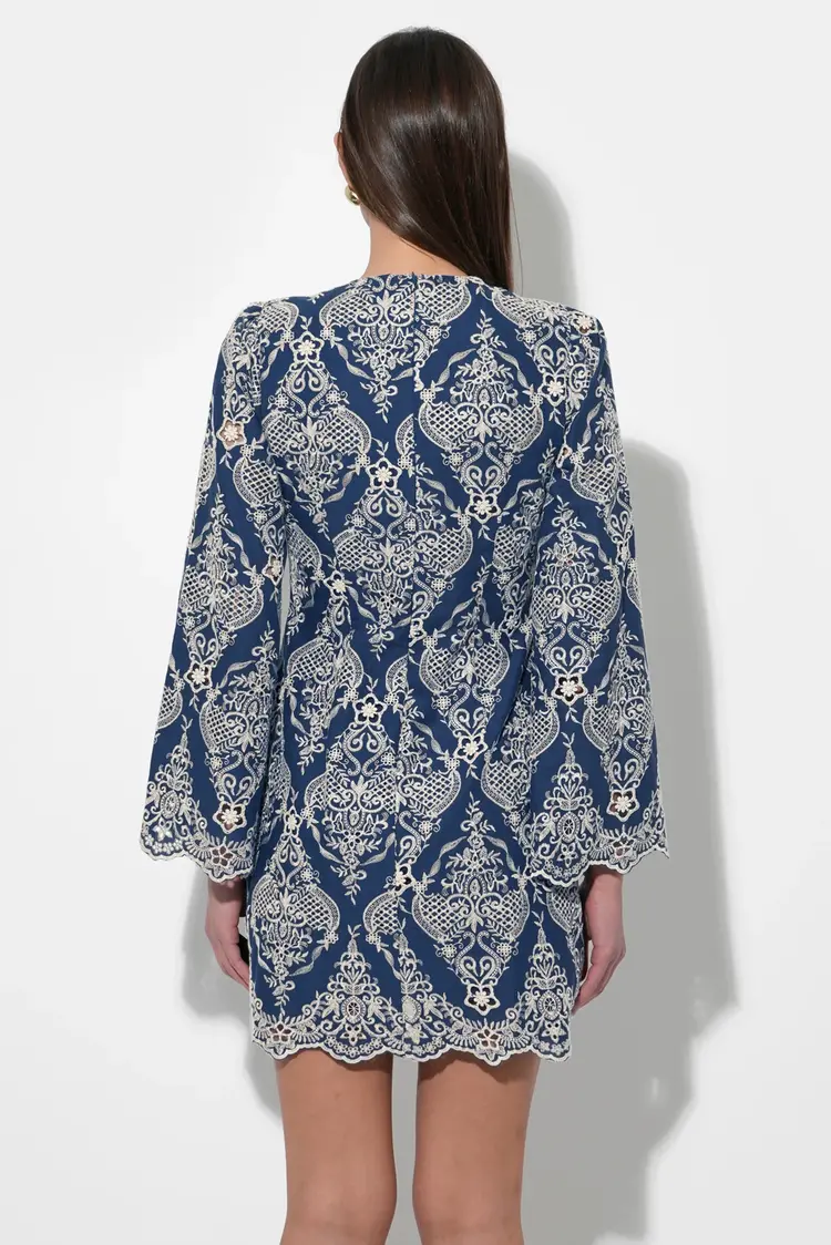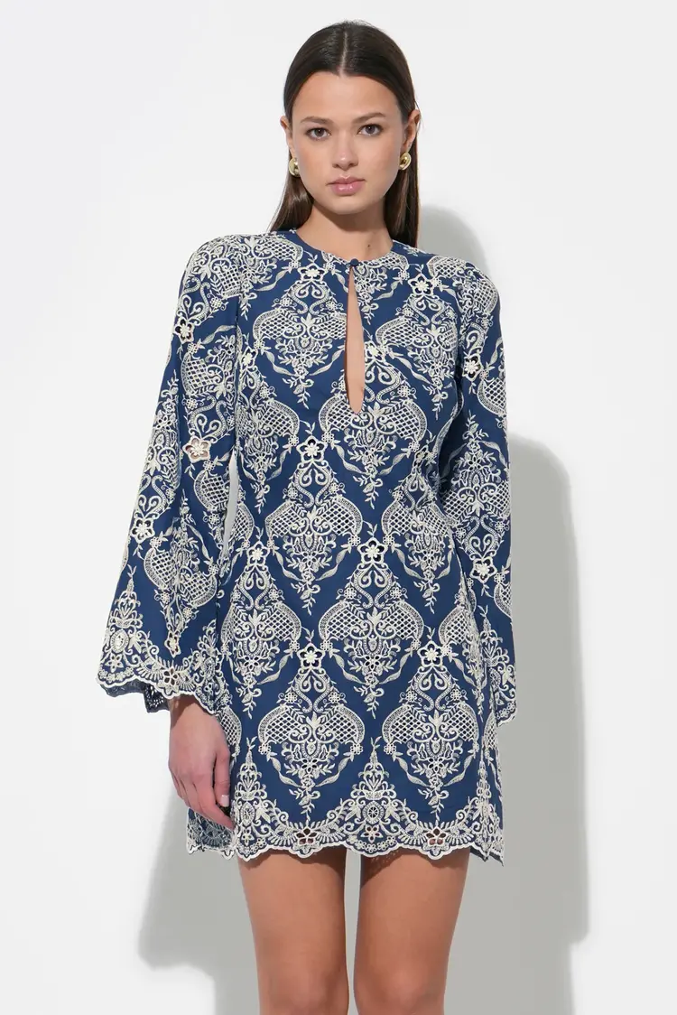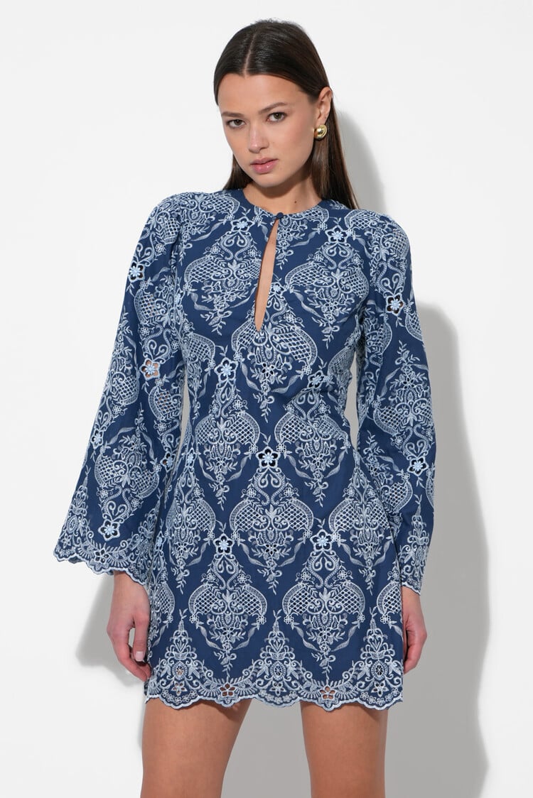 • It is made from a rich navy blue fabric that is completely covered in a detailed, off-white lace or embroidery pattern. The dress features a high neckline with a delicate keyhole cutout at the chest, adding a touch of allure.