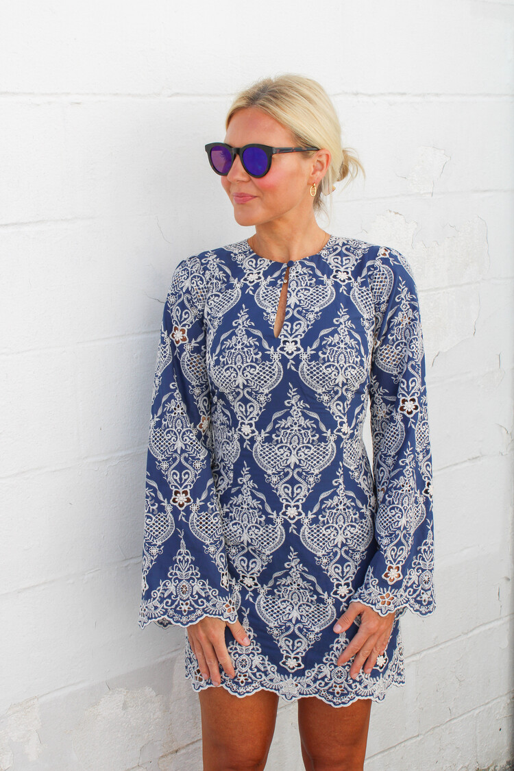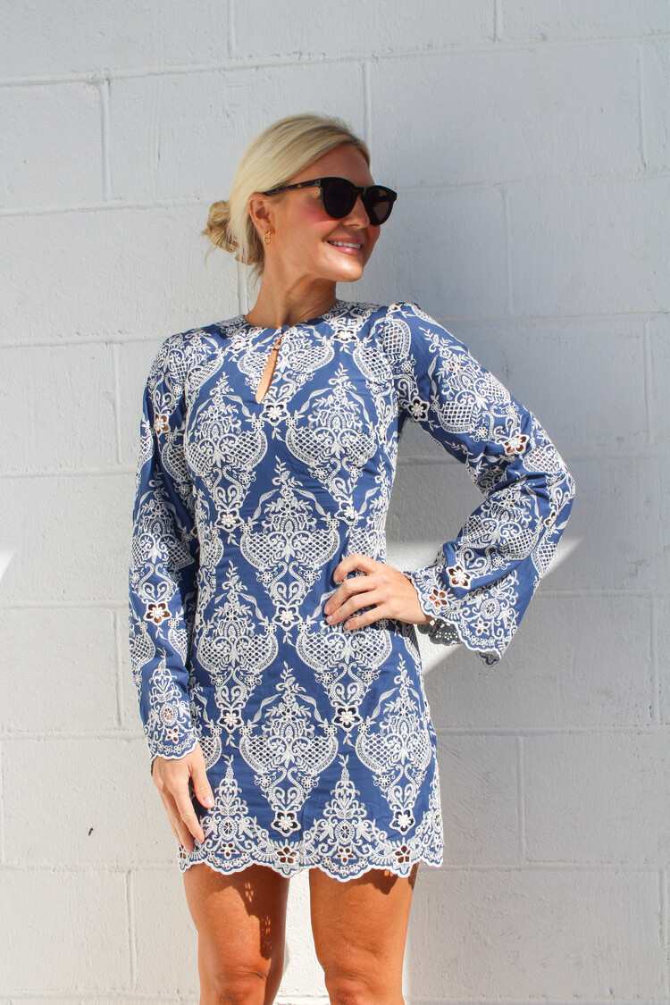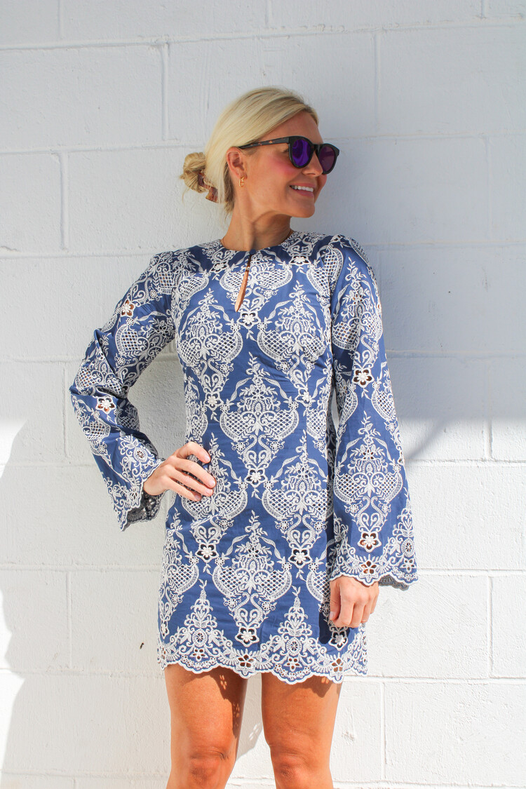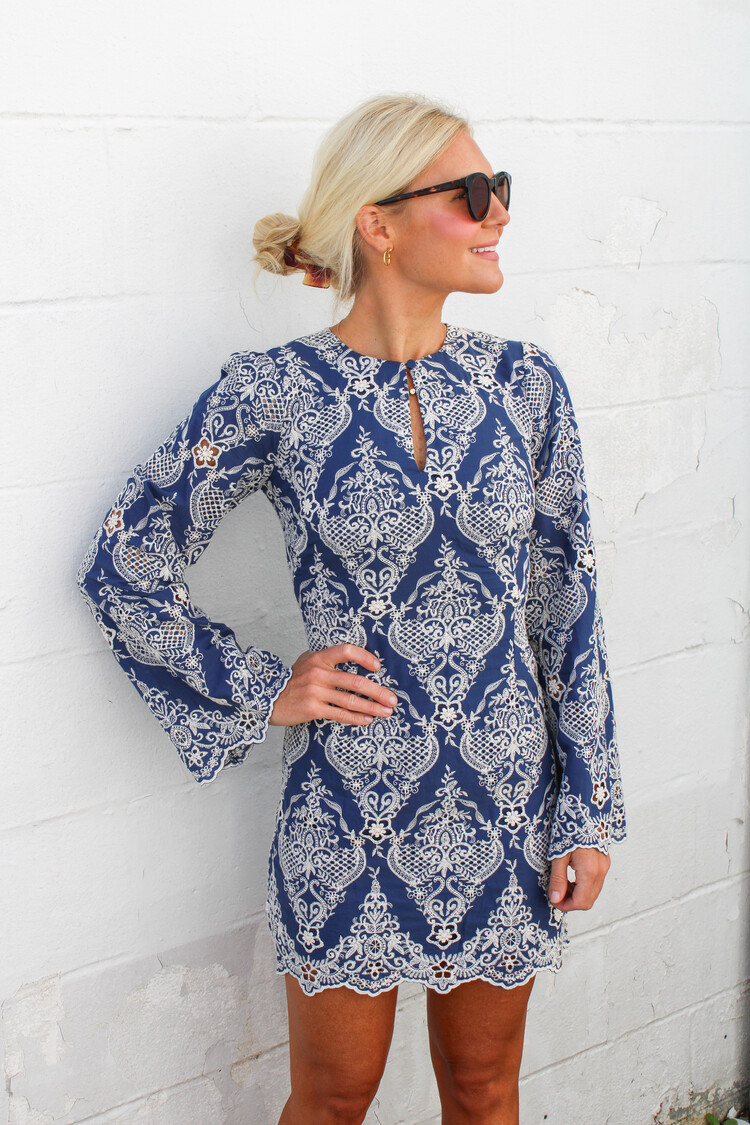• It is made from a rich navy blue fabric that is completely covered in a detailed, off-white lace or embroidery pattern. The dress features a high neckline with a delicate keyhole cutout at the chest, adding a touch of allure.