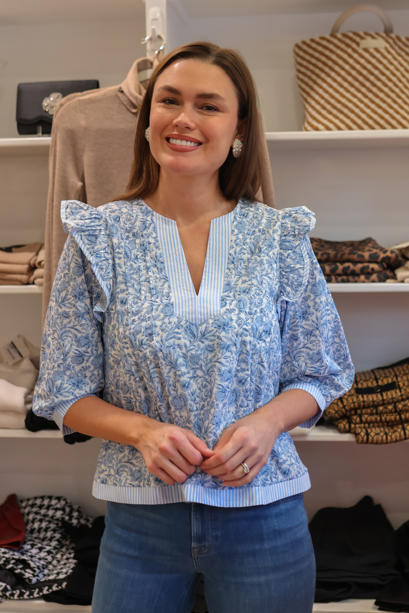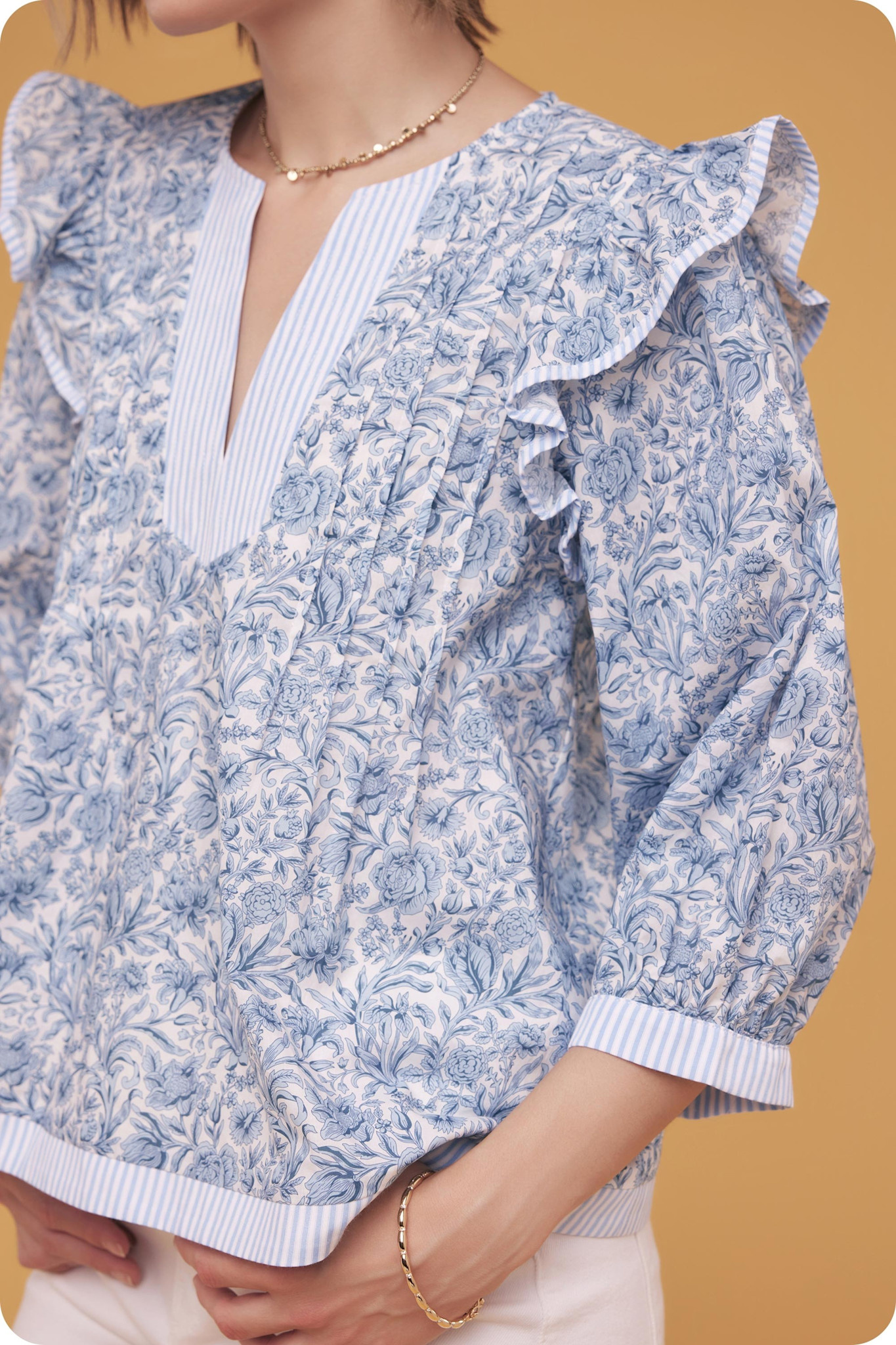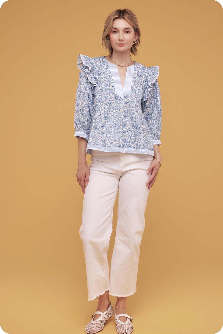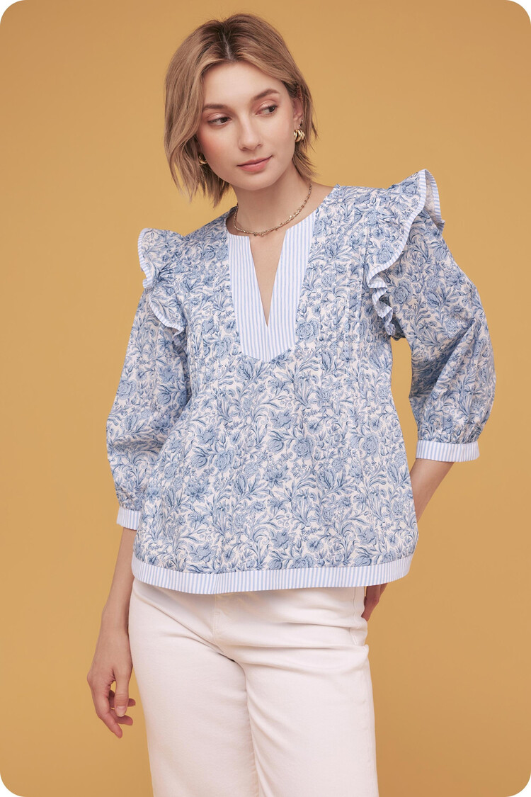 • Stripe contrast 3/4 sleeve pintuck blouse in a floral print on cotton poplin fabric. This top features contrast striped fabric, pin-tuck detail at front, a classic V neck, ruffle detail at shoulder, 3/4 sleeve with banded cuff, and a relaxed fit.