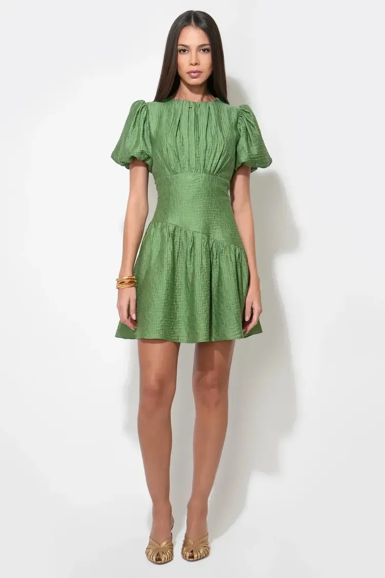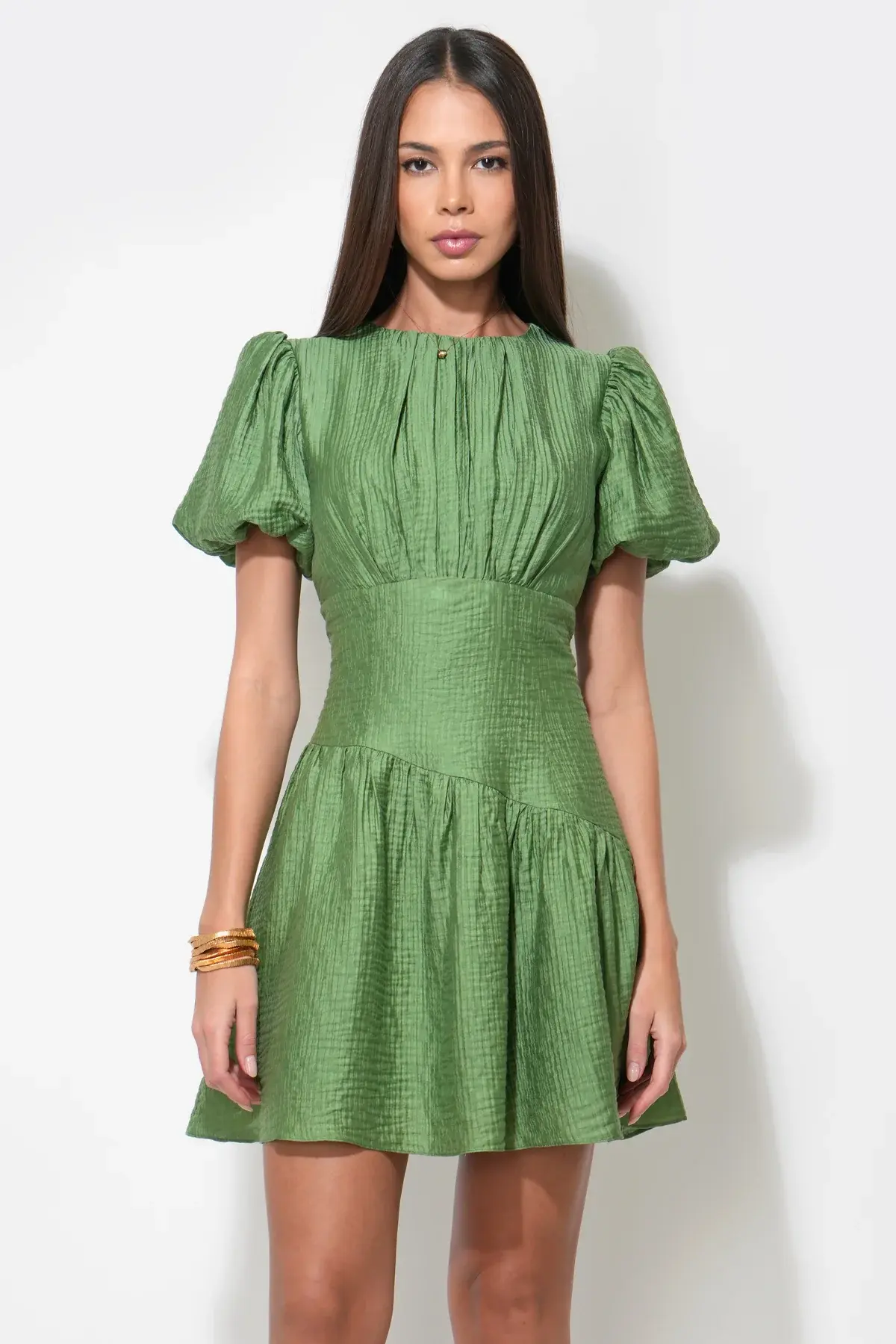 • The design is defined by its striking asymmetric waistband, which adds architectural interest and defines the figure in a unique, contemporary way. The dress likely has a structured or tailored fit through the bodice, culminating in a playful dress length