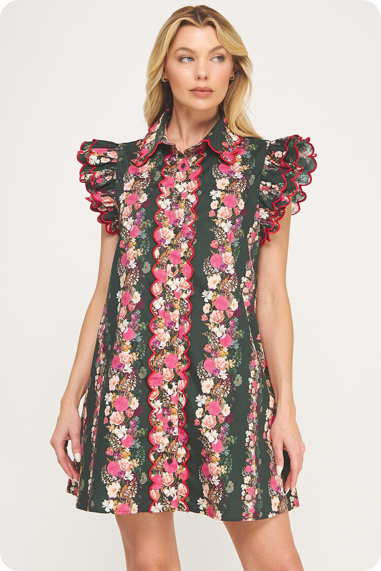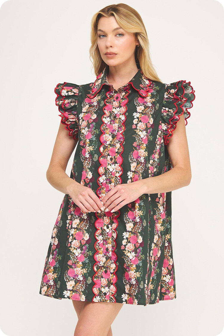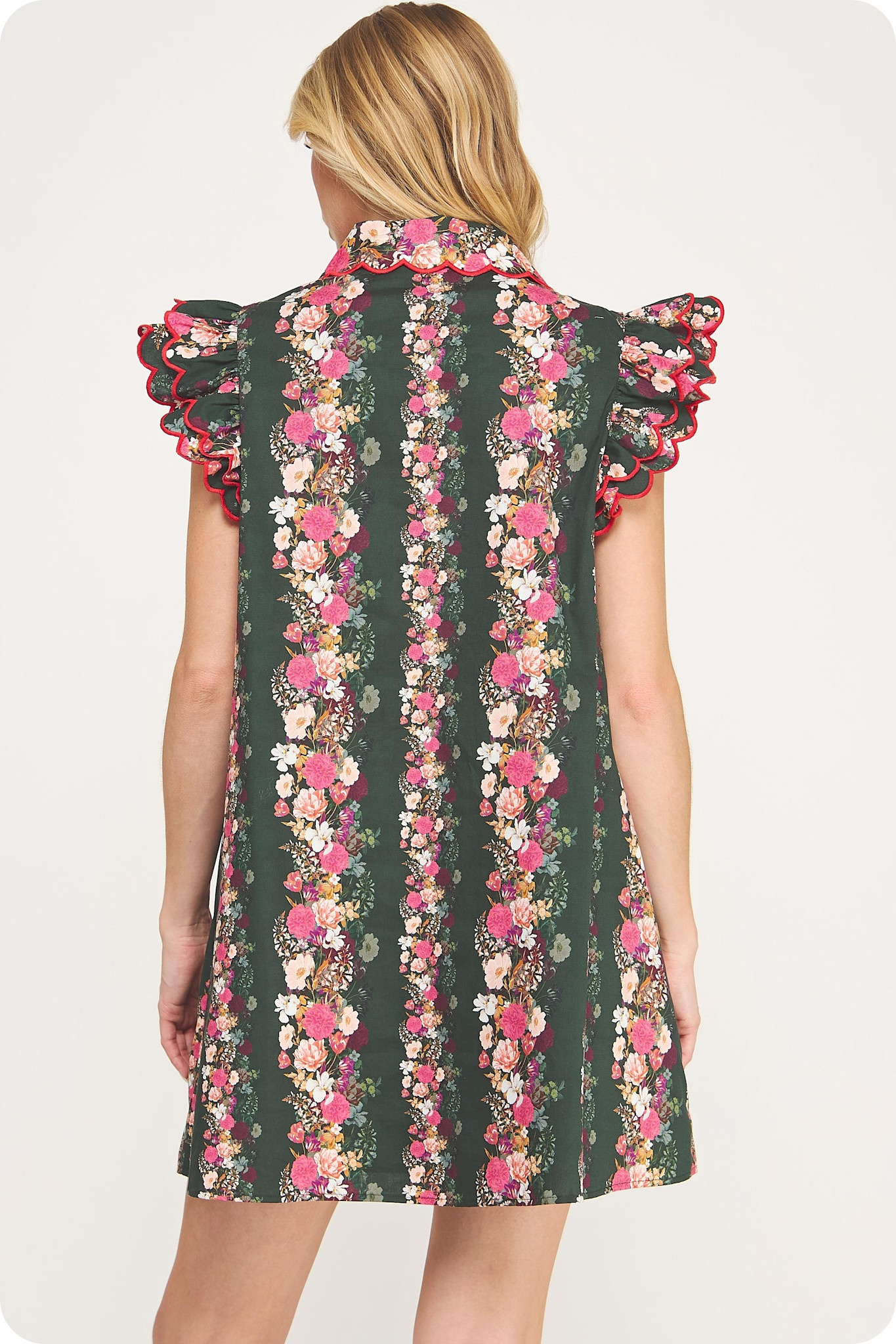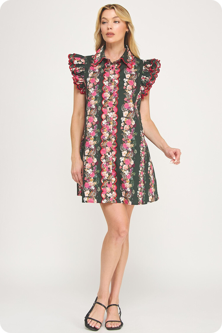 Ruffle scallop embroidery mini dress in an exclusive floral stripe print on stretch poplin fabric. This relaxed shift shirt mini dress features intricate contrast color scallop embroidery throughout, side pockets, ruffled flutter short sleeve, and lining.