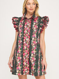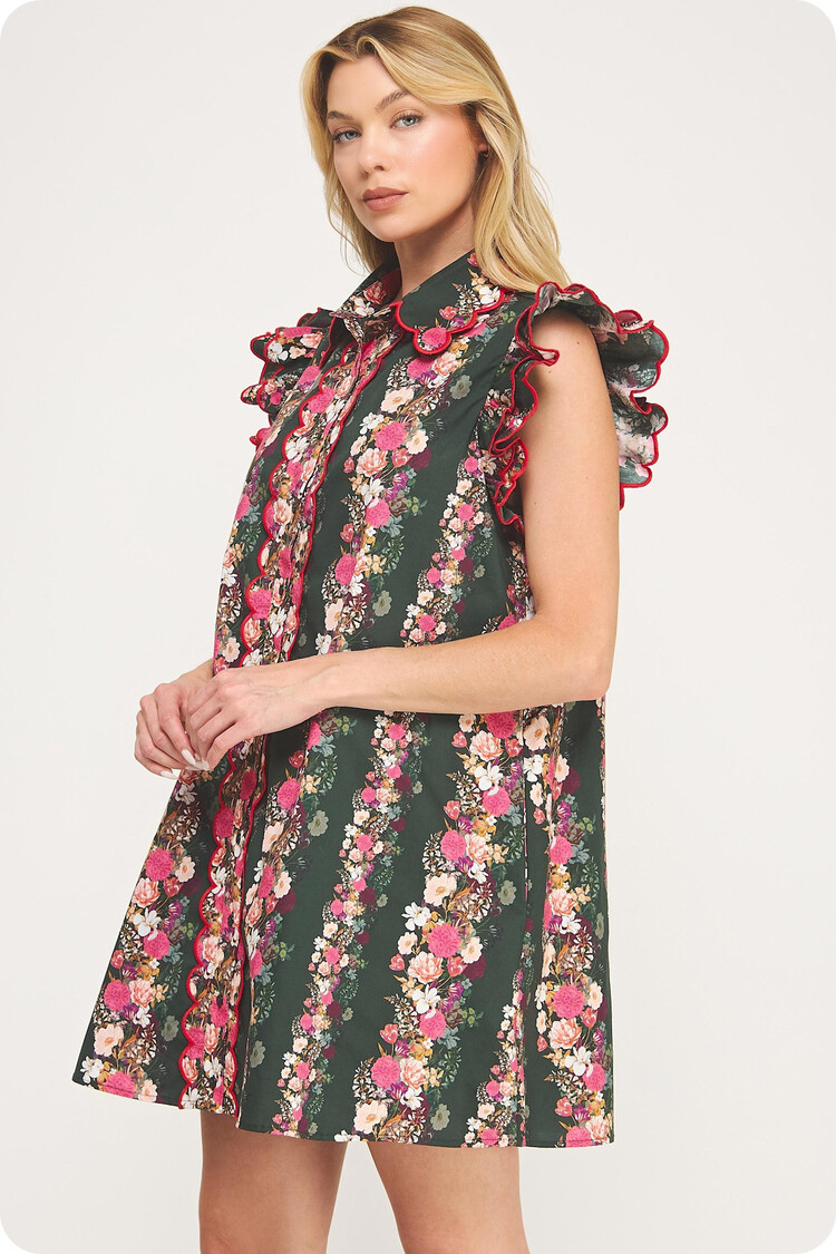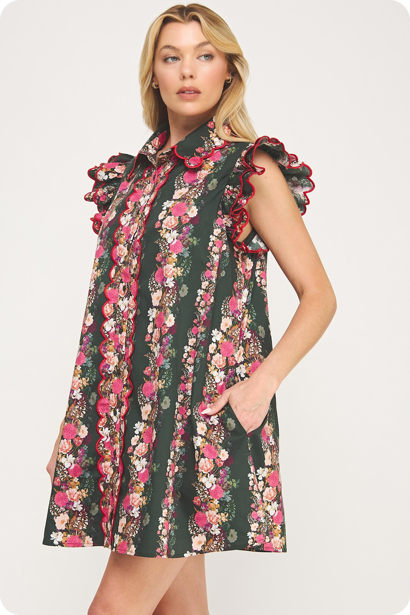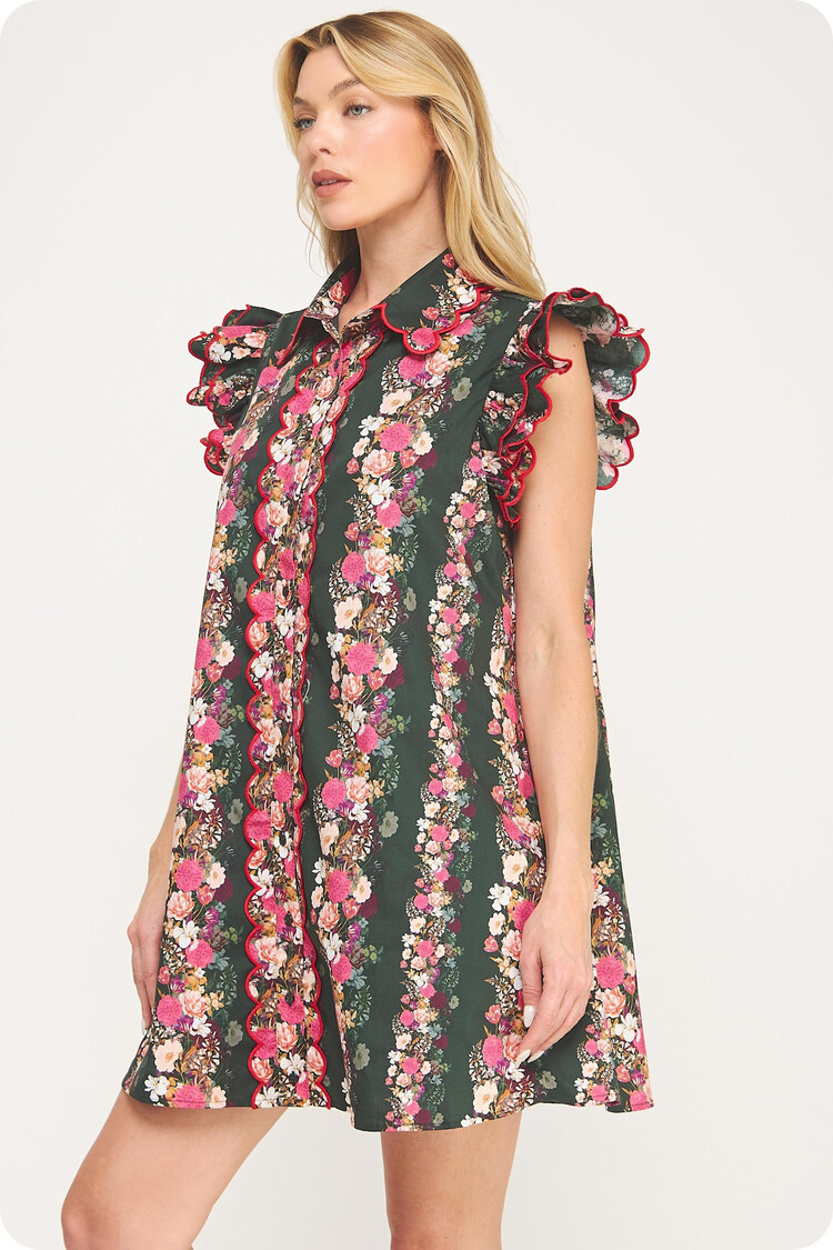Ruffle scallop embroidery mini dress in an exclusive floral stripe print on stretch poplin fabric. This relaxed shift shirt mini dress features intricate contrast color scallop embroidery throughout, side pockets, ruffled flutter short sleeve, and lining.
