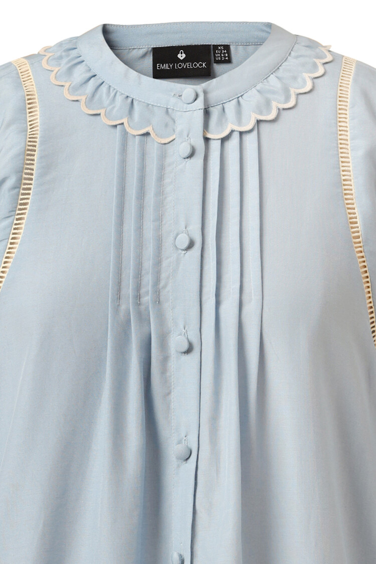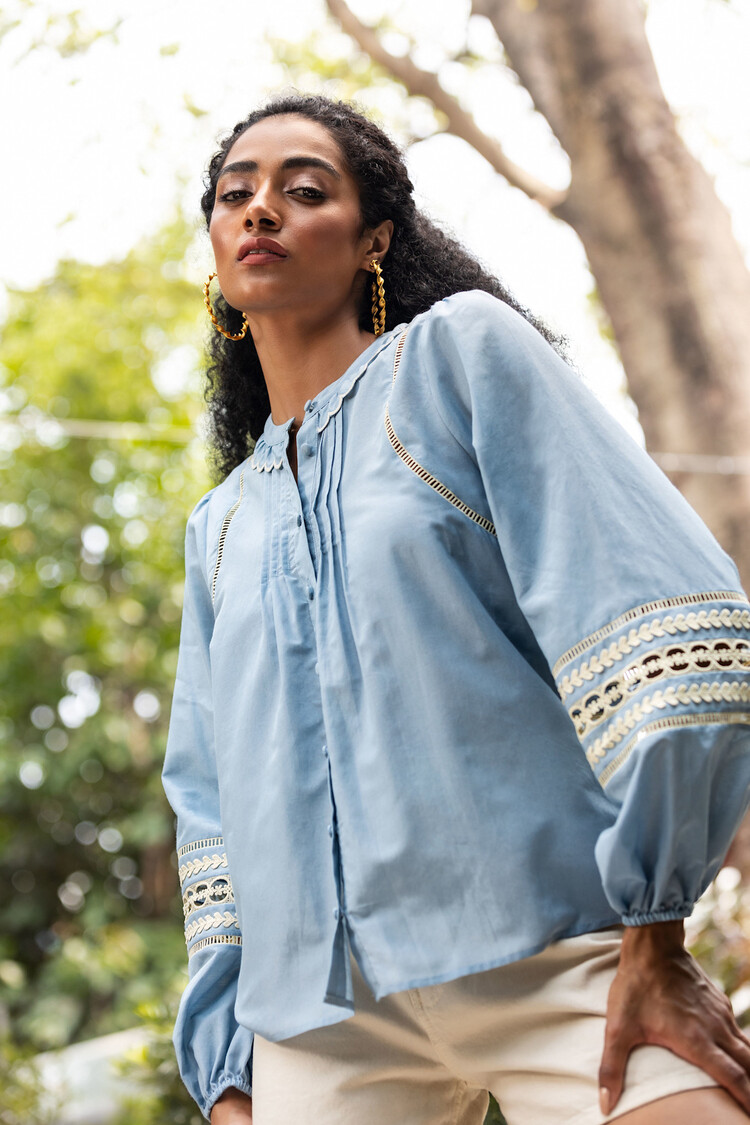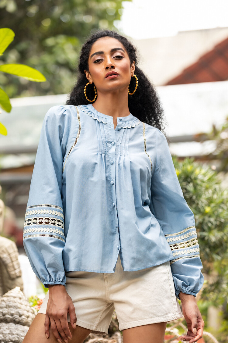 This blouse in chambray blue features elastic cuffs for comfortable movement and statement sleeves with lace trim details for a touch of elegance. The scallop ruffle trim collar adds a feminine touch, while fabric covered buttons provide a polished finish