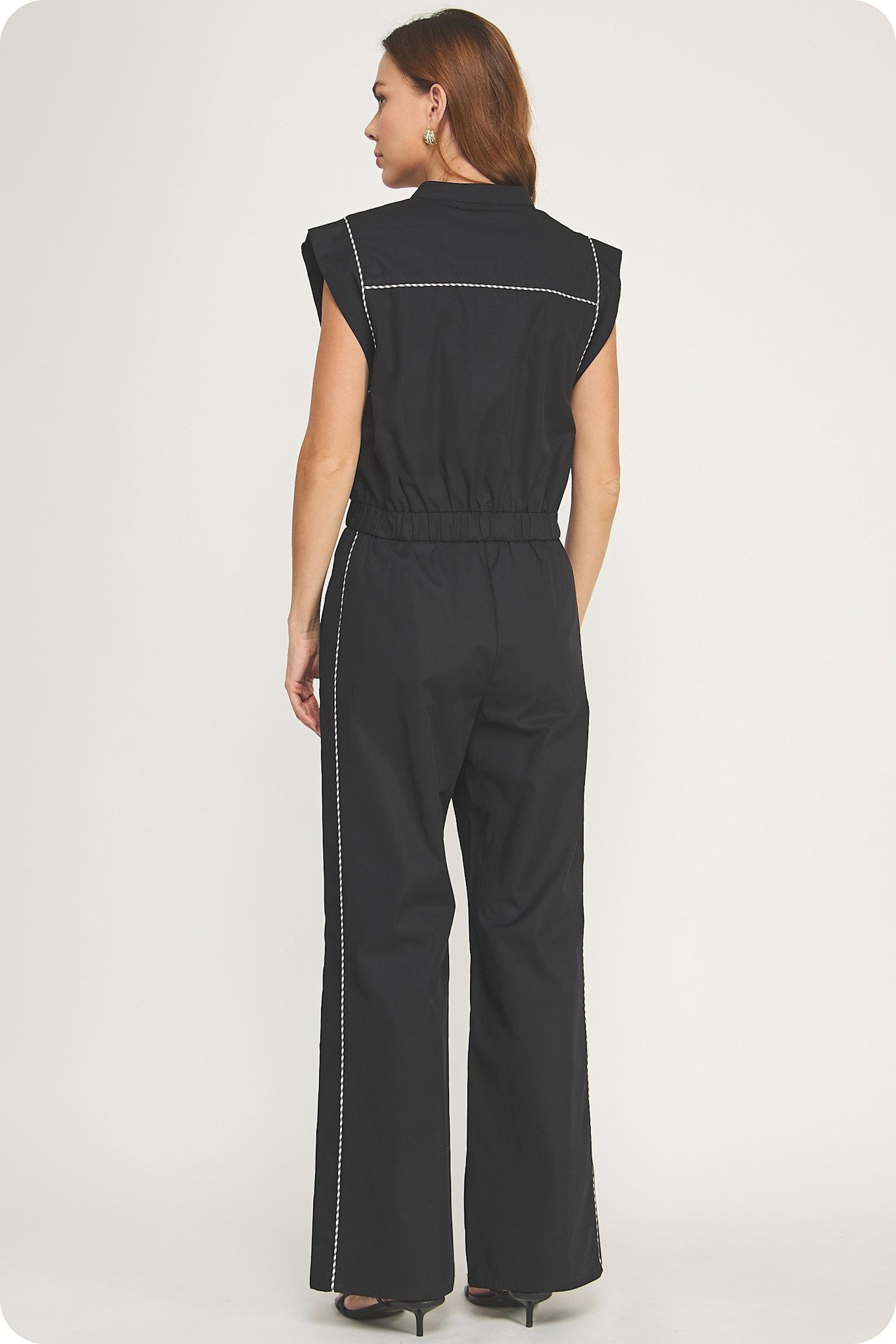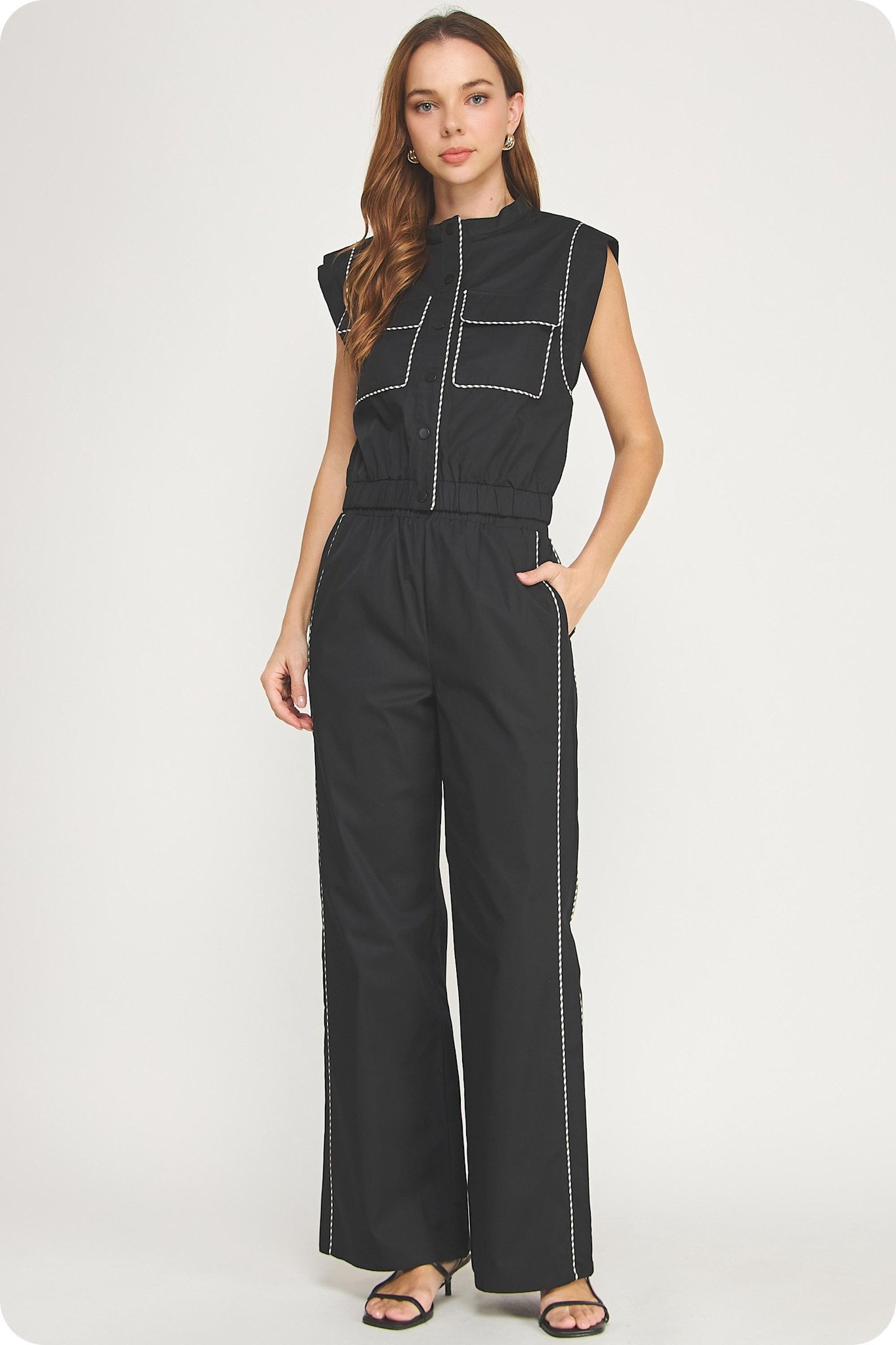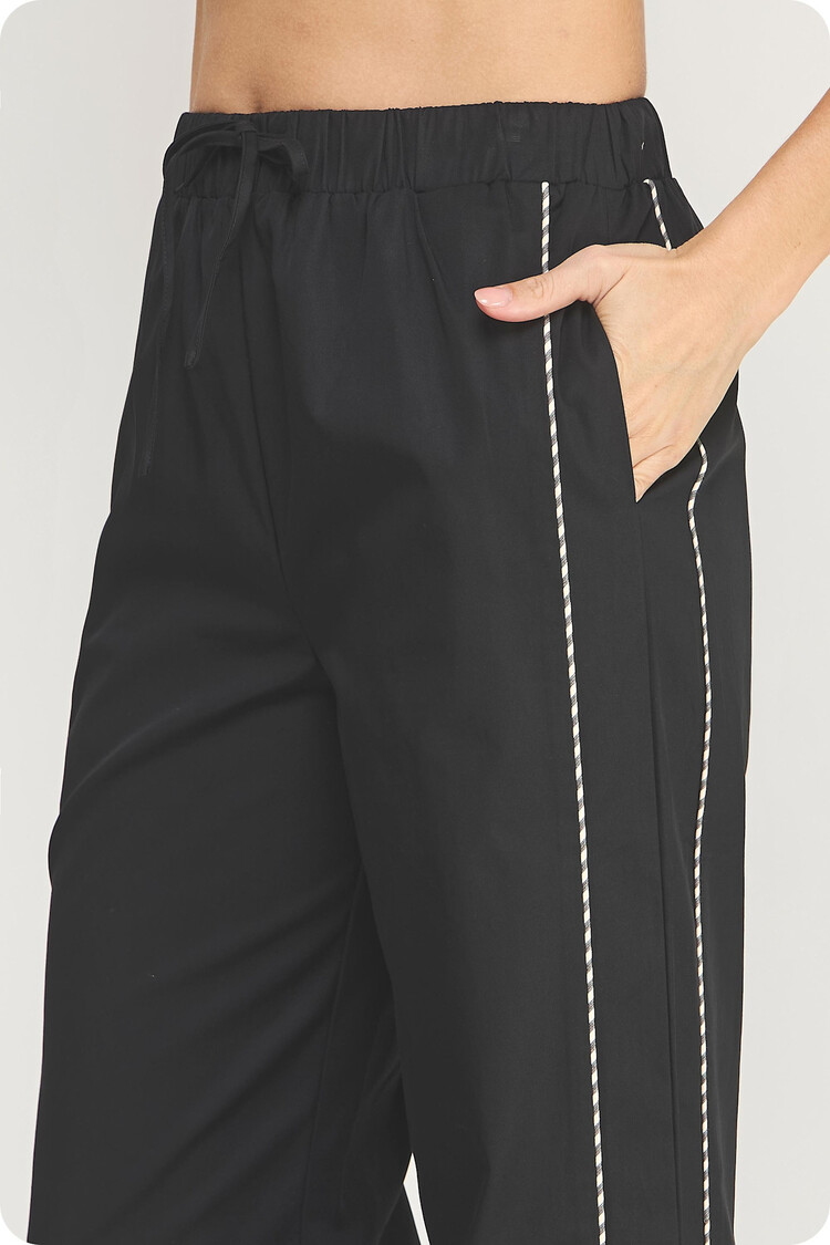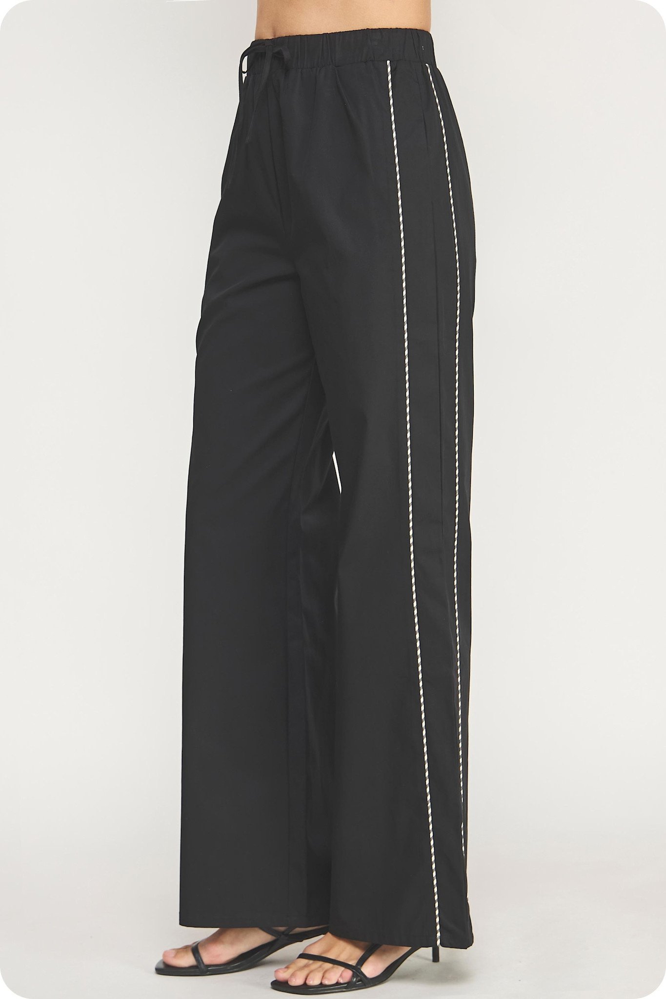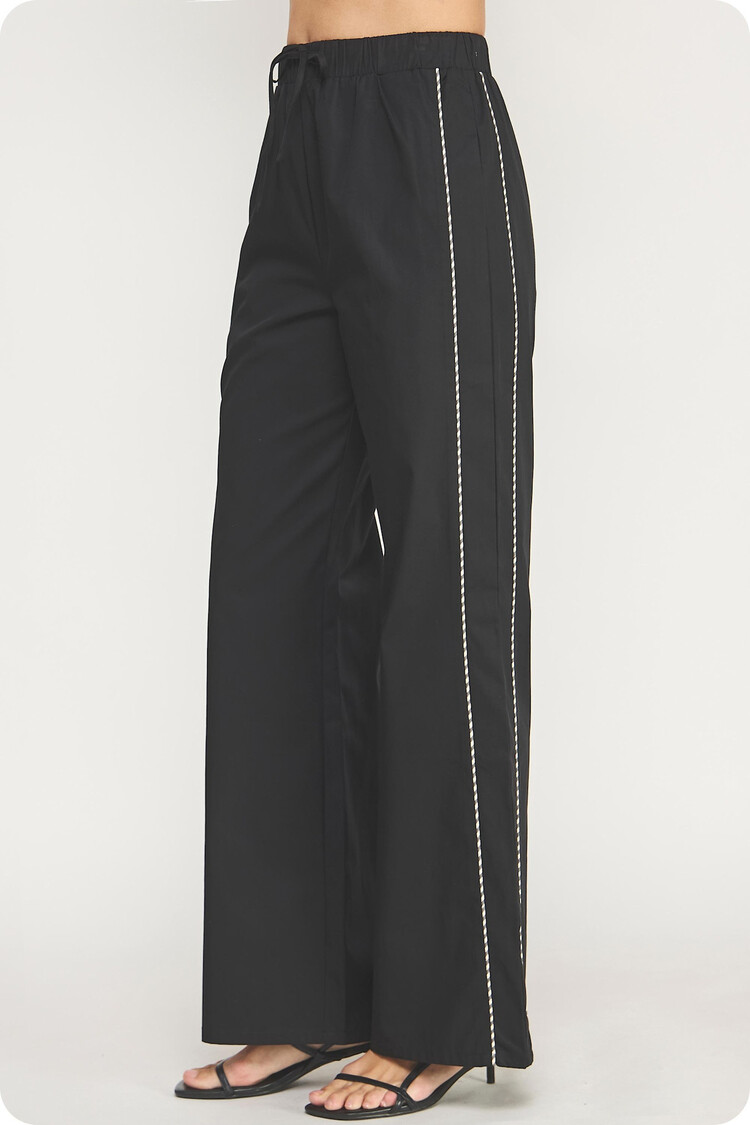 • Contrast stripe piping detail wide leg pants in cotton lyocell blend poplin fabric. This style features stripe piping at side, elastic waist with adjustable drawstring tie, side pockets, and straight wide leg. It can be made into a set with vest top