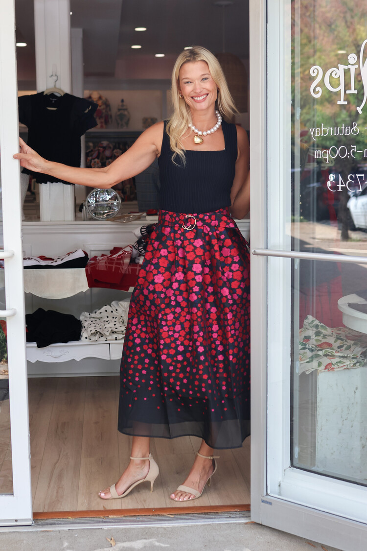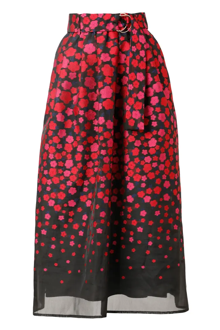 • Crafted from taffeta, this maxi skirt features a cascading floral print in vibrant reds and pinks that pop against a deep black background. Pair with a fitted black top and heels for a night out or style down for daytime.
