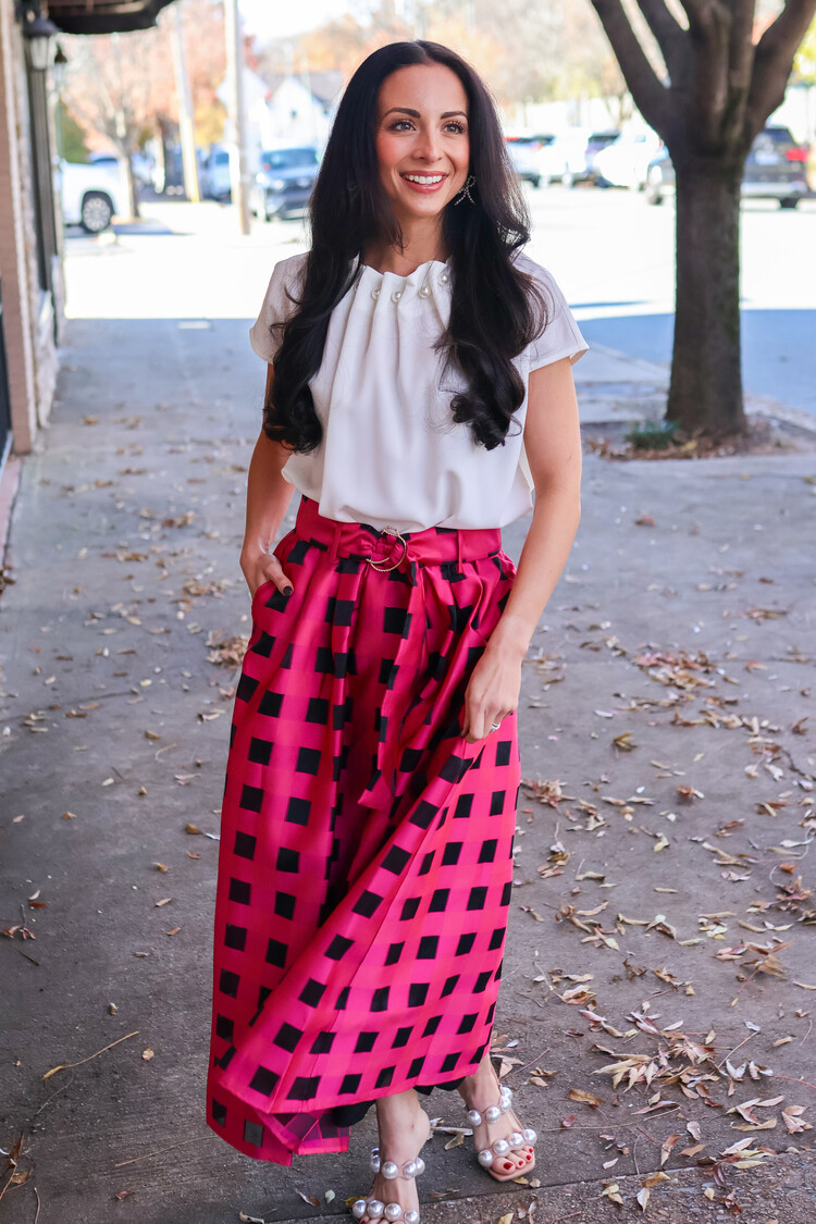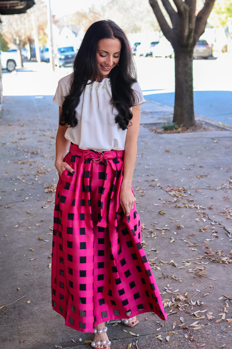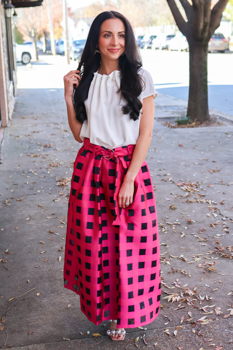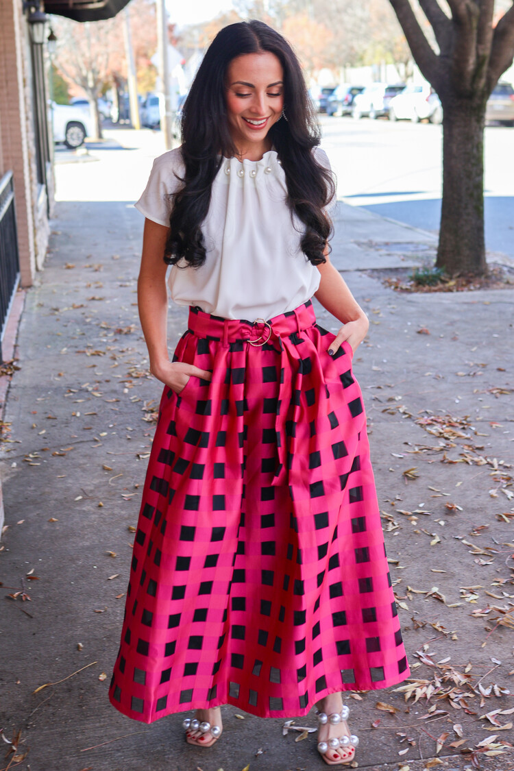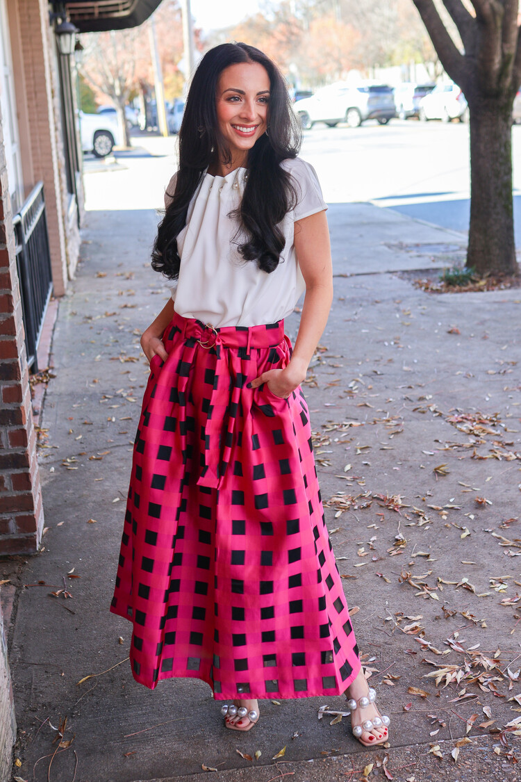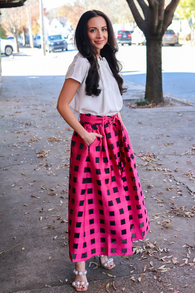This beautiful skirt in taffeta is gonna make you fall in love with skirts all over. Full enough for a good swish when you walk and move but not so much to overwhelm your frame. A high waist with a belt and a structured skirt gives you a great shape.